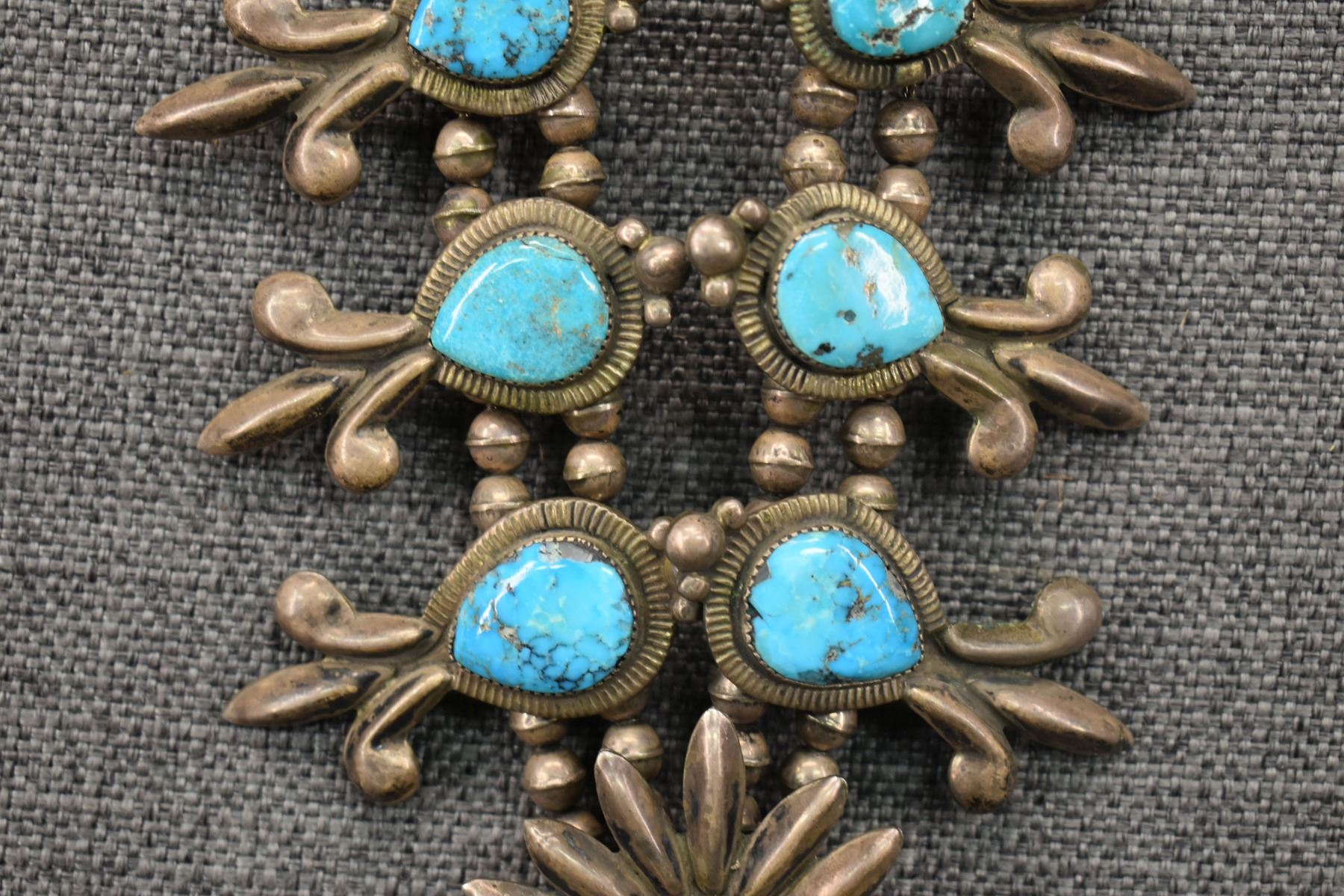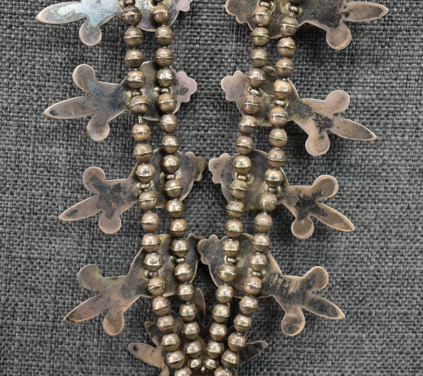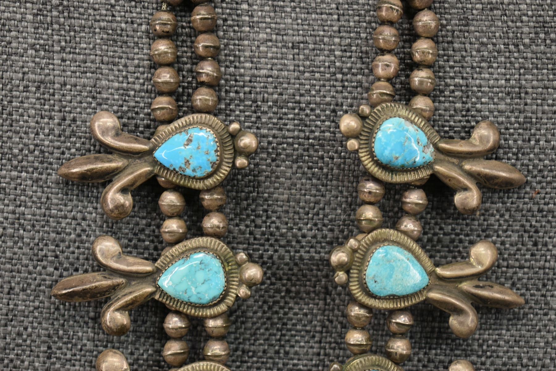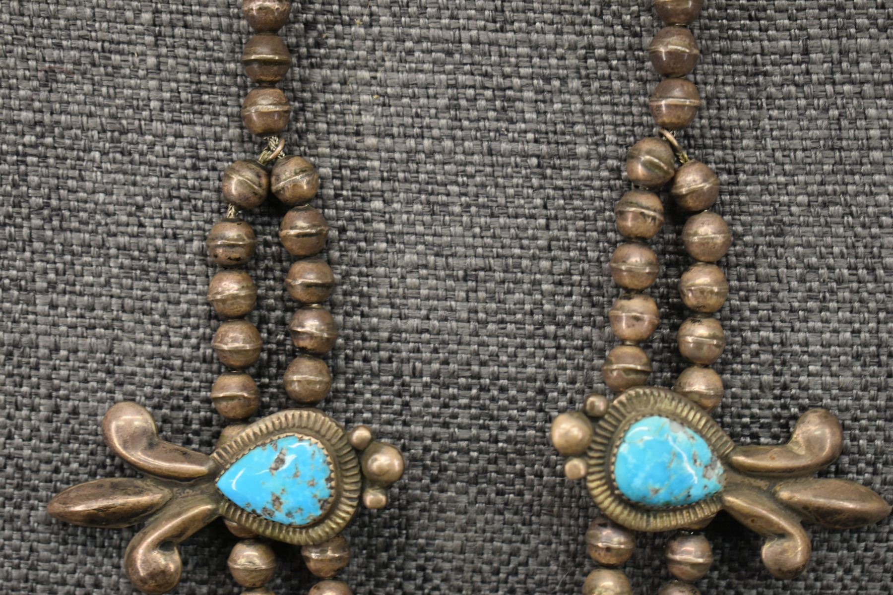 1950's Navajo, sterling silver beads28" long with sand cast blossoms with turquoise 1" x 2.25" and matching Naja 4.25" x 3.5" total weight 258 grams