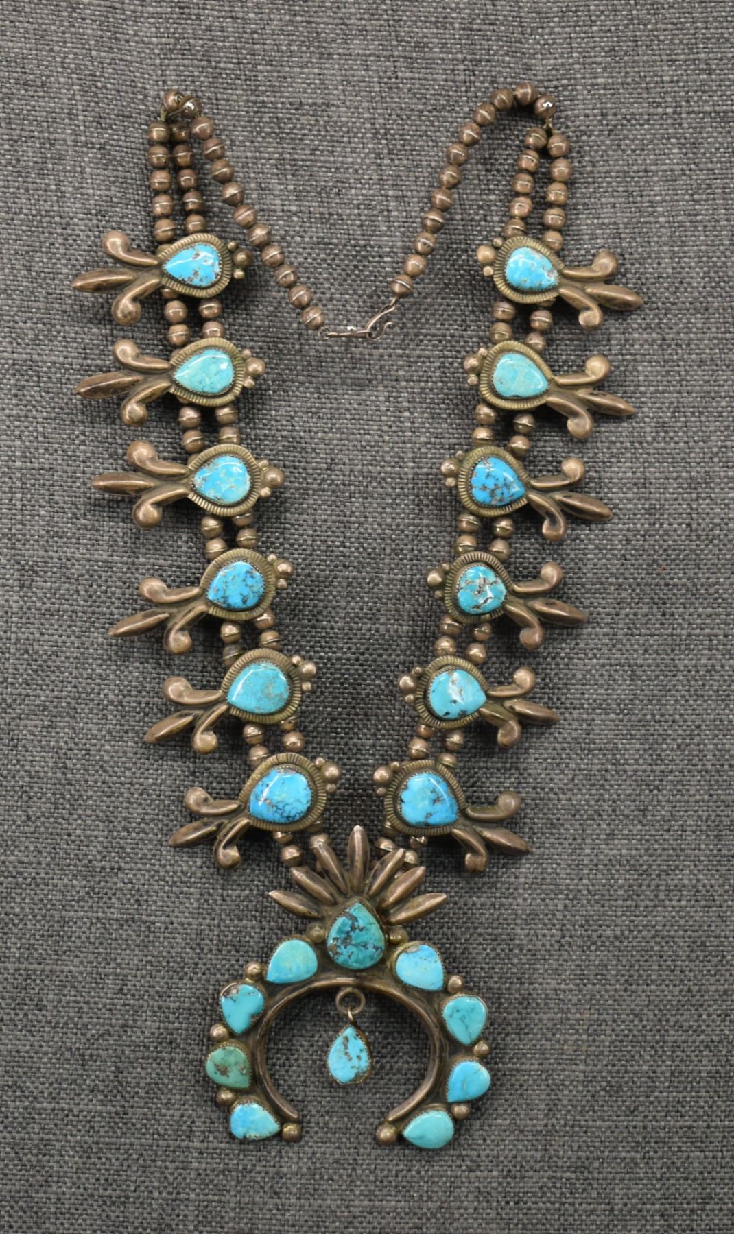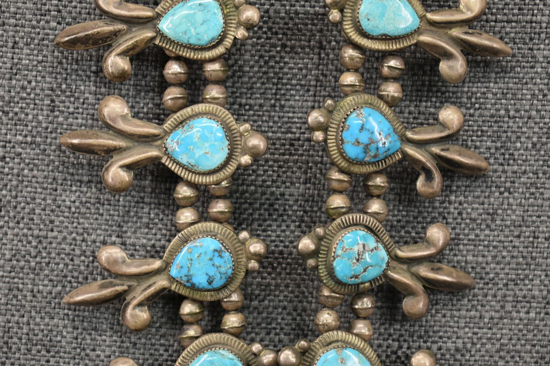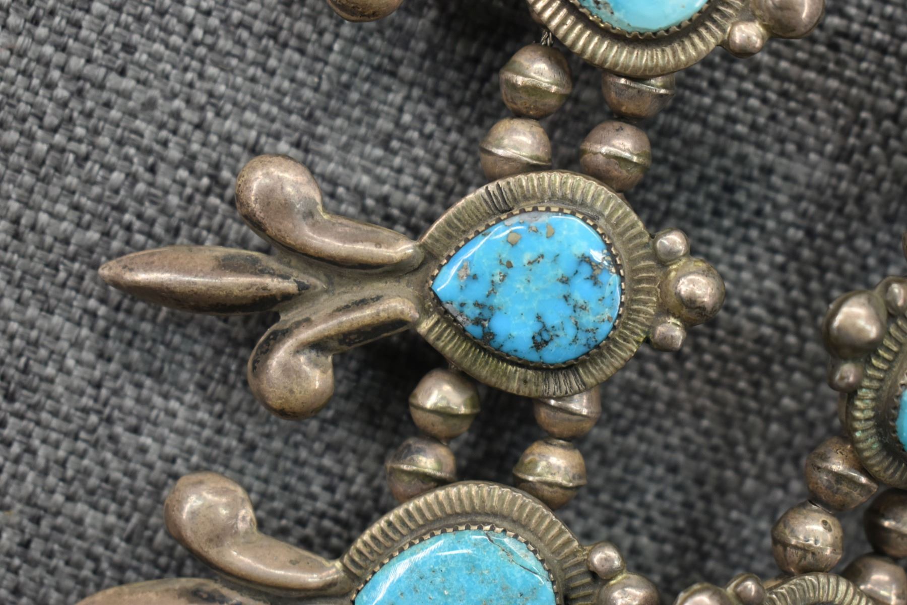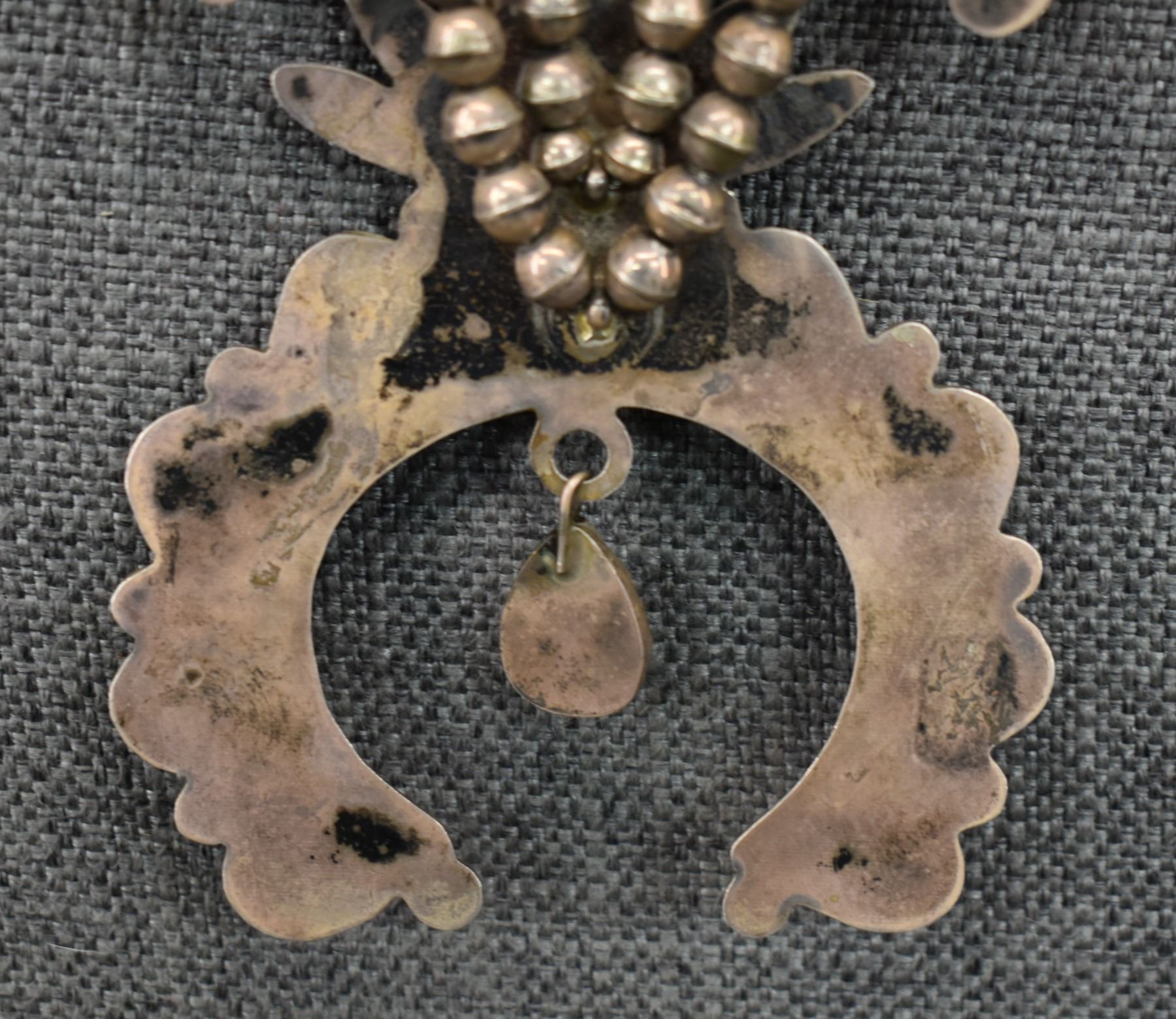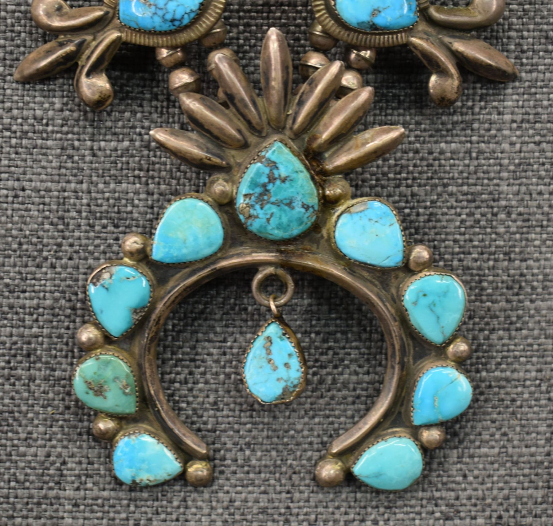 1950's Navajo, sterling silver beads28" long with sand cast blossoms with turquoise 1" x 2.25" and matching Naja 4.25" x 3.5" total weight 258 grams