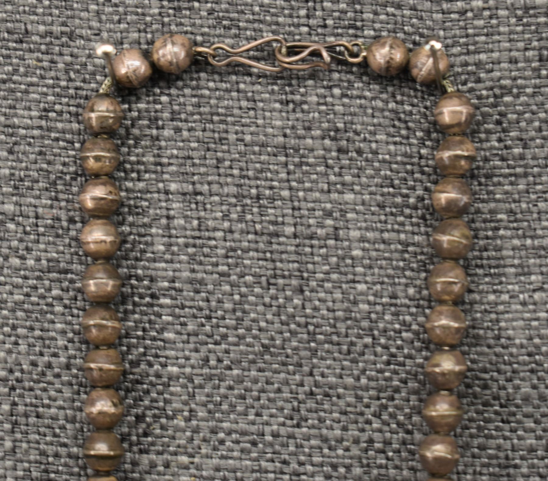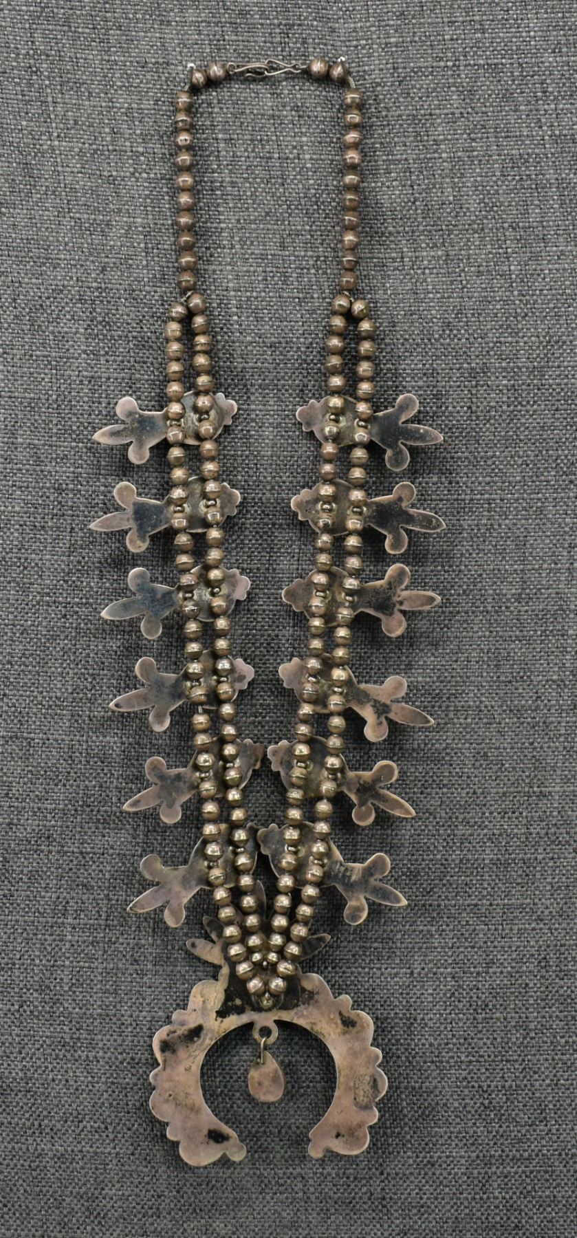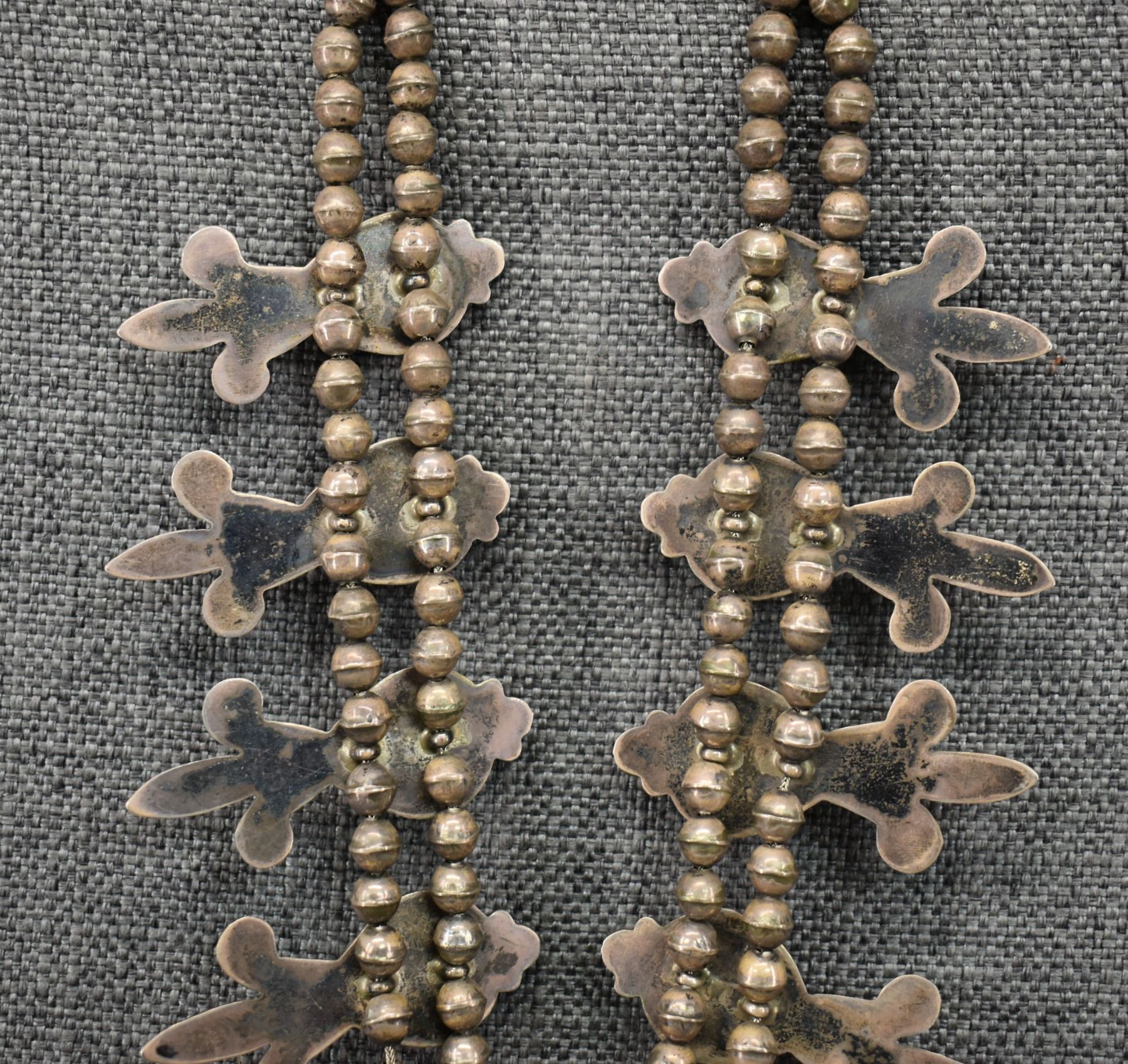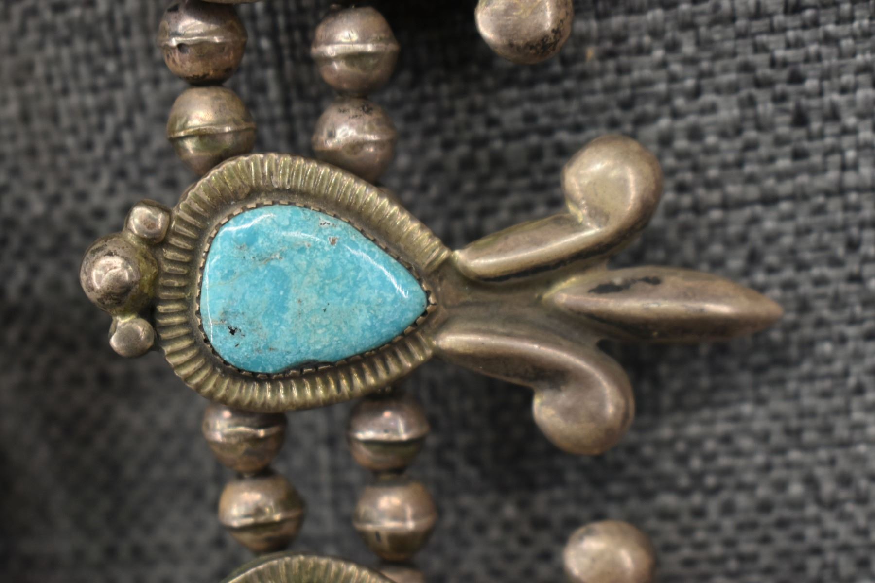 1950's Navajo, sterling silver beads28" long with sand cast blossoms with turquoise 1" x 2.25" and matching Naja 4.25" x 3.5" total weight 258 grams