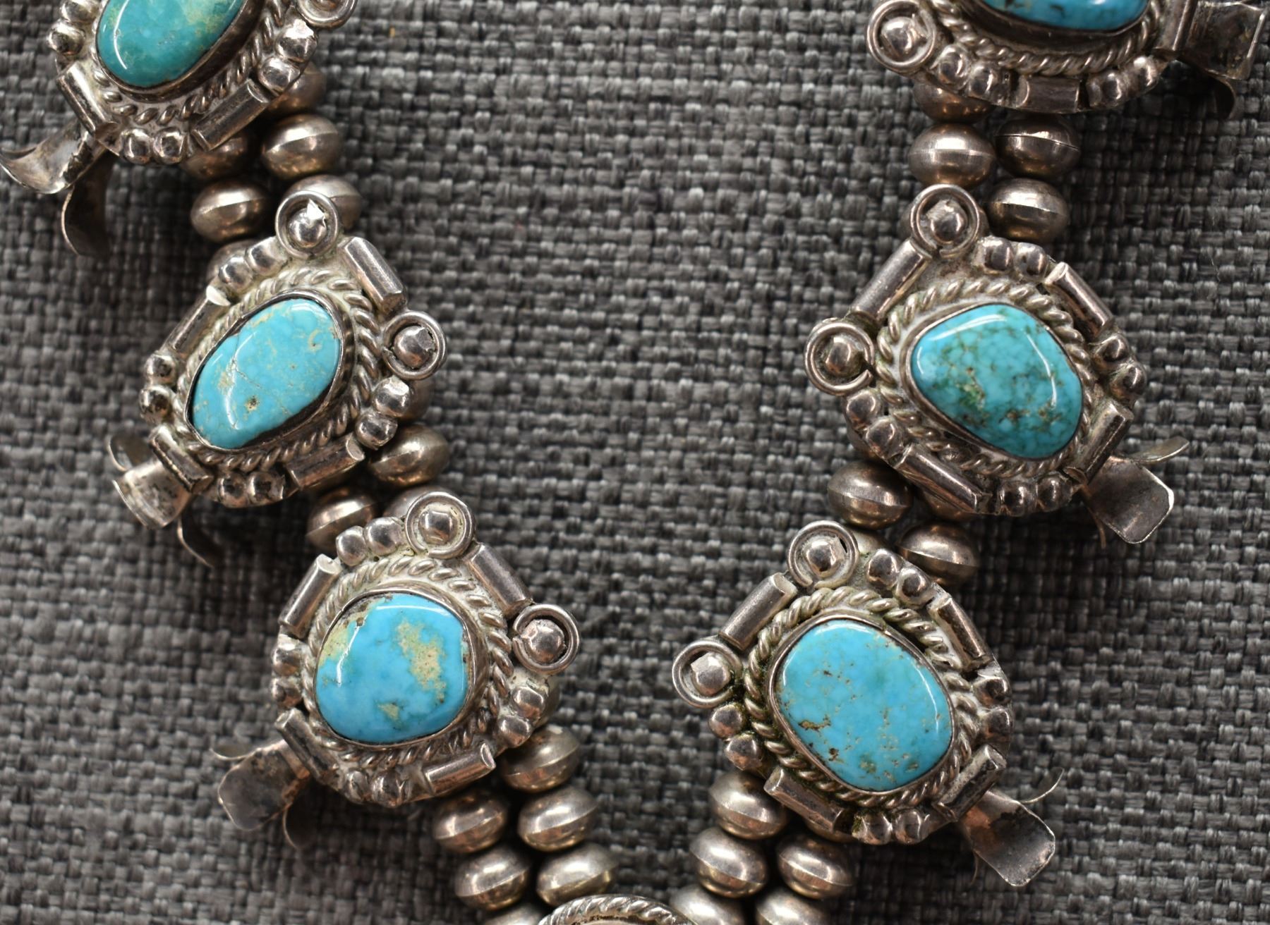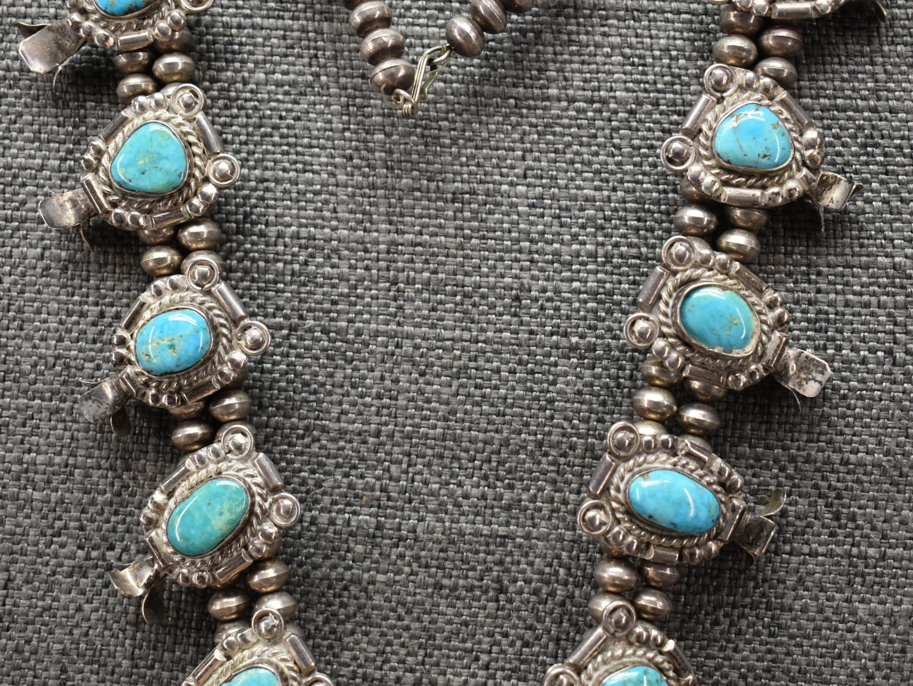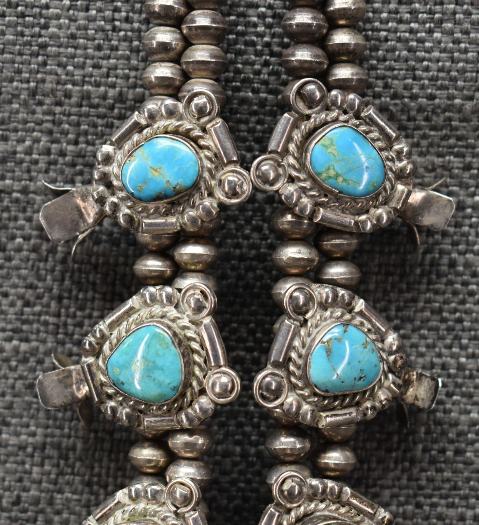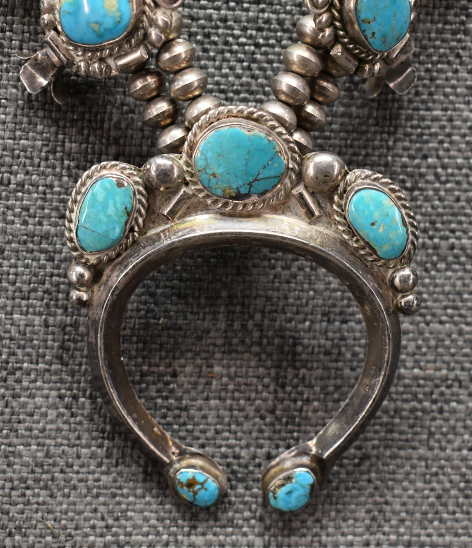 1970's Navajo. Sterling silver necklace 24'' long . Twelve sterling and turquoise blossoms 1.25'' x .75''. Naja 3'' x 2.5''. Total weight 224 grams