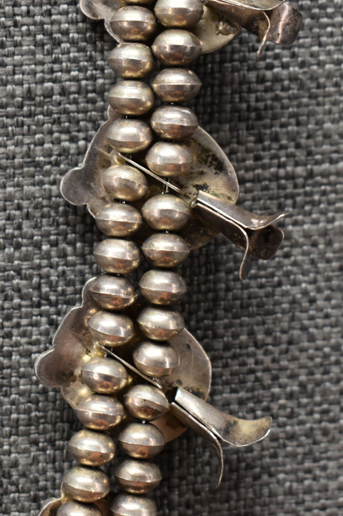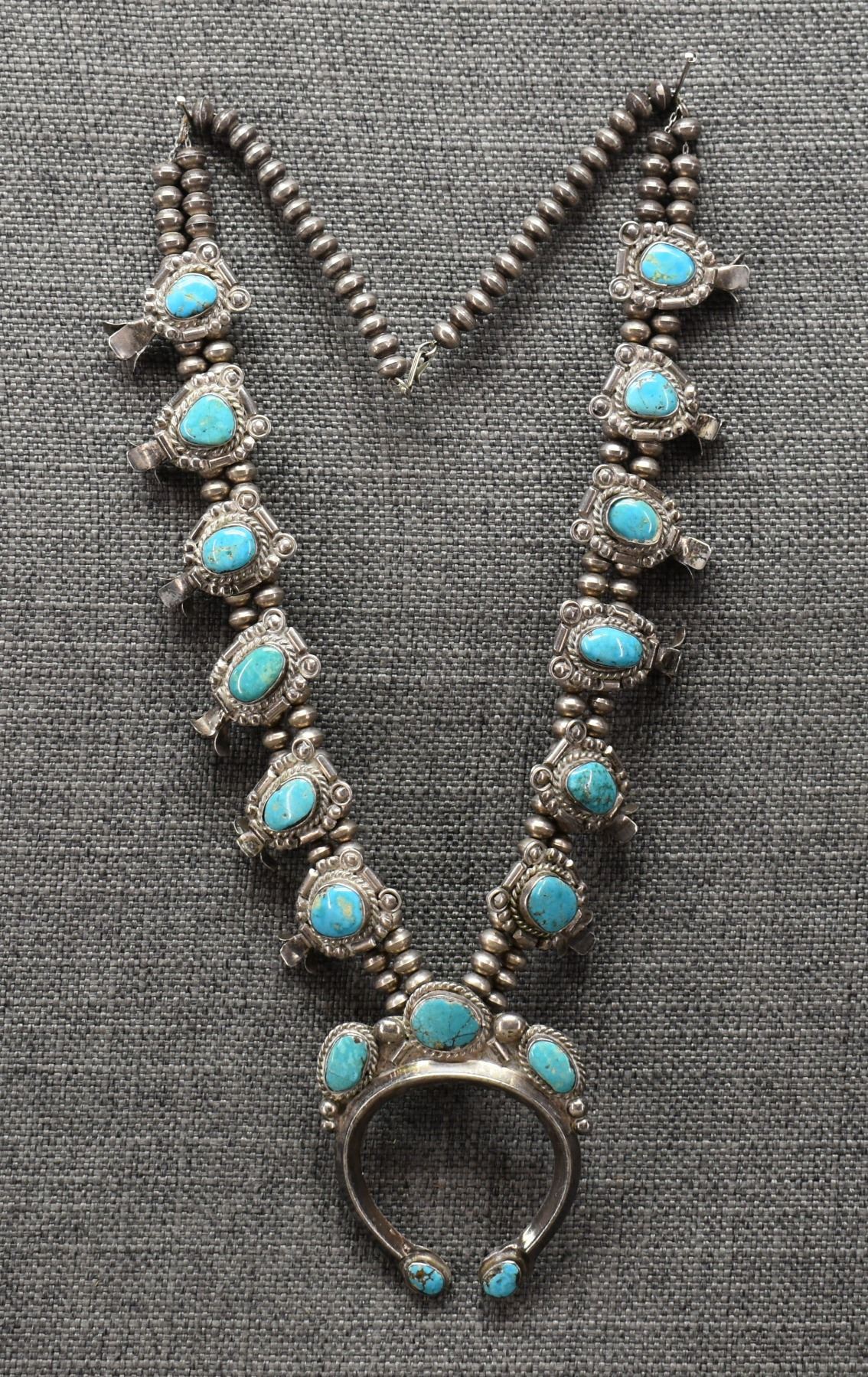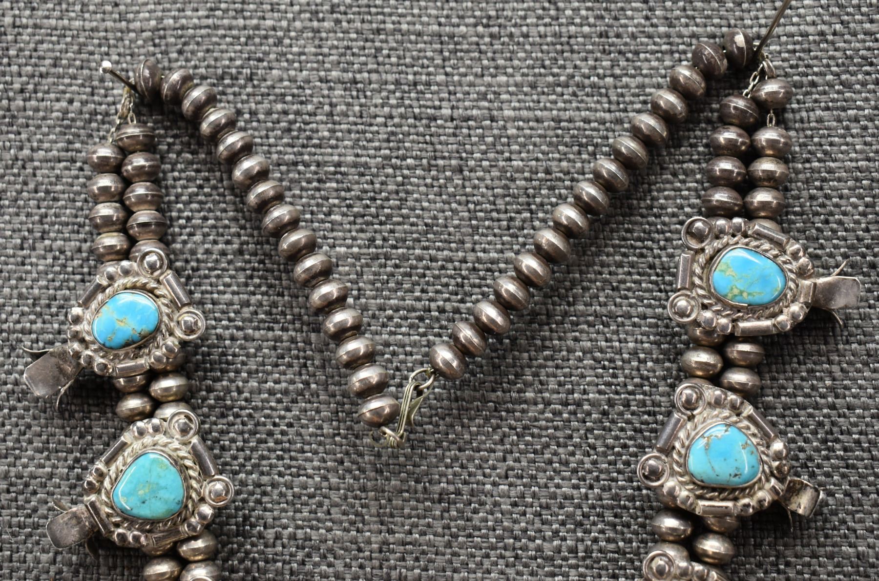 1970's Navajo. Sterling silver necklace 24'' long . Twelve sterling and turquoise blossoms 1.25'' x .75''. Naja 3'' x 2.5''. Total weight 224 grams