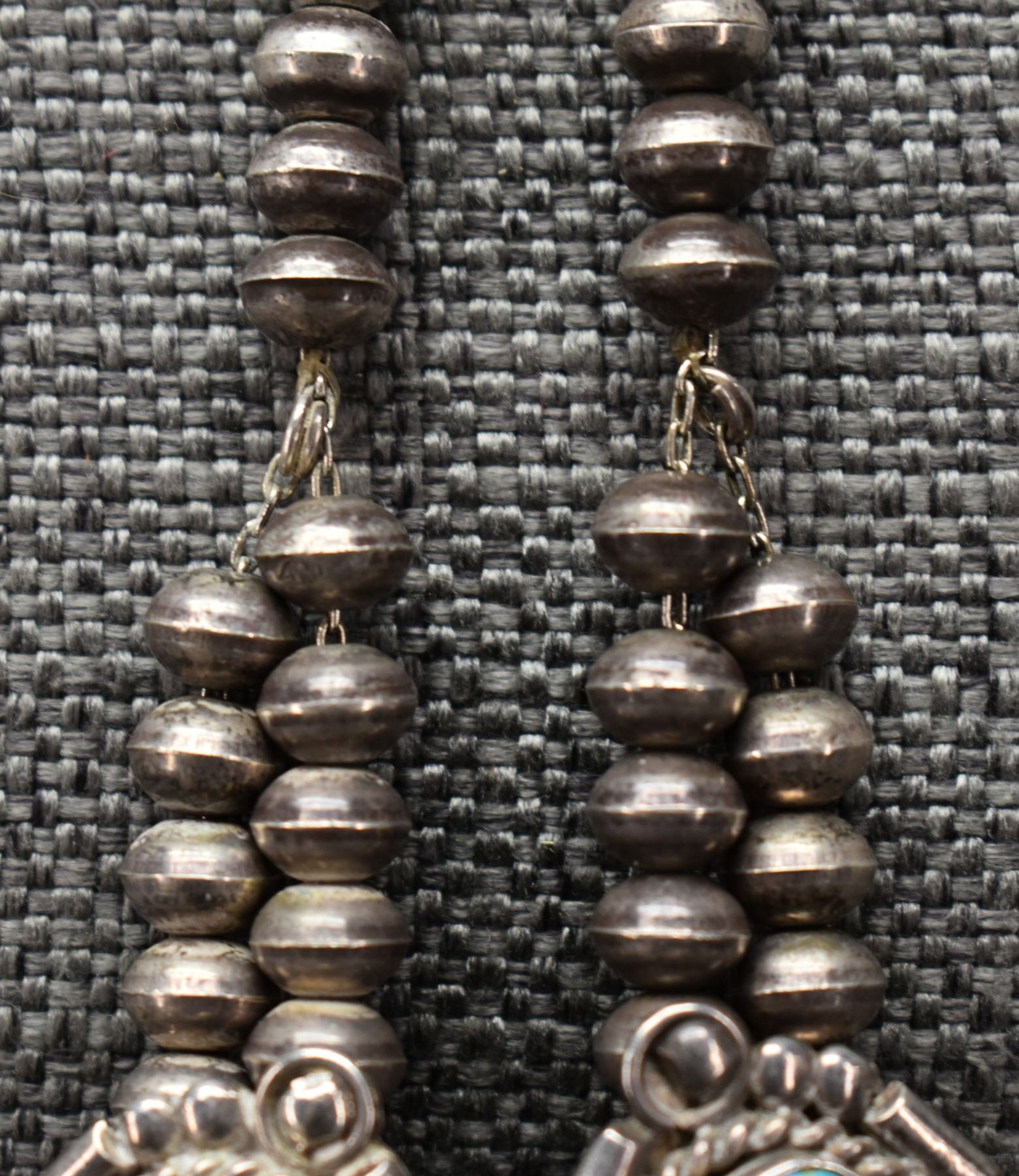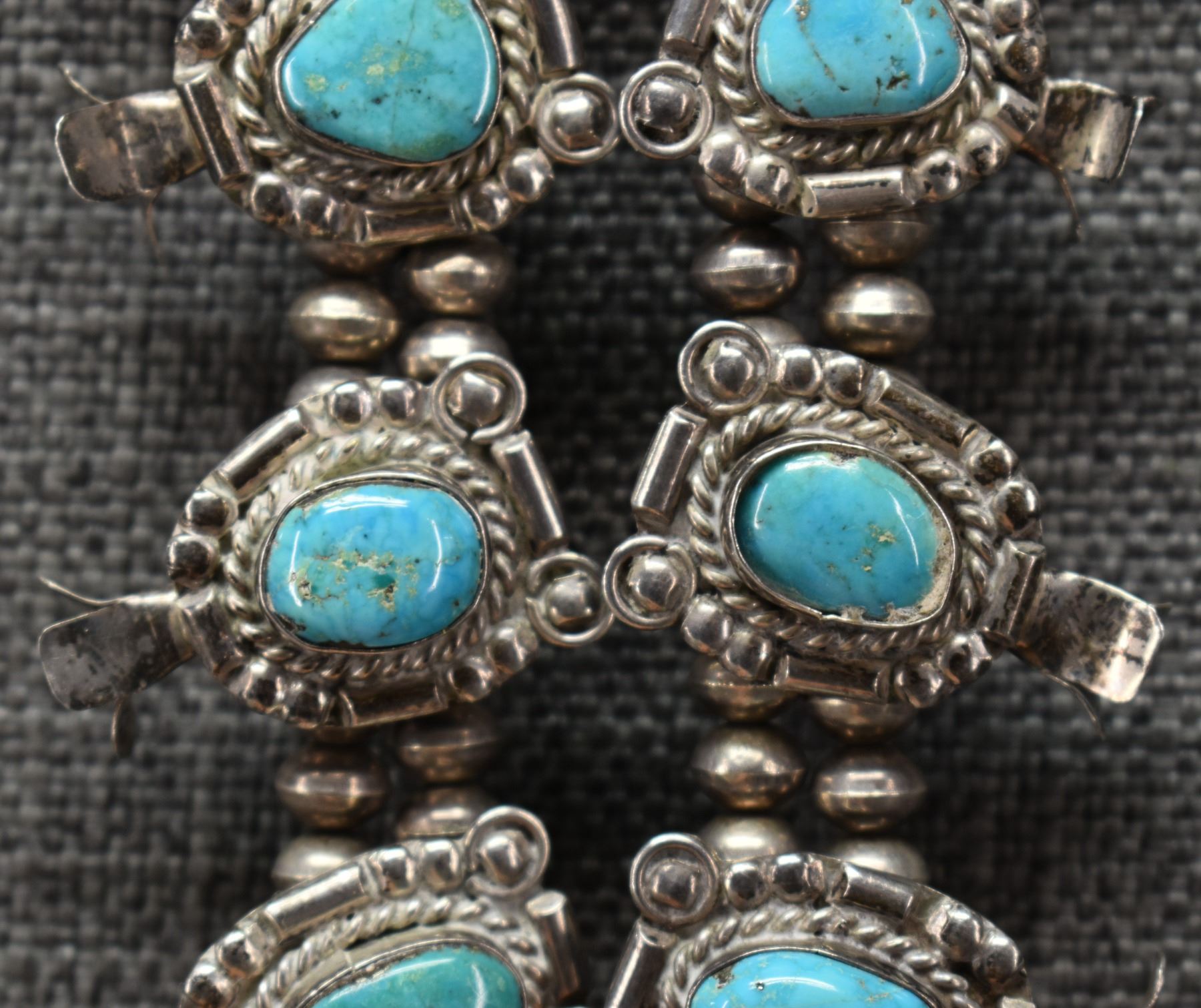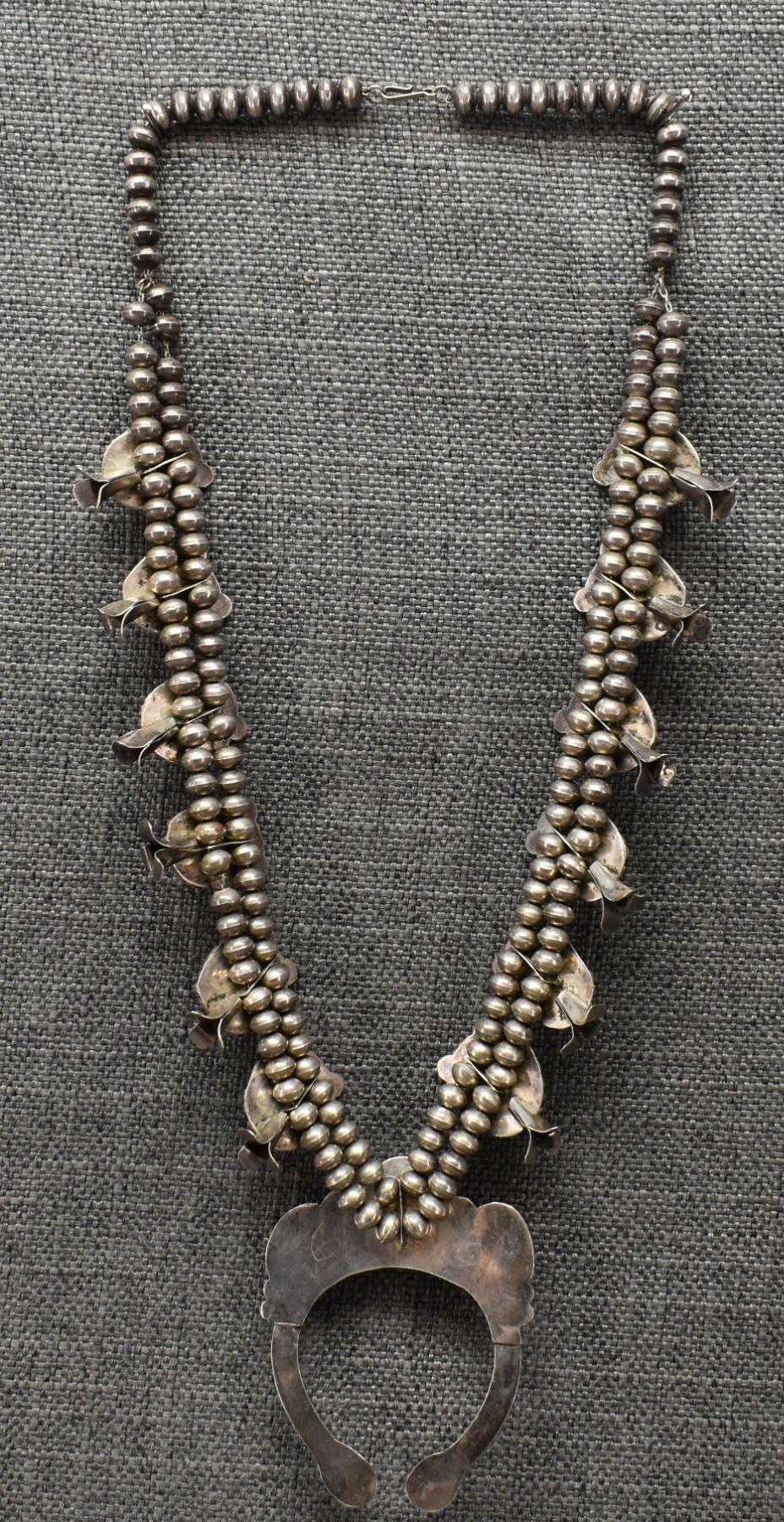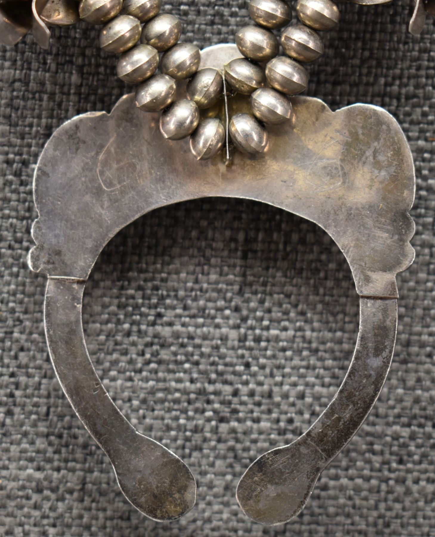 1970's Navajo. Sterling silver necklace 24'' long . Twelve sterling and turquoise blossoms 1.25'' x .75''. Naja 3'' x 2.5''. Total weight 224 grams