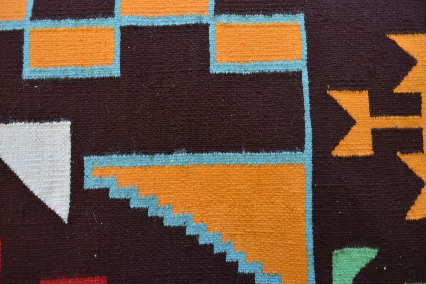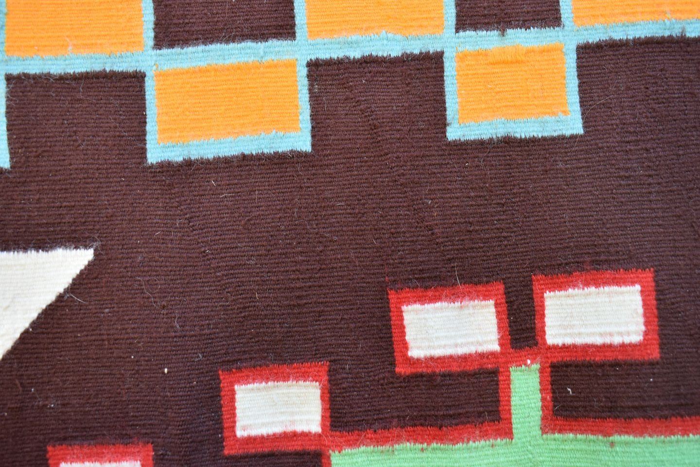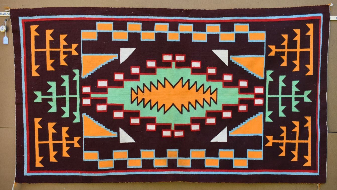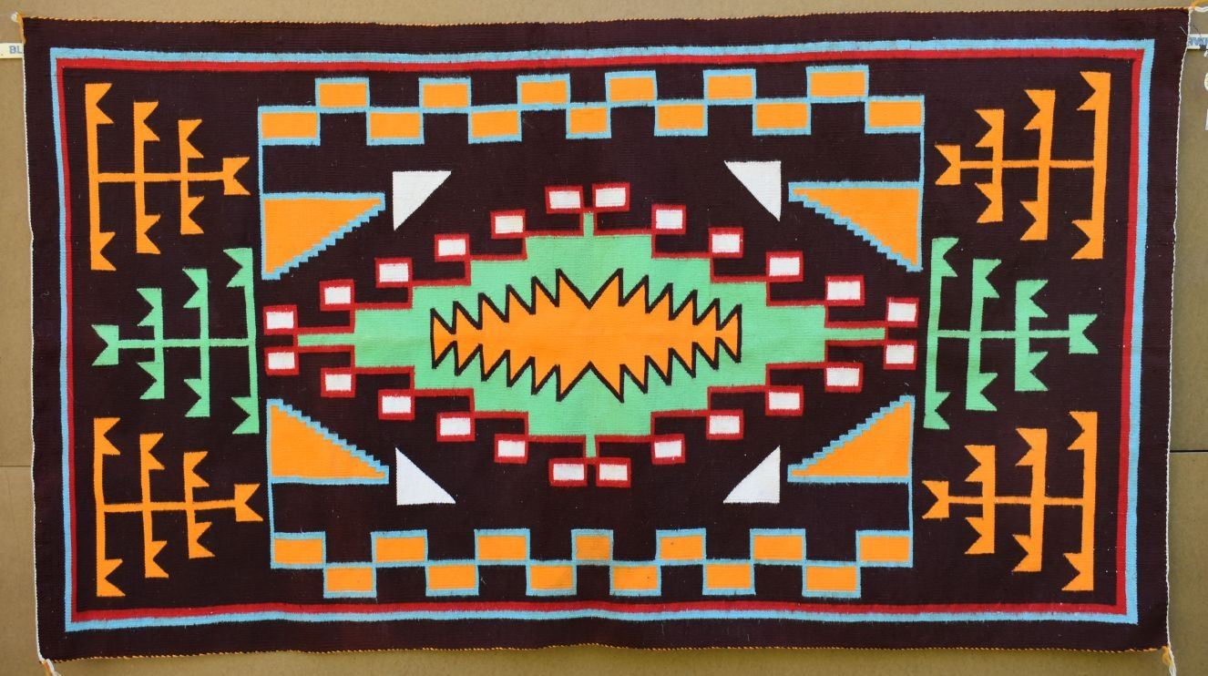1950-60's Navajo, hand woven bust colorful design has lead sealed Fred Harvey tag attributing to Sarah Joe 37" x 68"