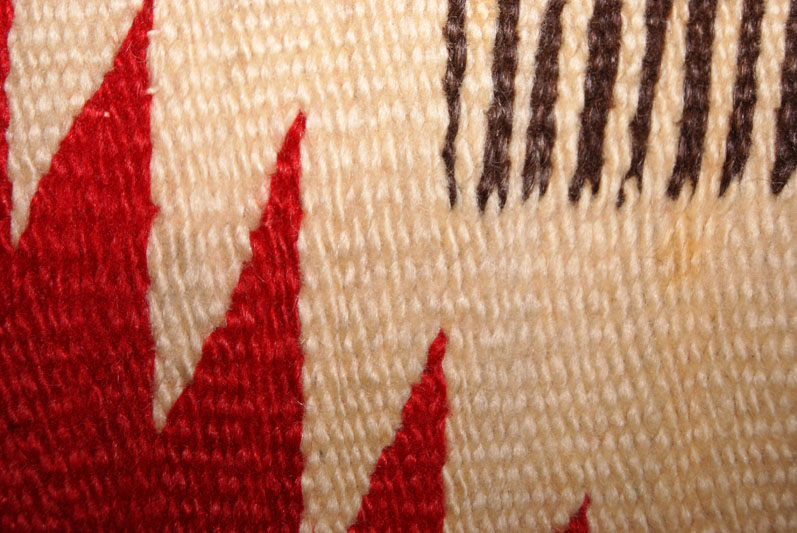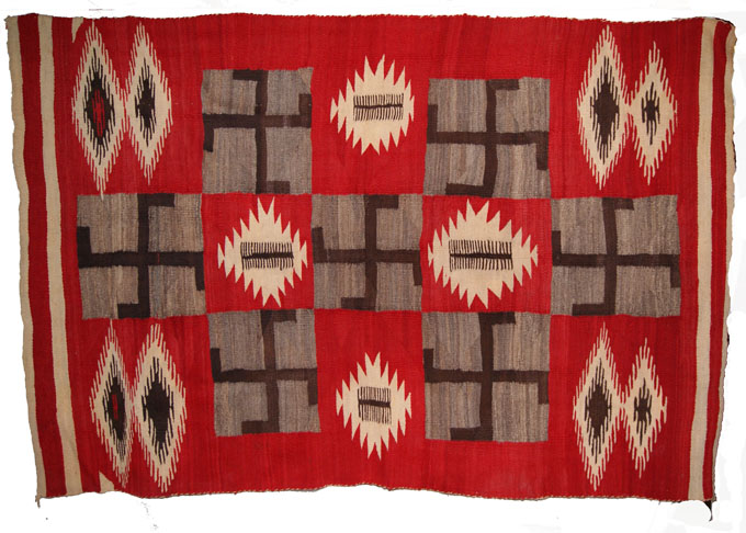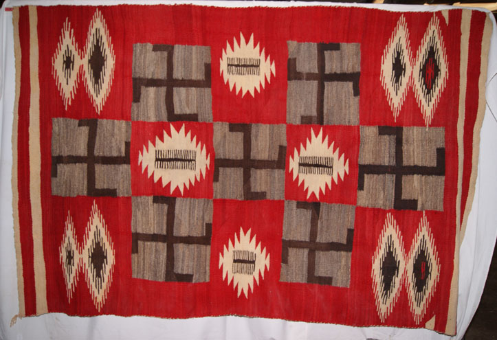 1910-20s unusual storm pattern with whirling logs and geometric design has holes, edge ware and stains, 60" x 92"