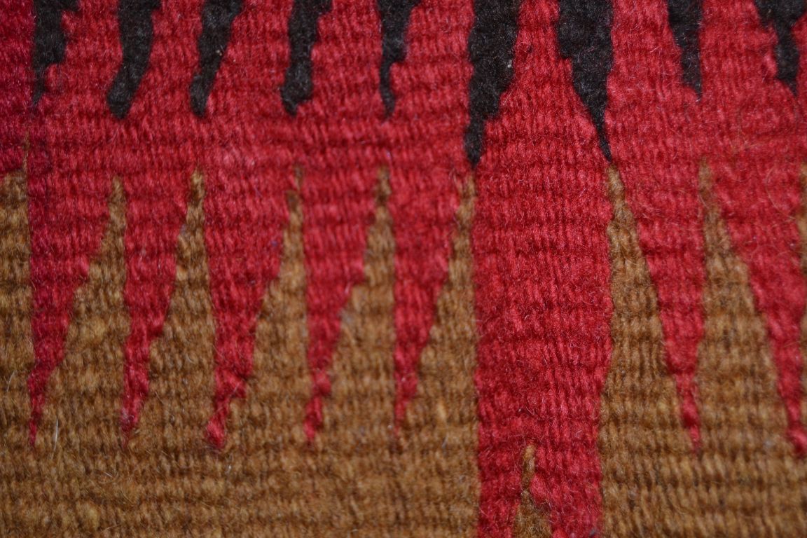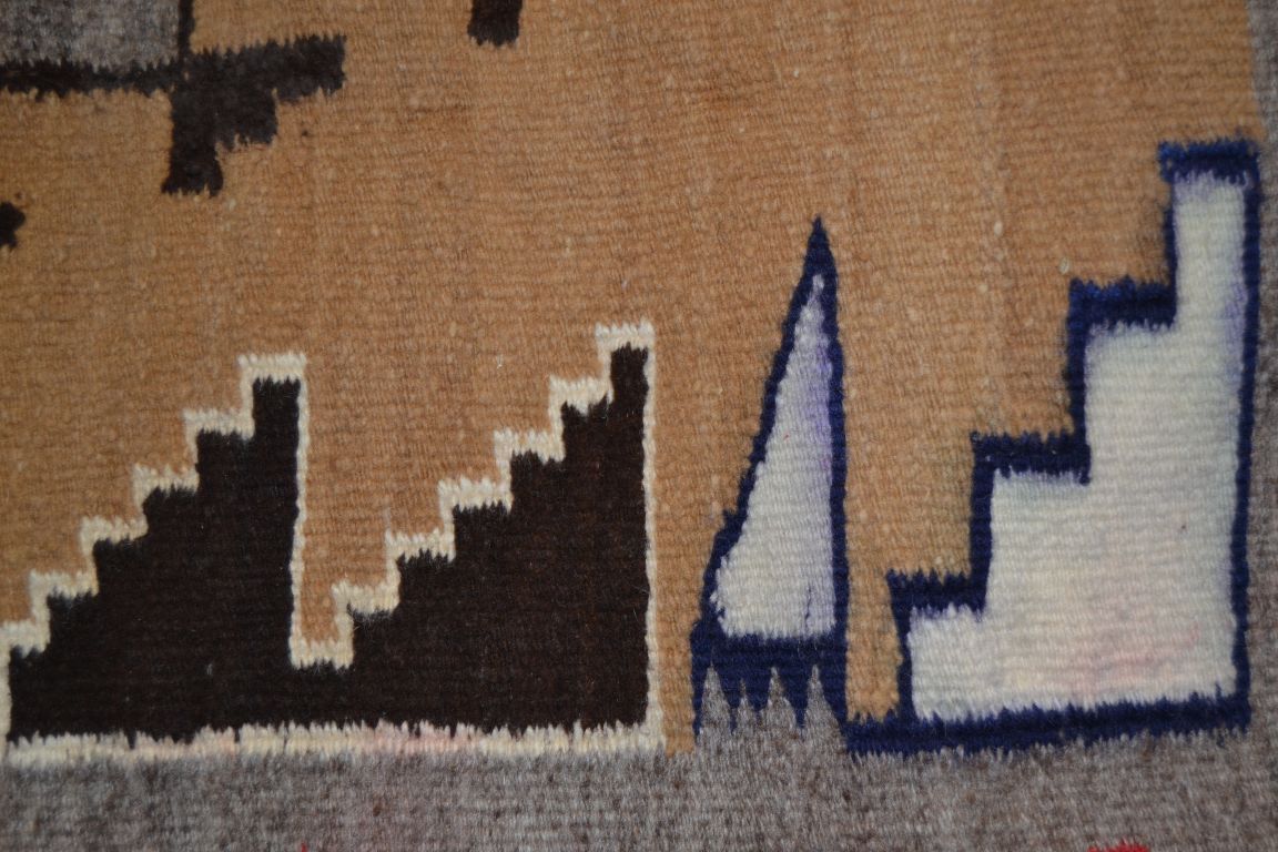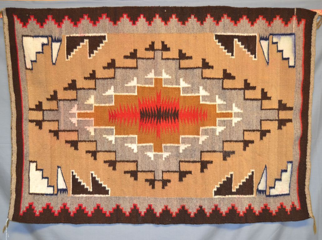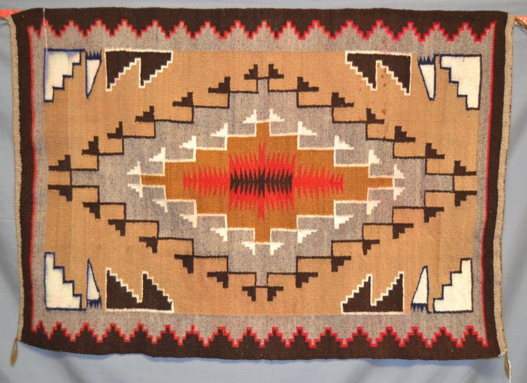 1970's busy geometric design with diamond center, has stains and bleed, 48" x 32"