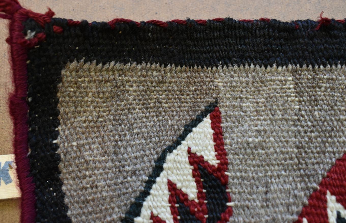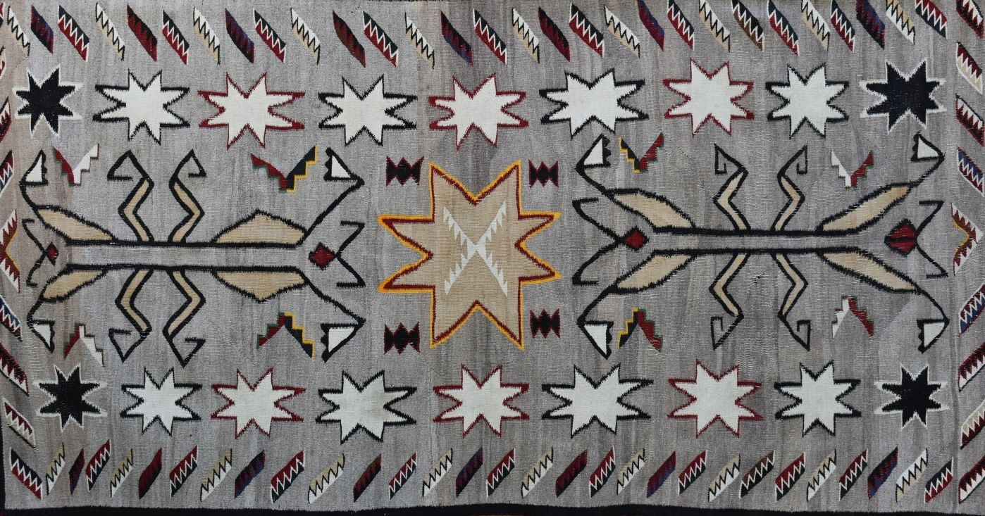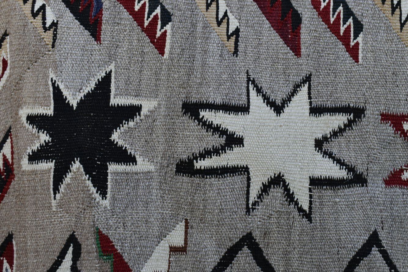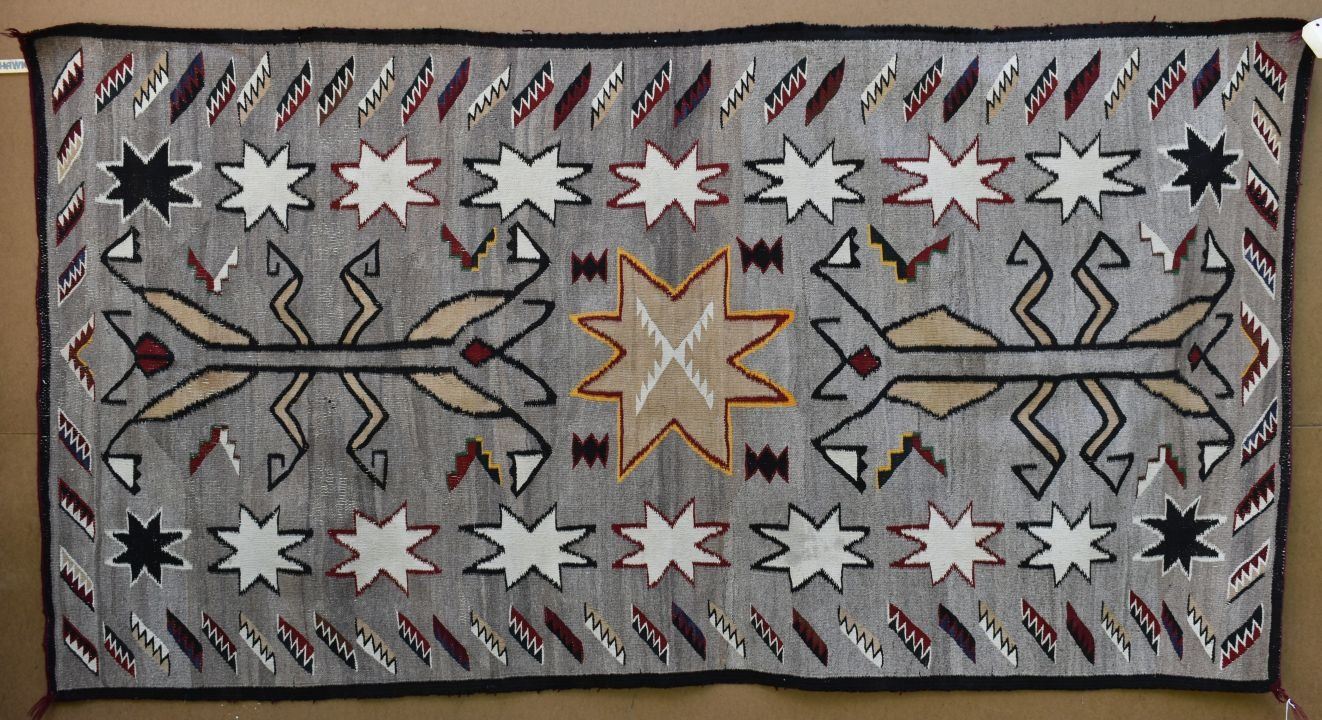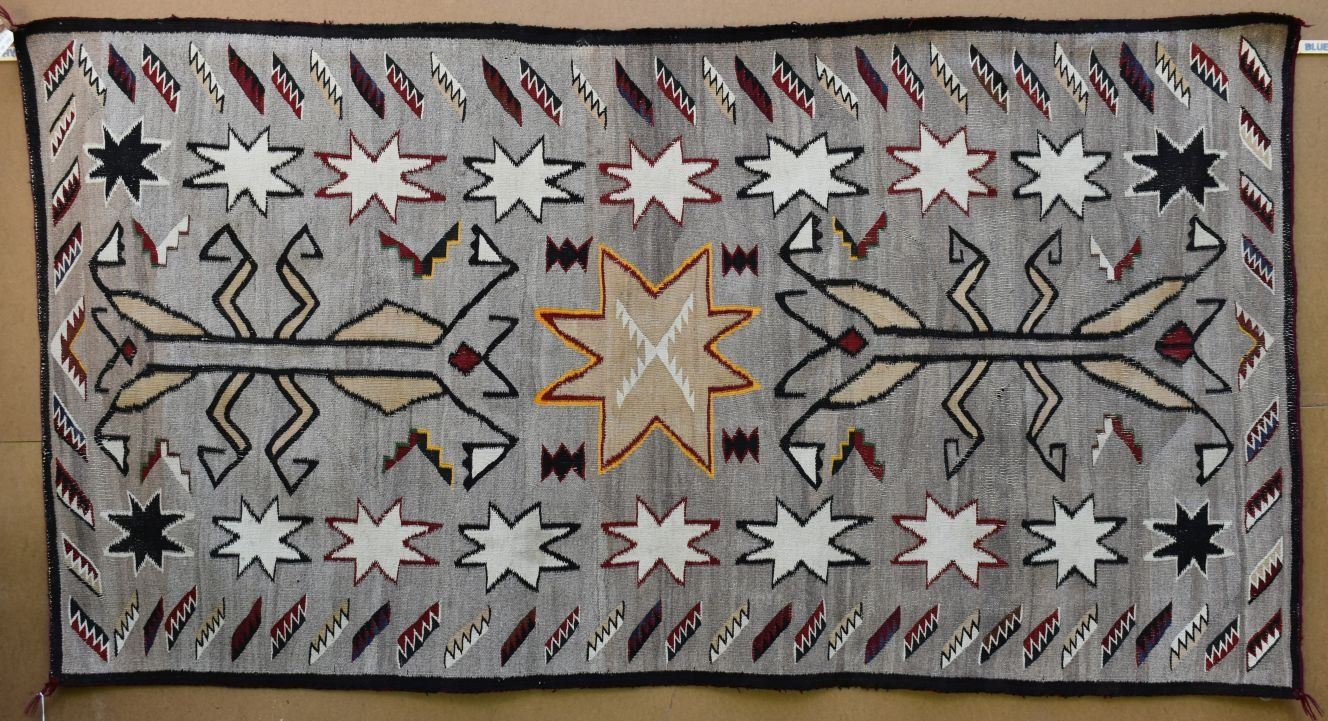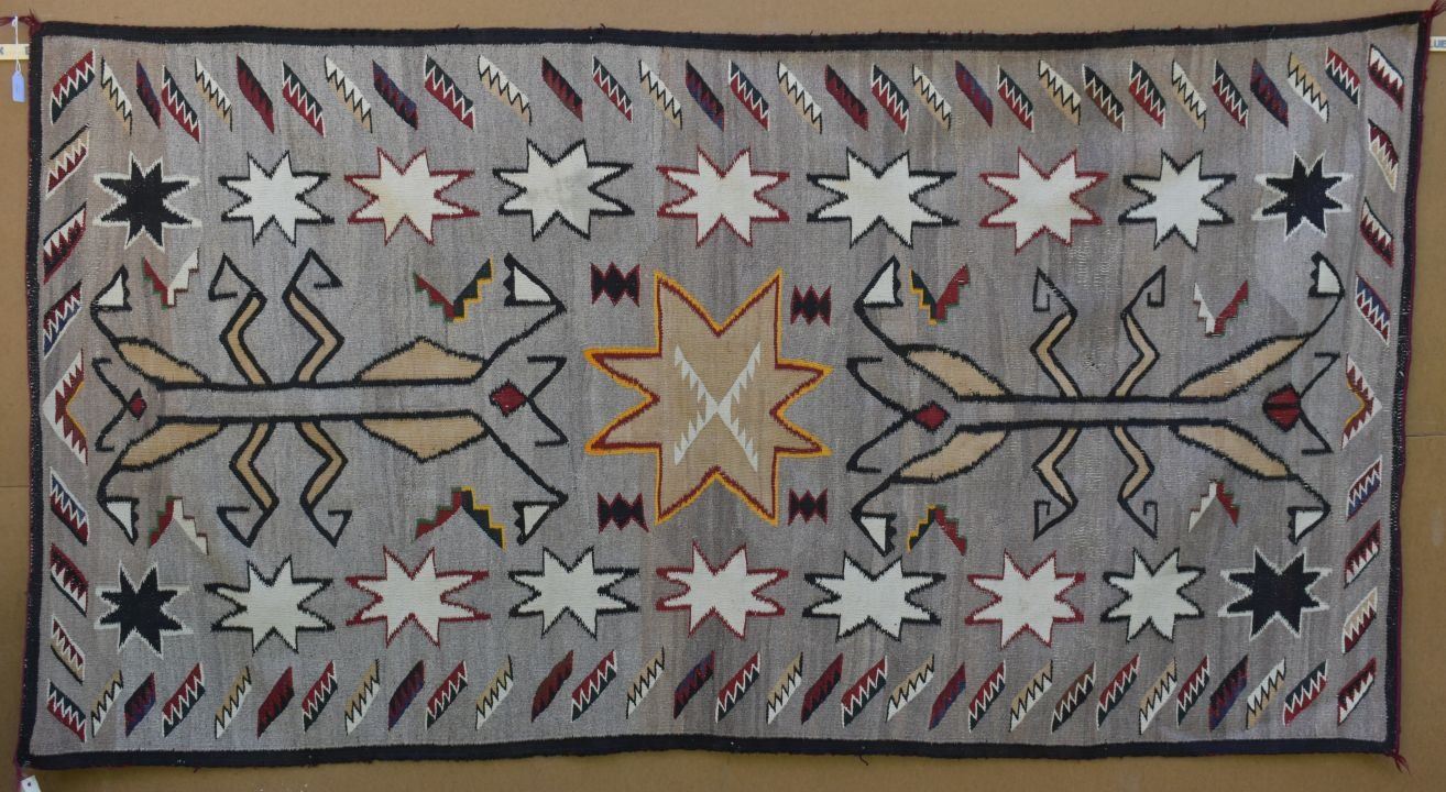 1920's Navajo, hand woven praying mantis, star and geometric design 84" x 43" has wear and holes