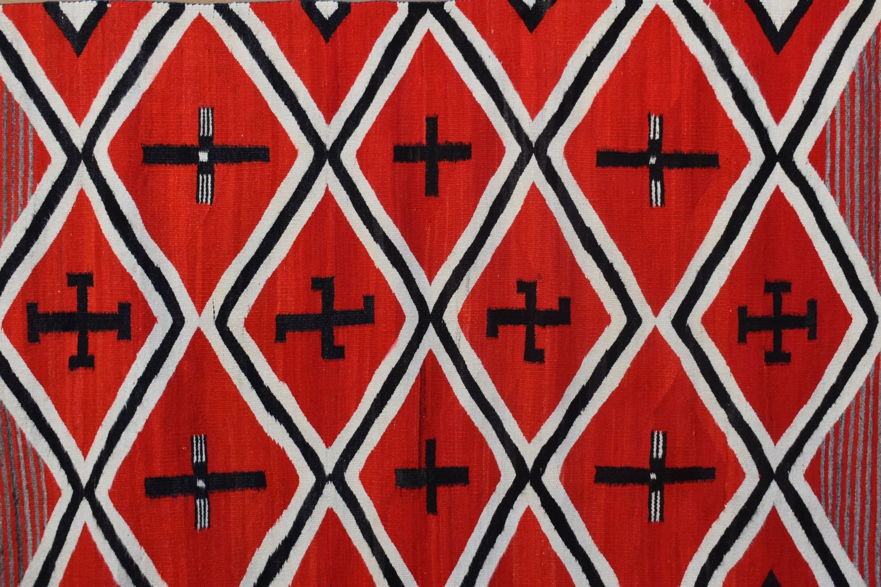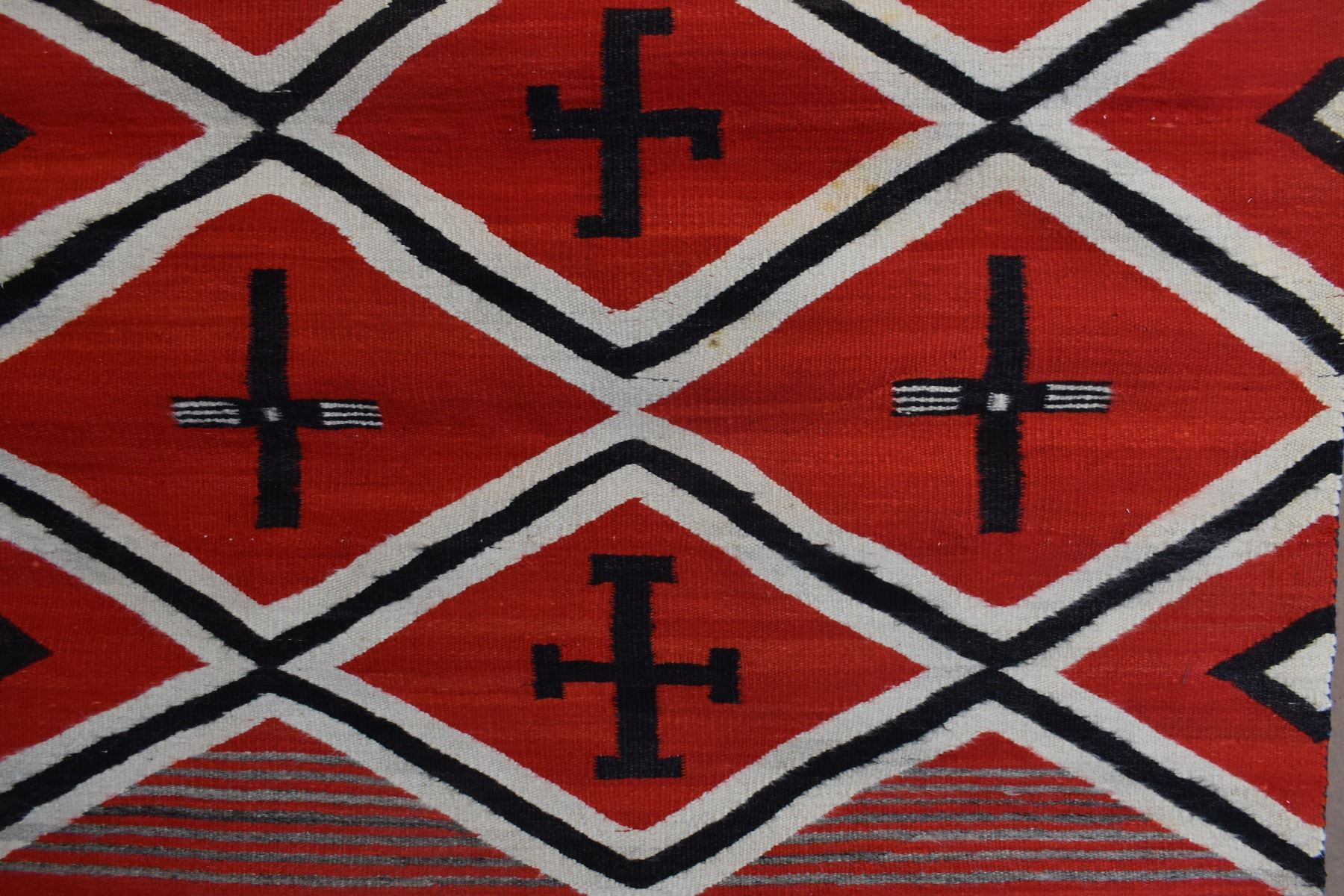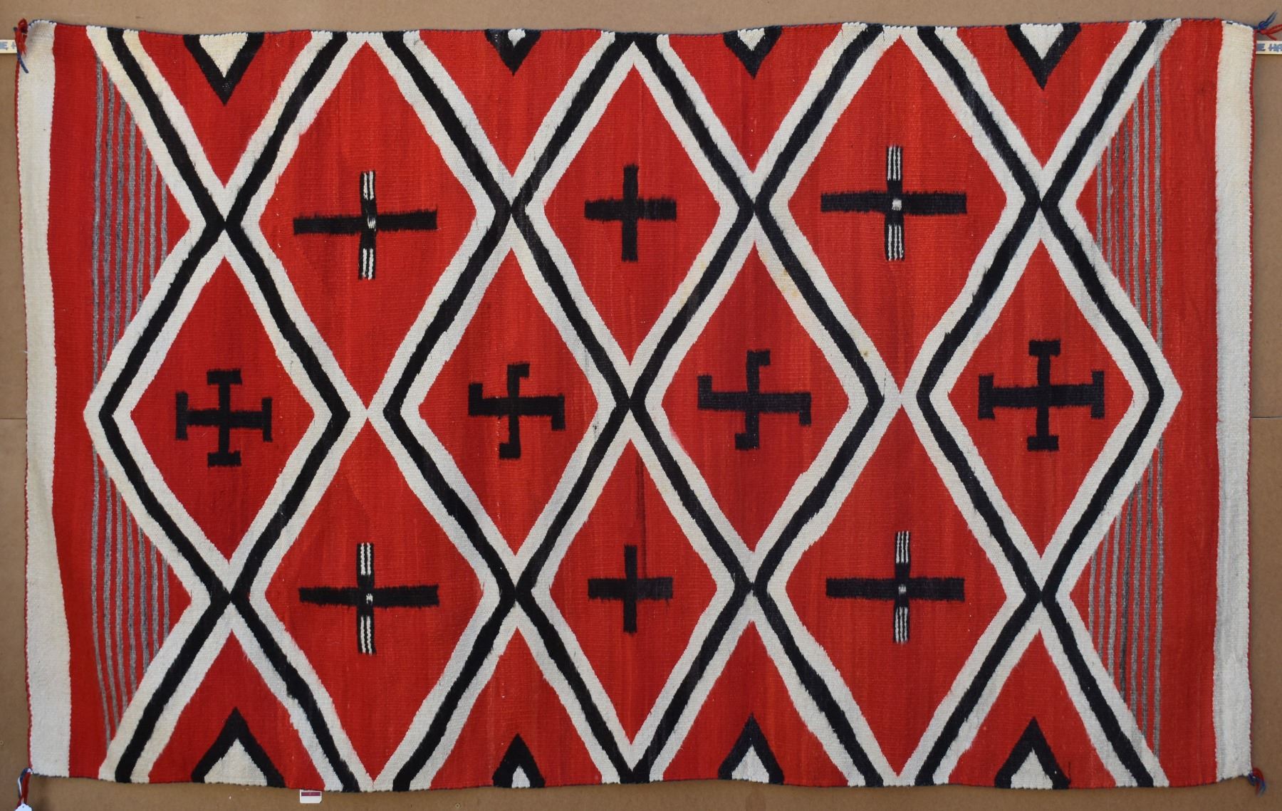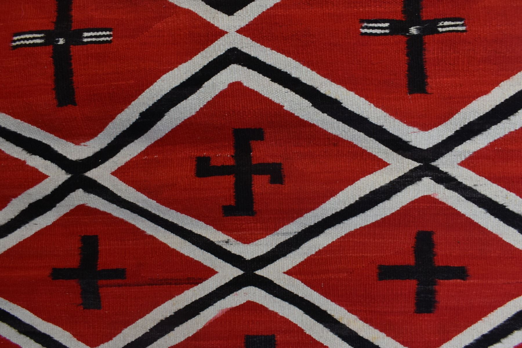 1890's Navajo. Hand woven cross and whirling log design on red field. 86'' x 51''