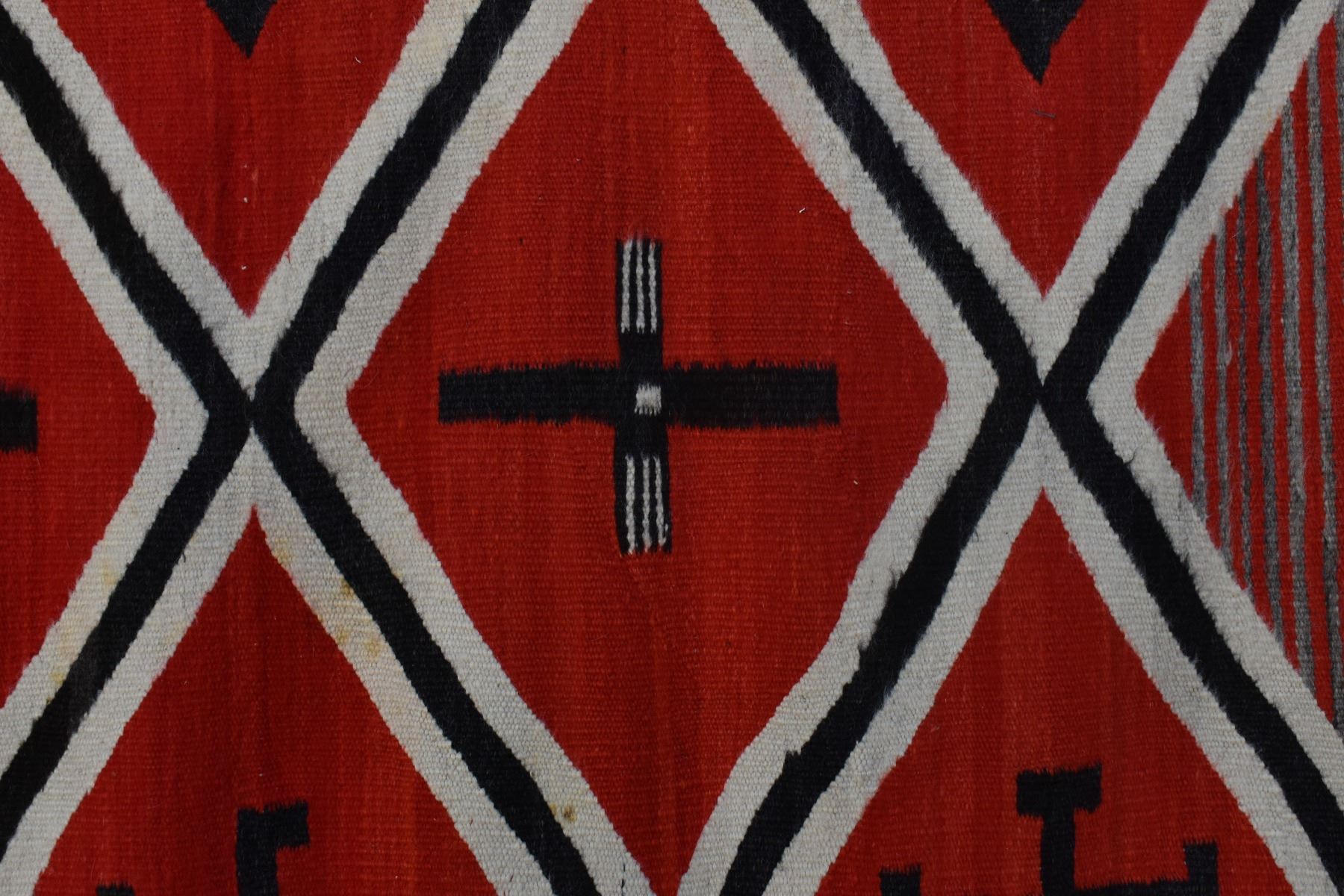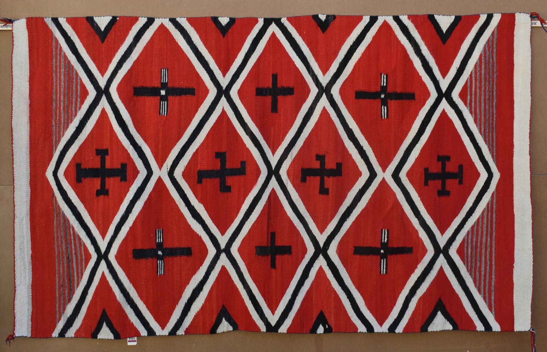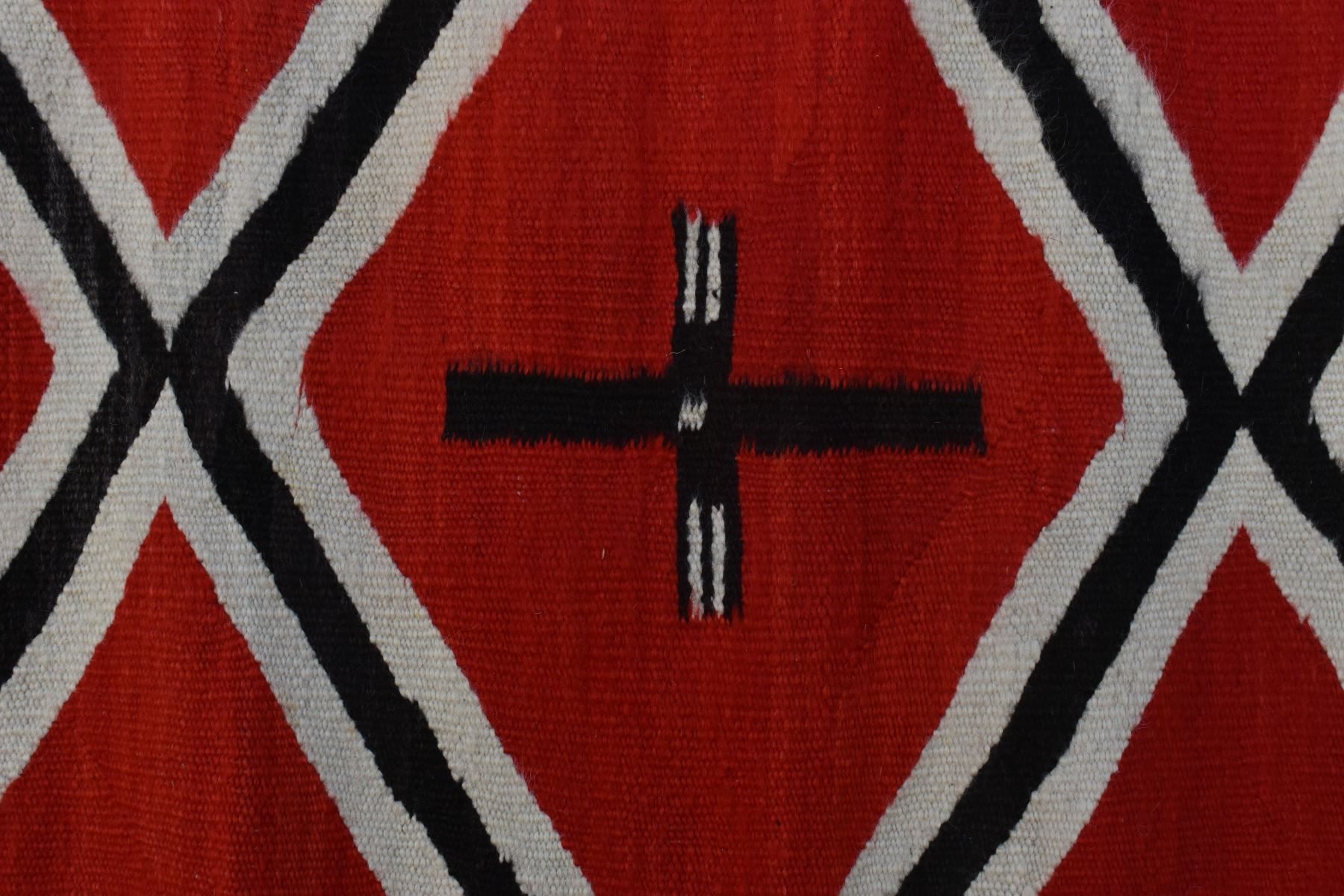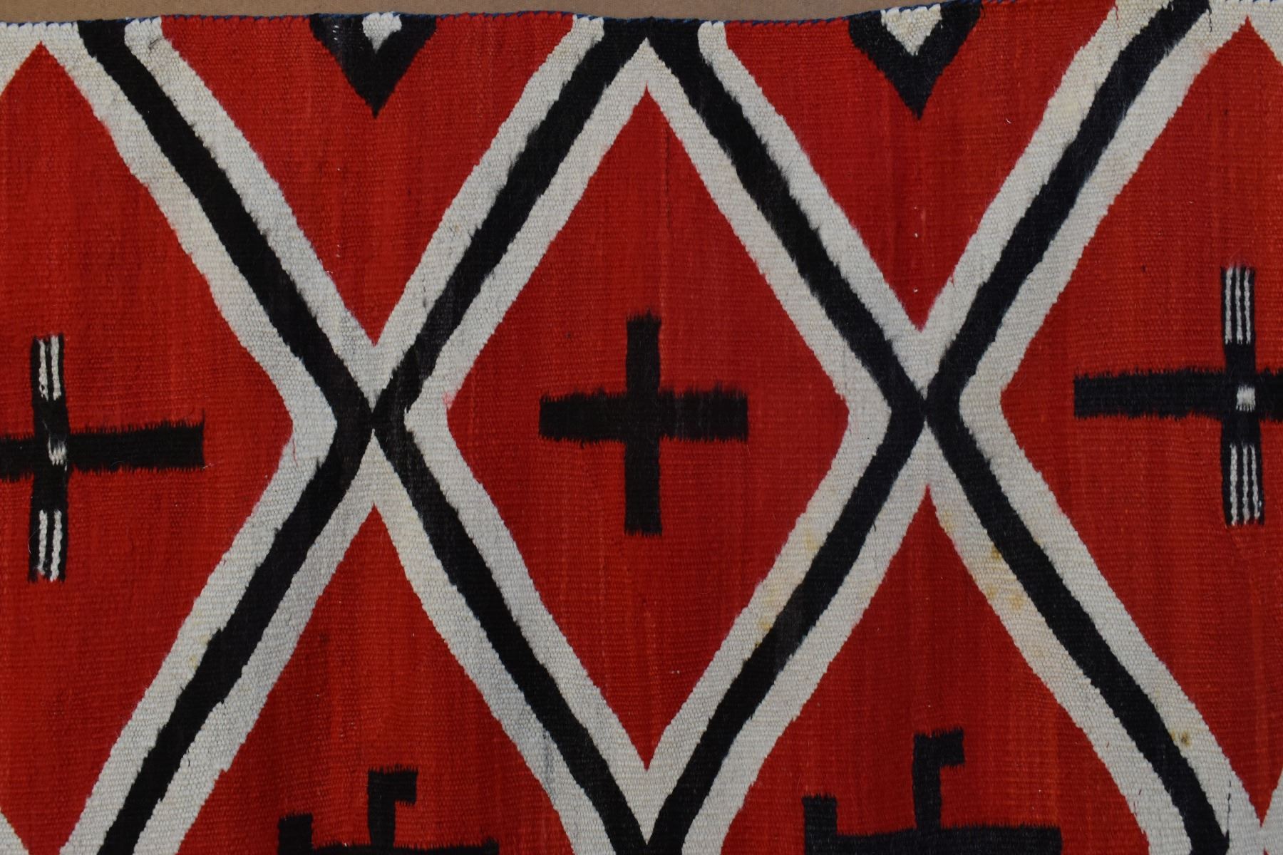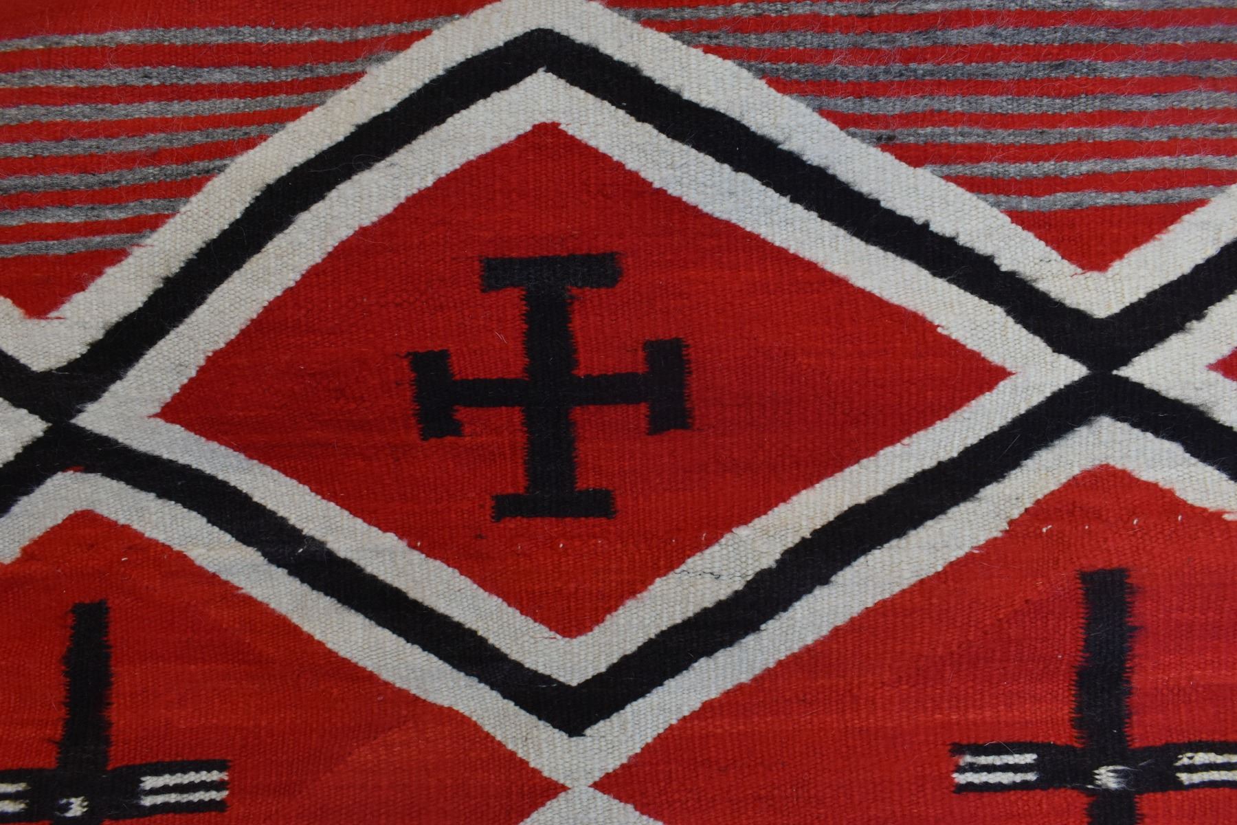 1890's Navajo. Hand woven cross and whirling log design on red field. 86'' x 51''