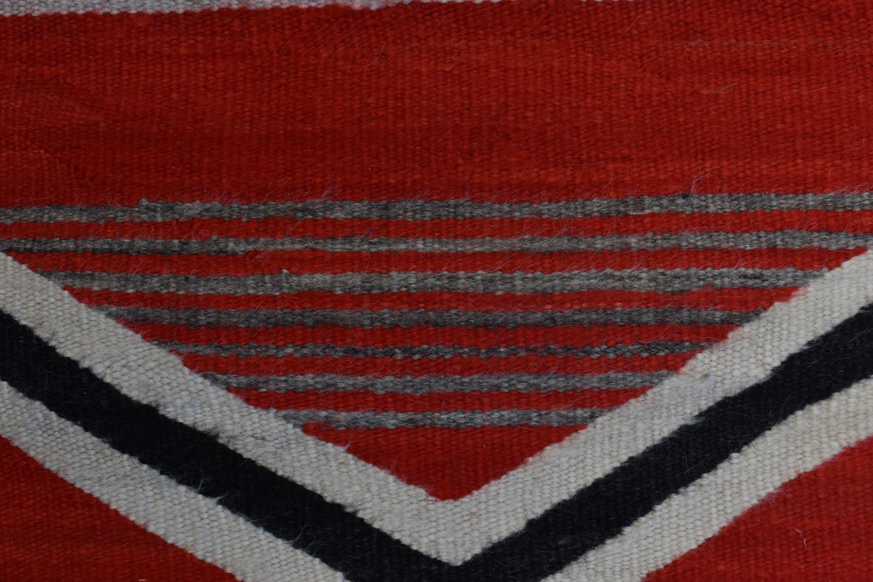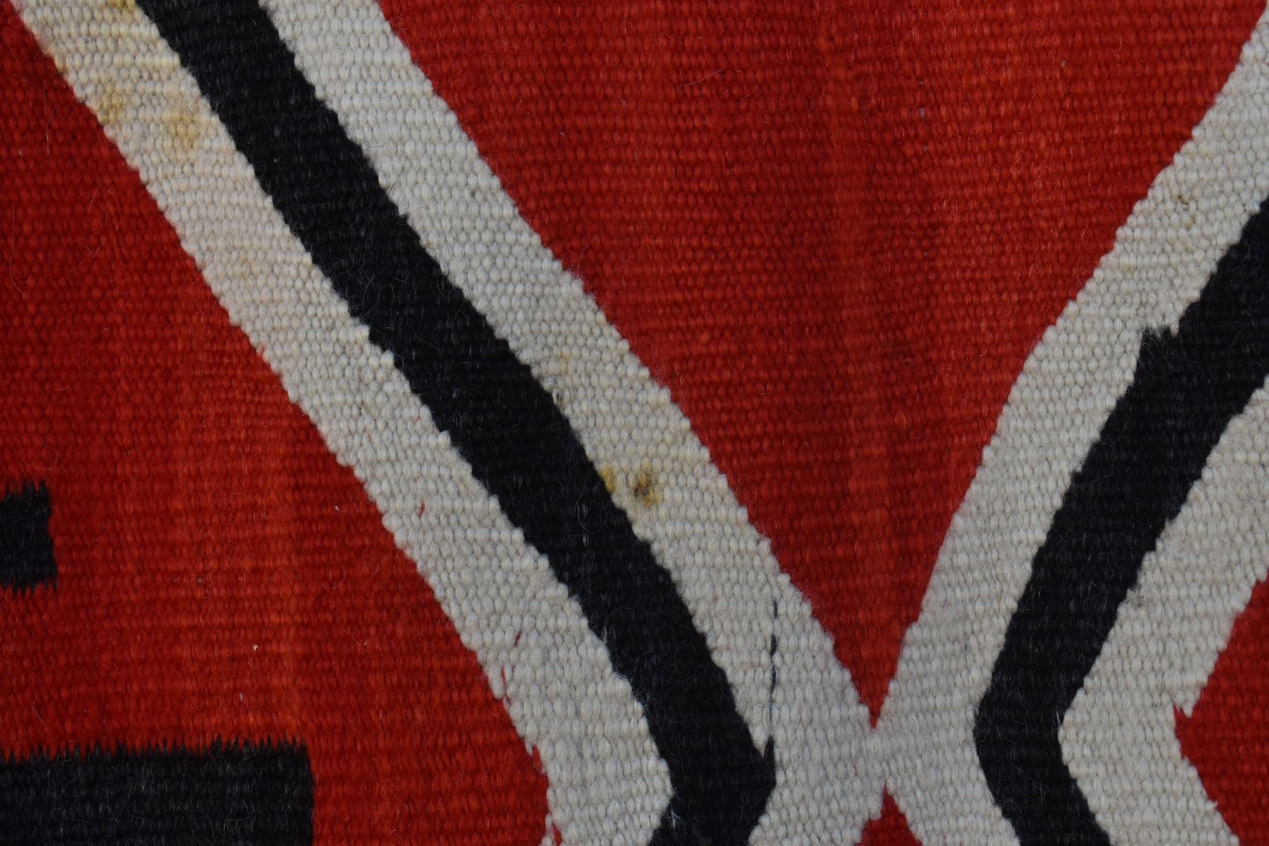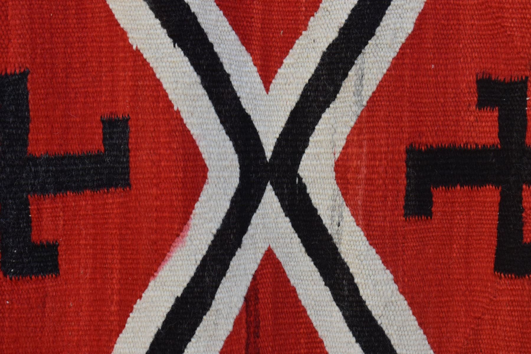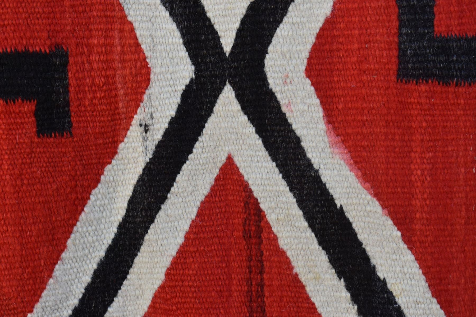 1890's Navajo. Hand woven cross and whirling log design on red field. 86'' x 51''