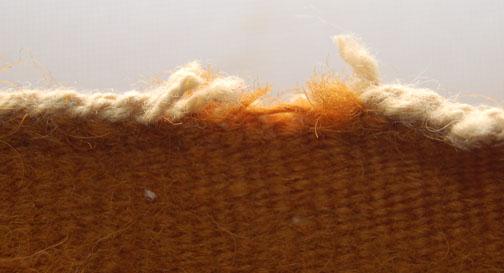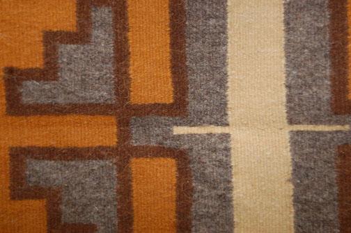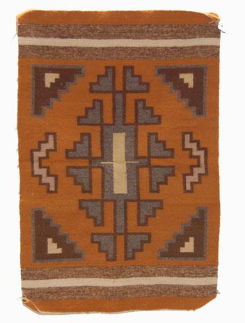 vegetal dyed Burntwater, woven by Getty Bia, has minimal damage to end, 27” x 18”, 1970’S