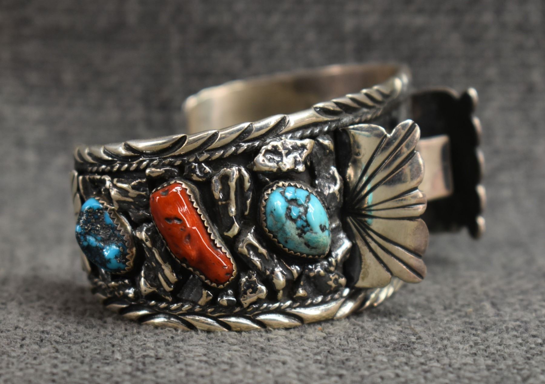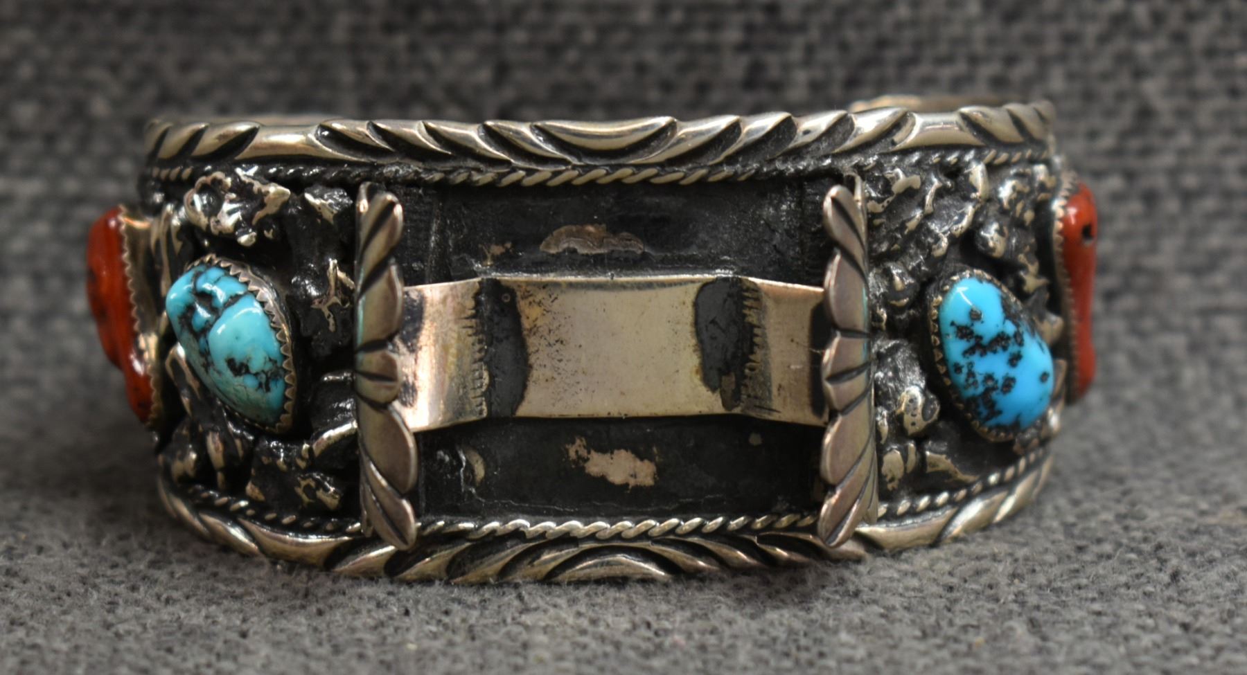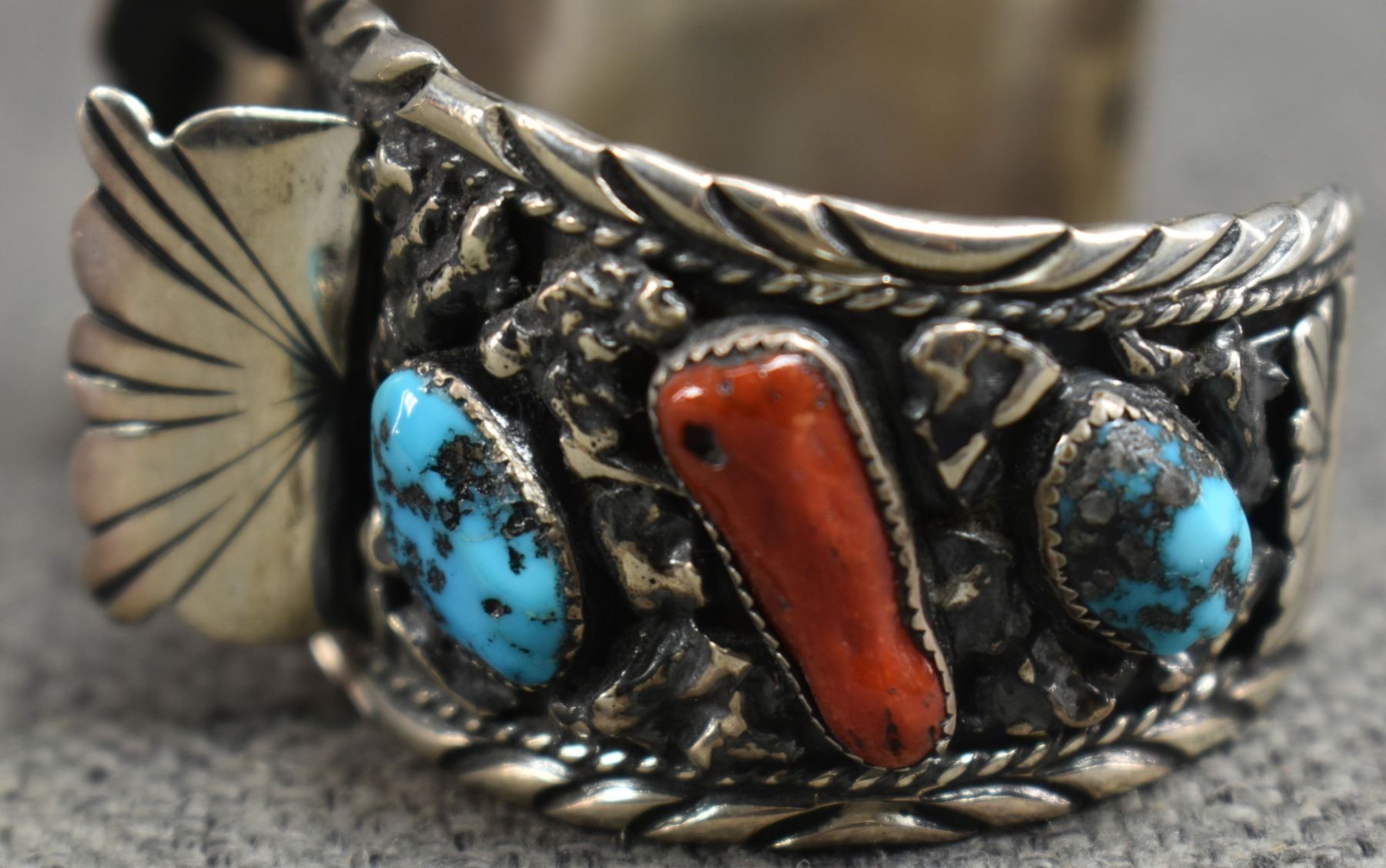 1970's Navajo. Sterling silver turquoise and coral watch bracelet. Signed E.G.B.. 1.25'' x5.5'' x 1.5''. Total weight 57 grams