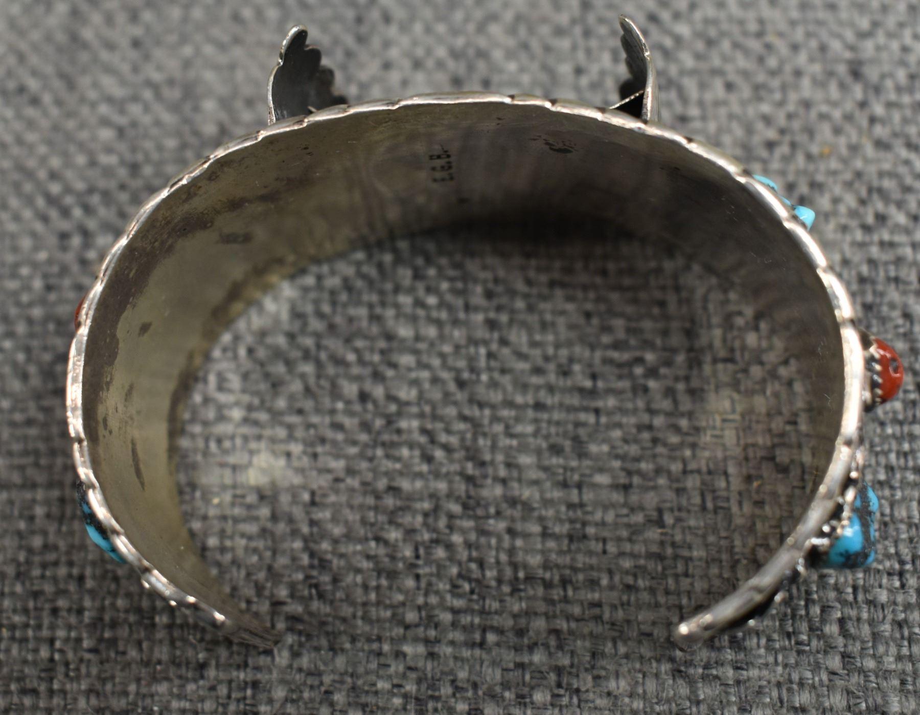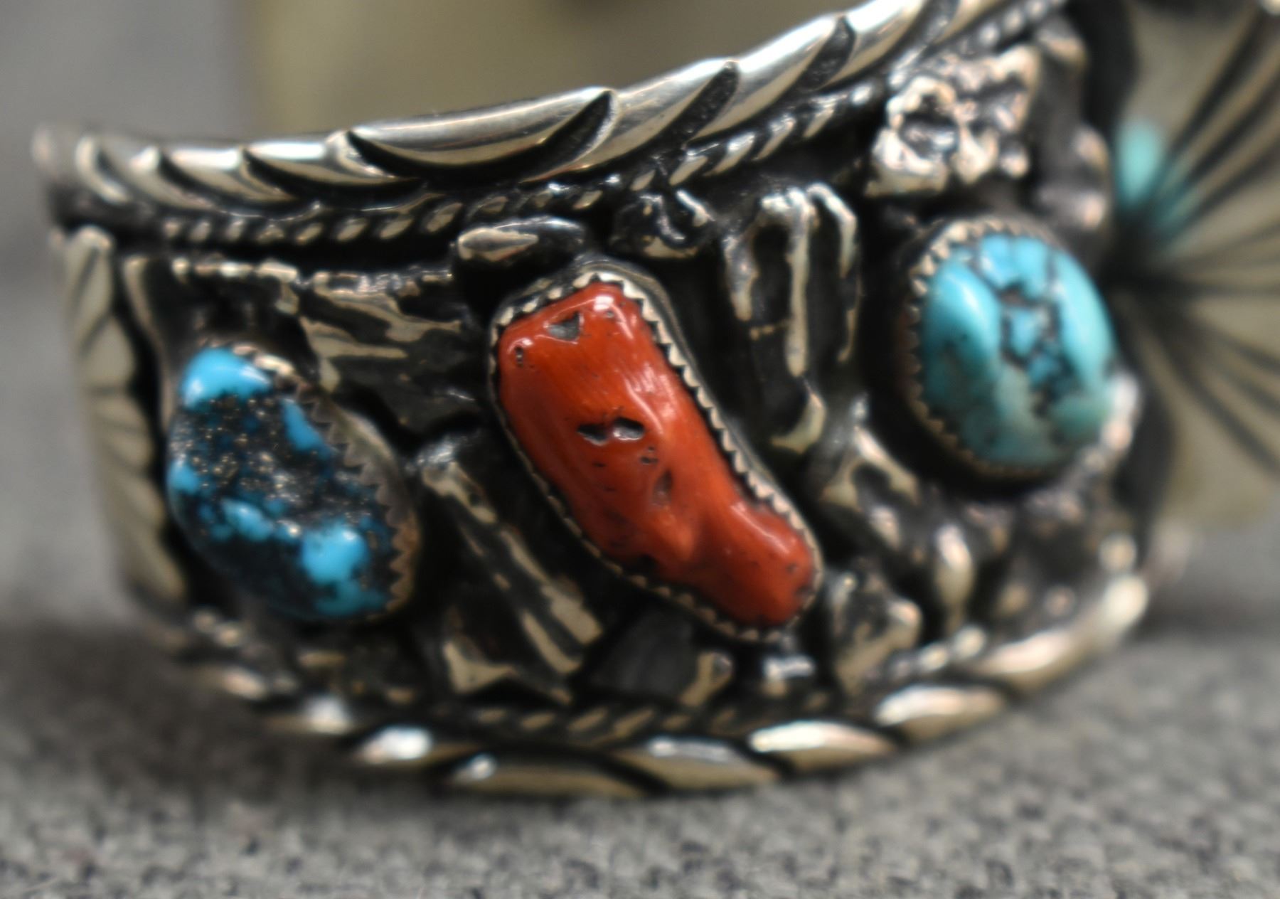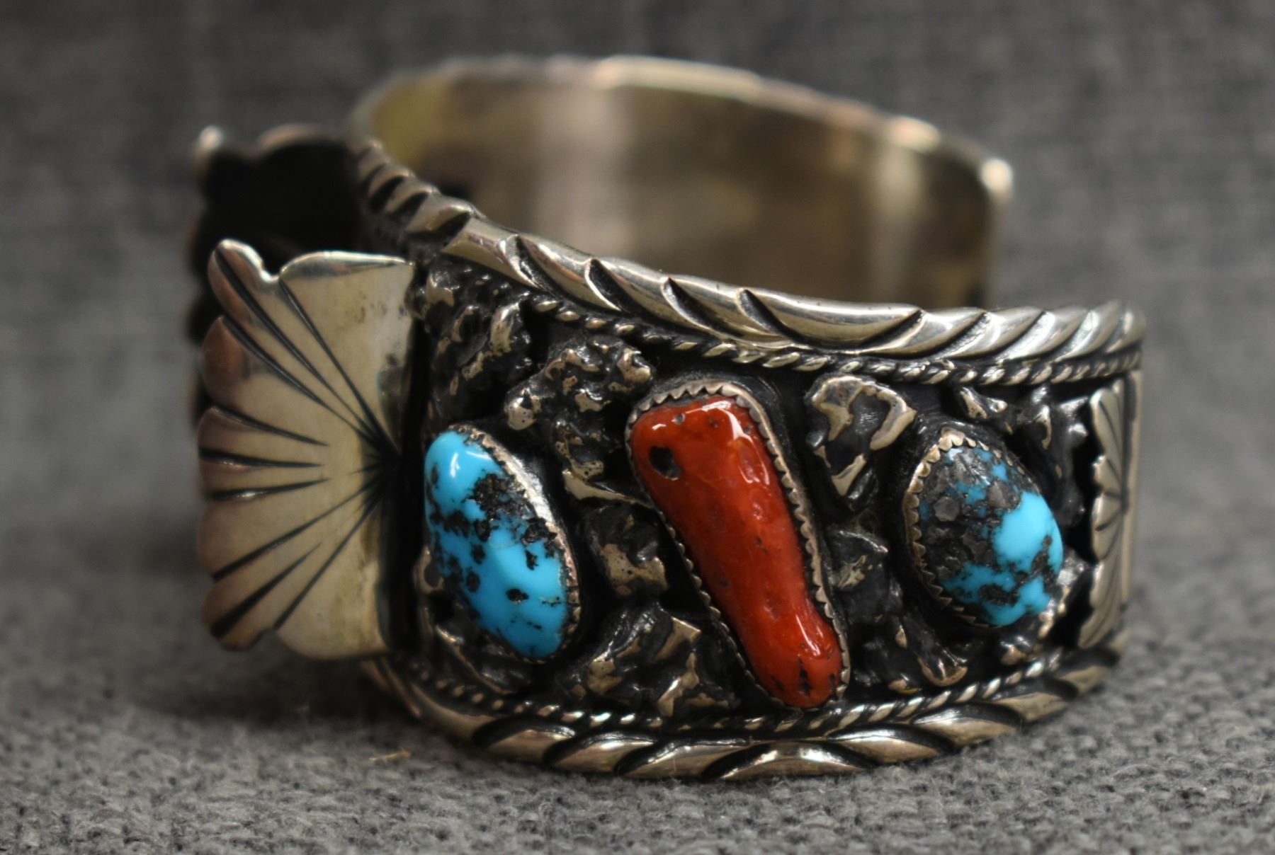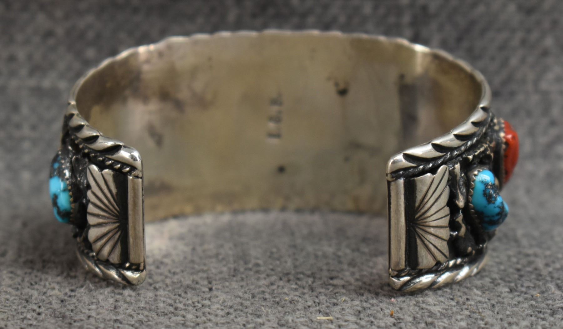 1970's Navajo. Sterling silver turquoise and coral watch bracelet. Signed E.G.B.. 1.25'' x5.5'' x 1.5''. Total weight 57 grams