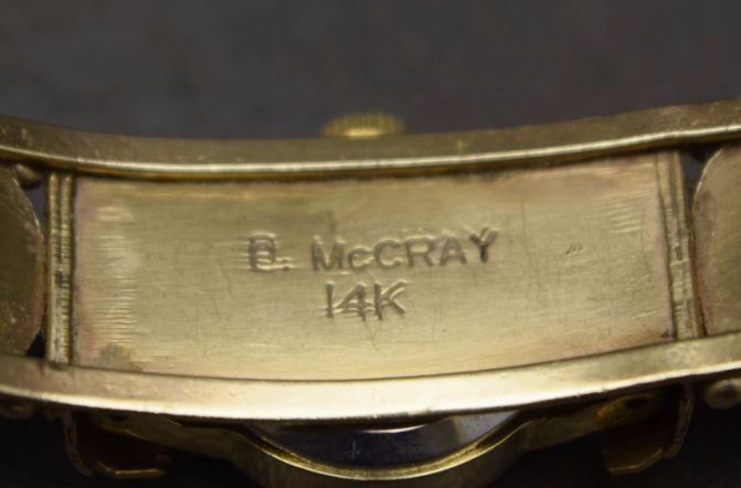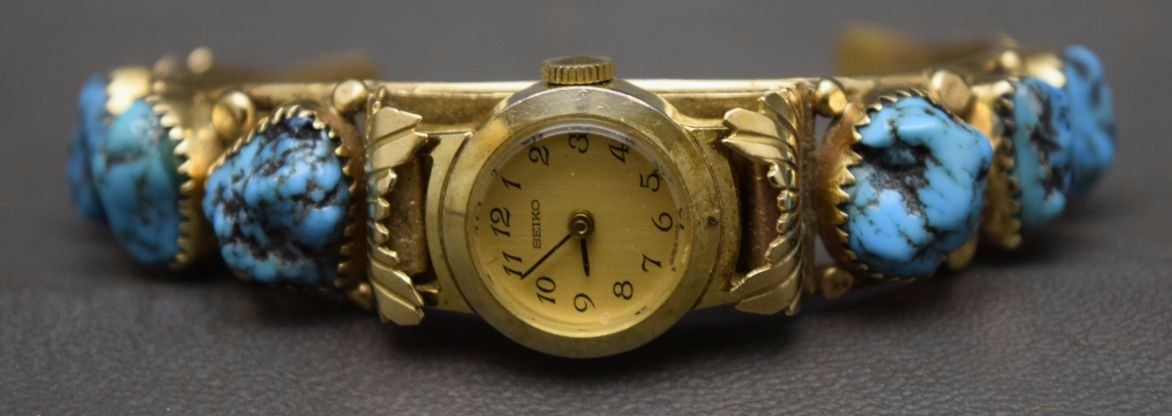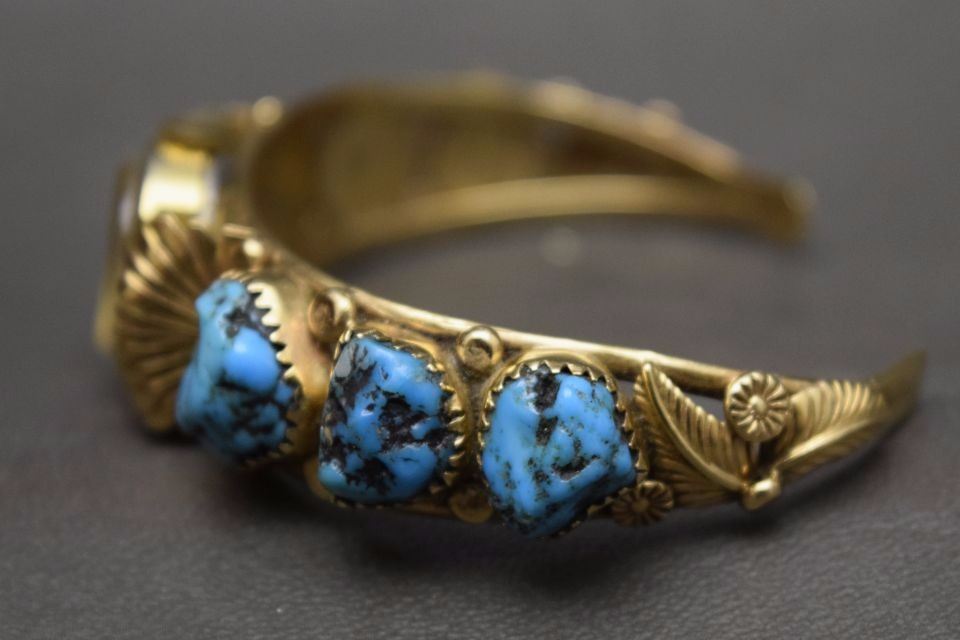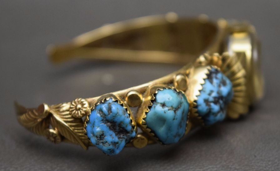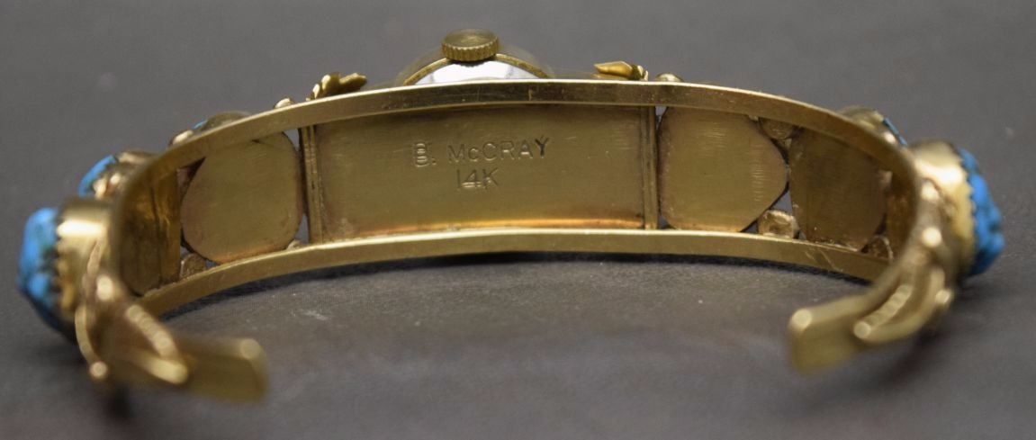 1980's turquoise set in 14k gold signed B . McCray. Watch not working. .5'' x 4.75' x 1.25'' total weight 26 grams