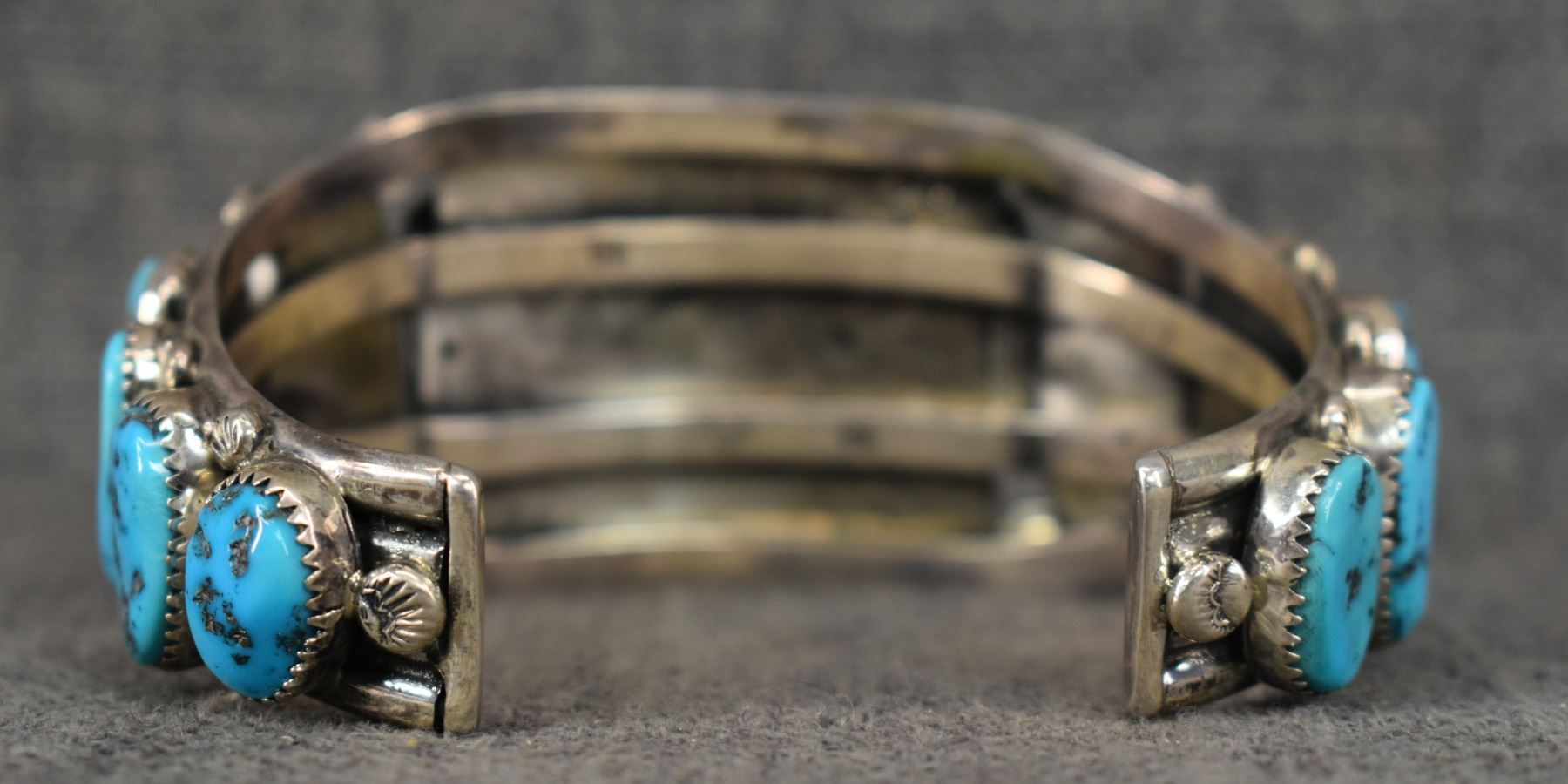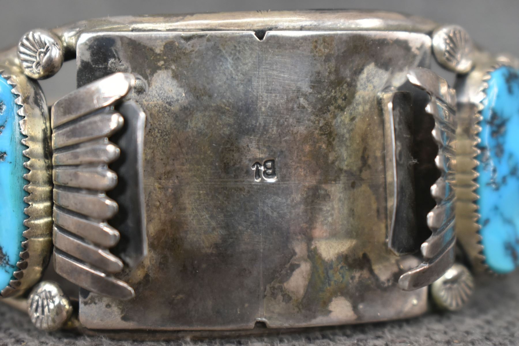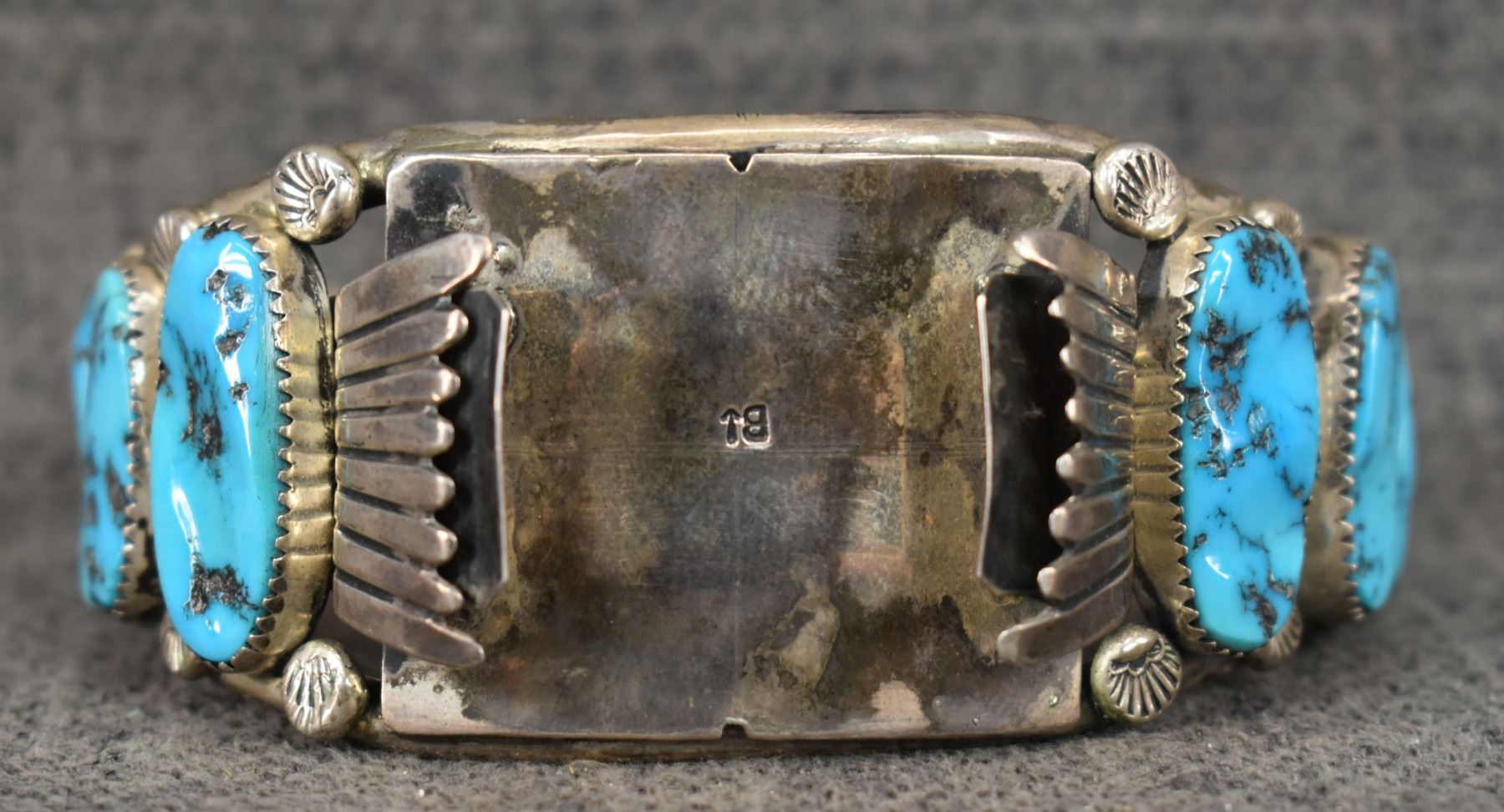 1970's Navajo, Sterling silver stamped design with turquoise stones signed B and an arrow, 1.5" x 6" x 1.5" total weight 94 grams