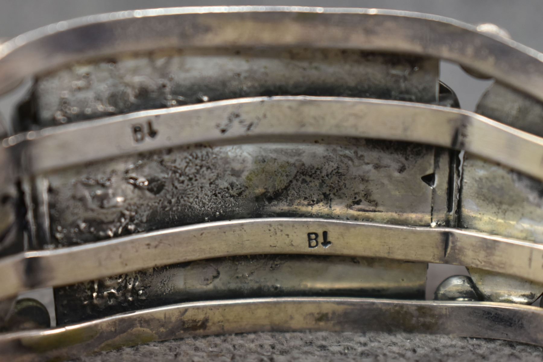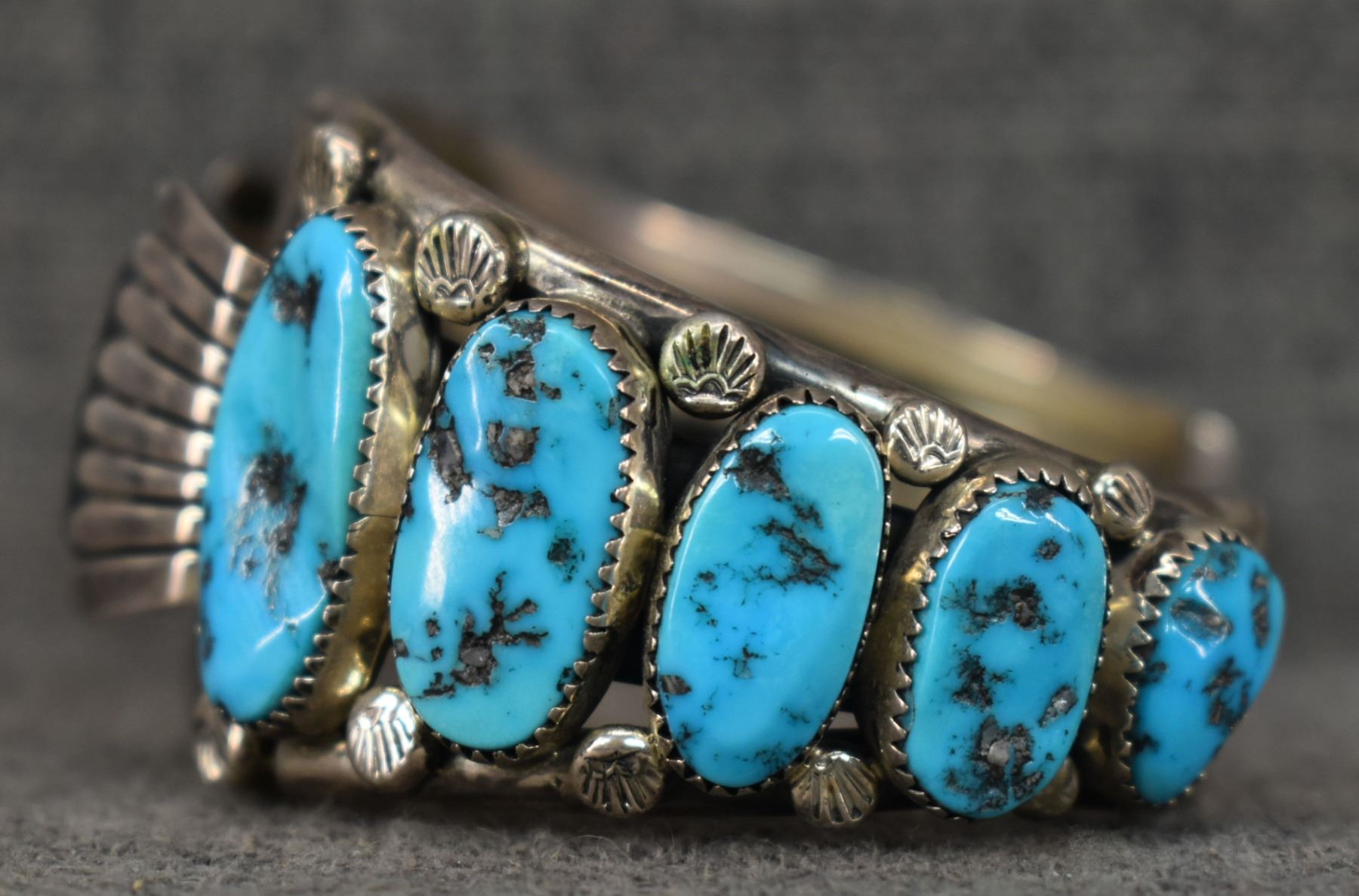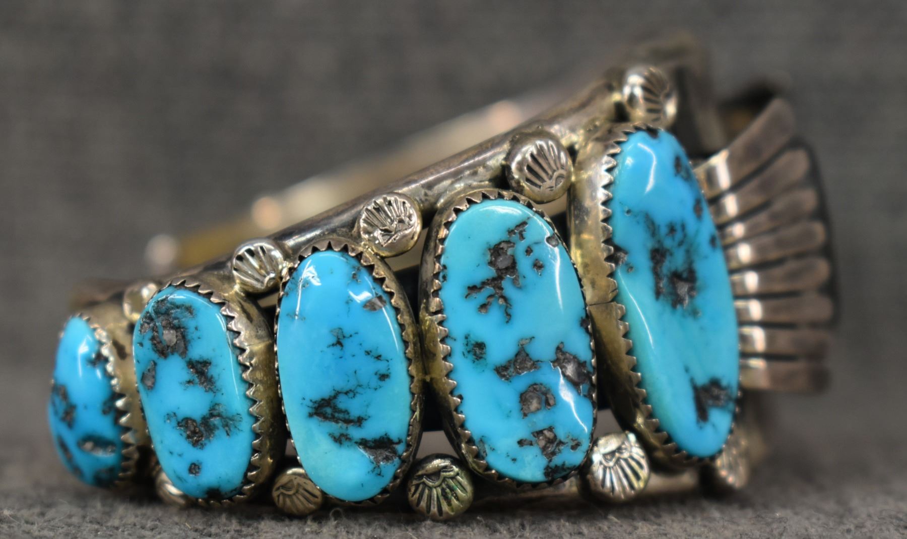1970's Navajo, Sterling silver stamped design with turquoise stones signed B and an arrow, 1.5" x 6" x 1.5" total weight 94 grams