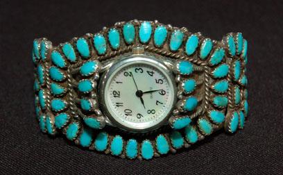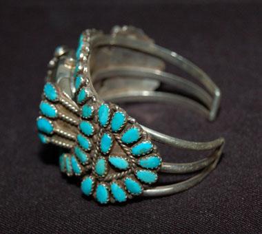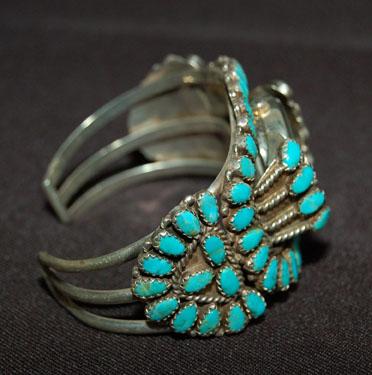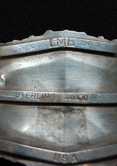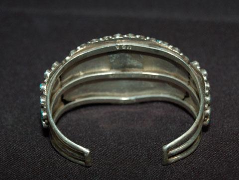 sterling & turquoise, signed V. M. B., 5.25” around, 1.5” wide, 1” opening, 1980’S