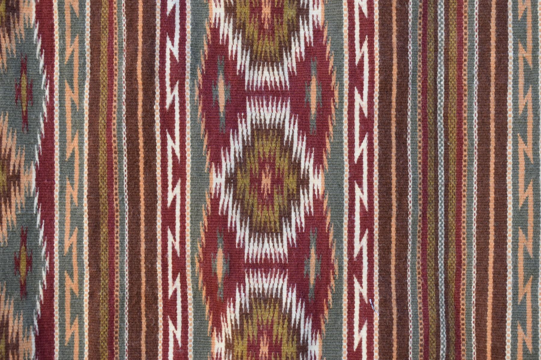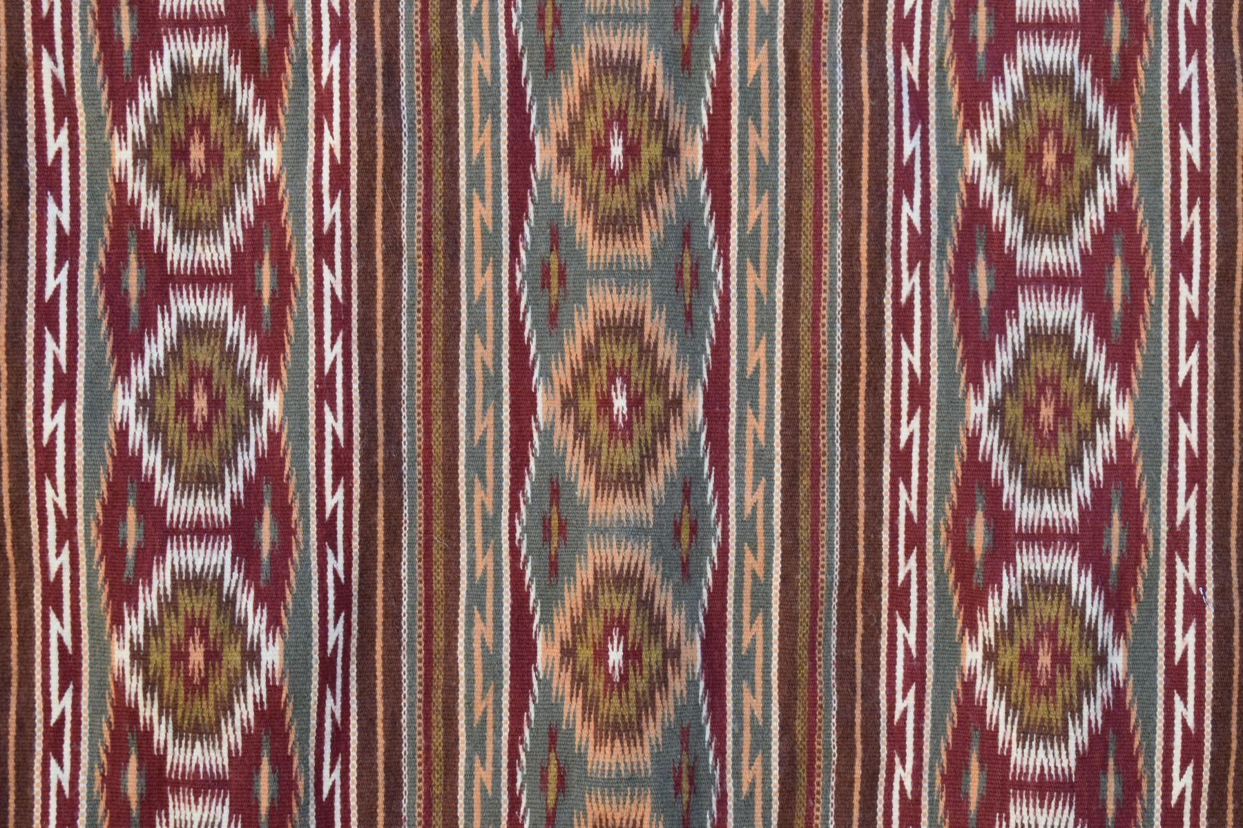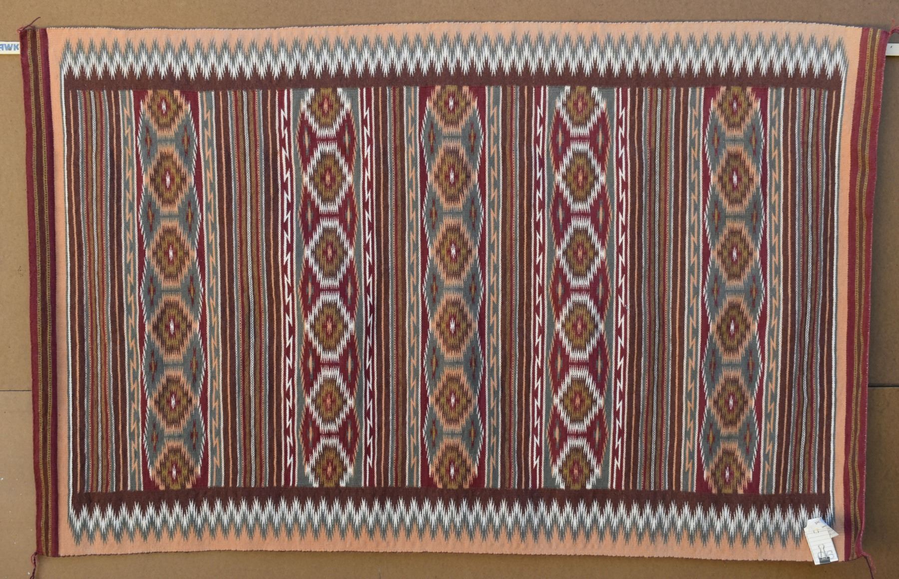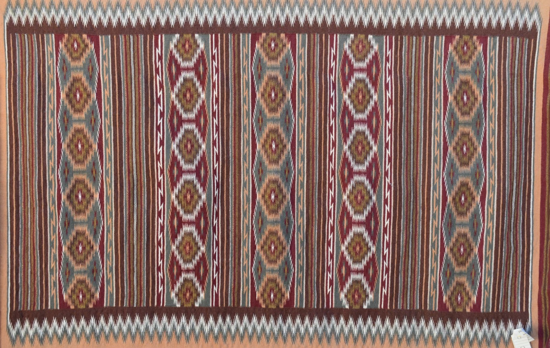 1986 Navajo. Hand woven banded design =wide ruins textile by Lennie Thomas. 62'' x 39'' has A/B sides