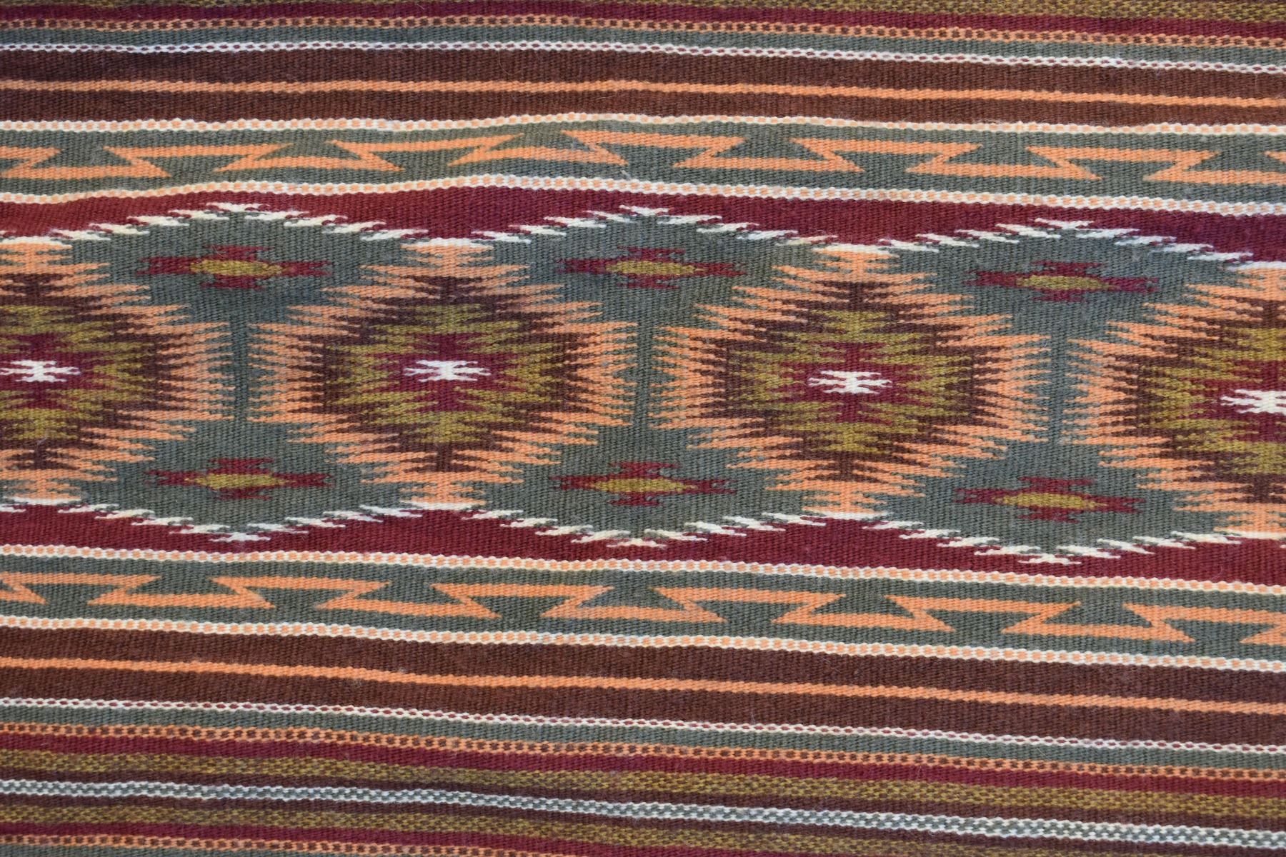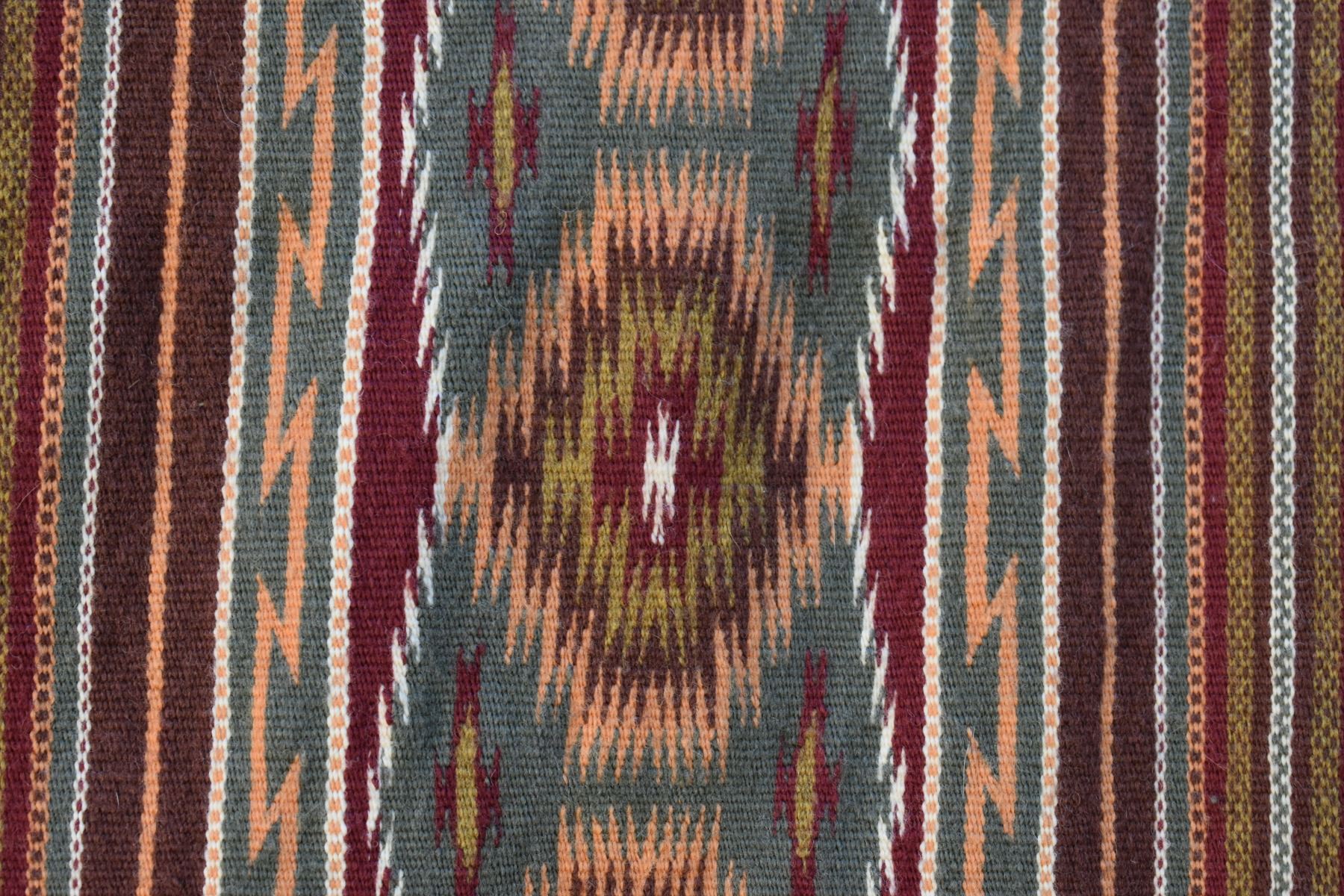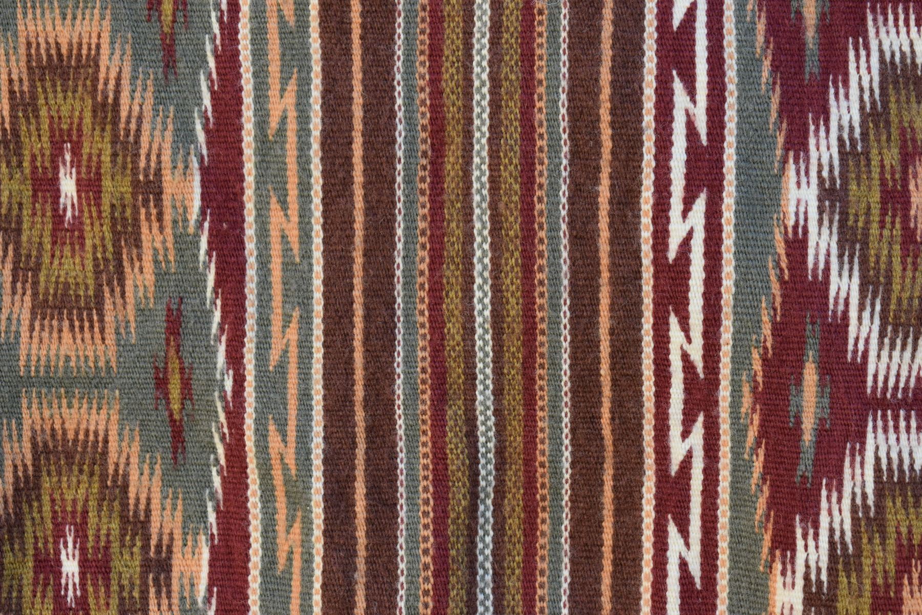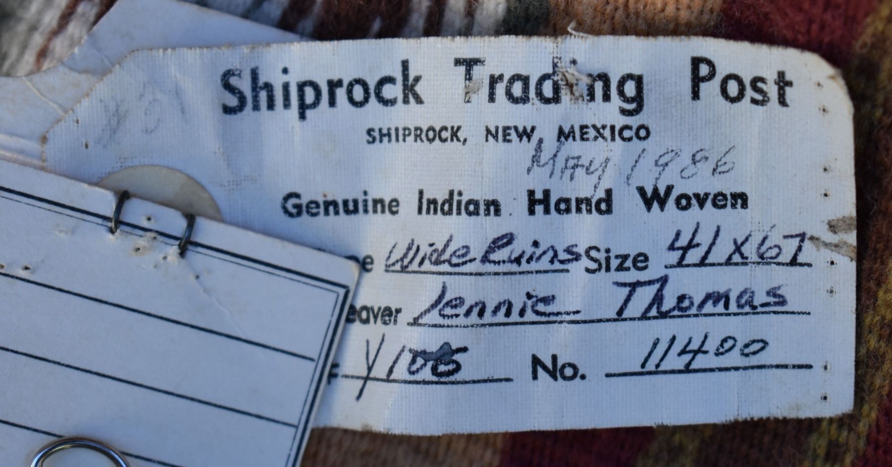 1986 Navajo. Hand woven banded design =wide ruins textile by Lennie Thomas. 62'' x 39'' has A/B sides
