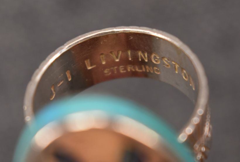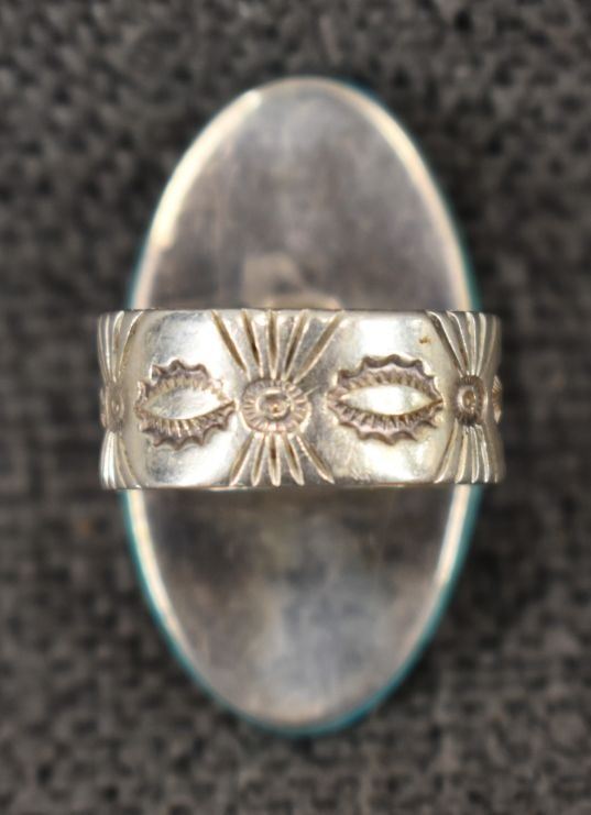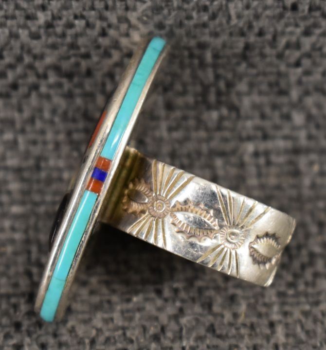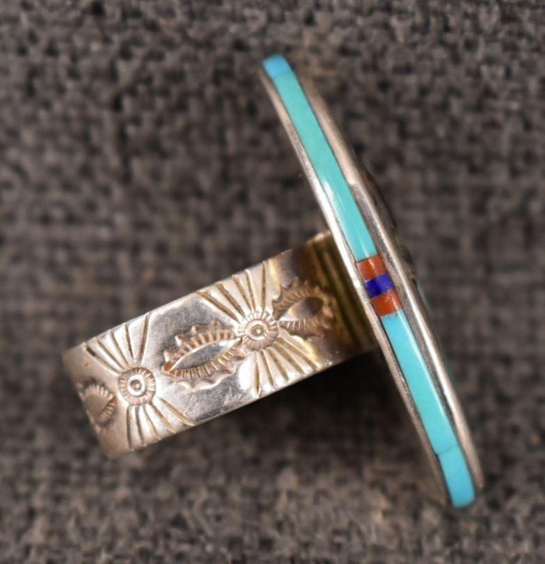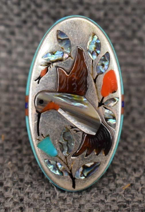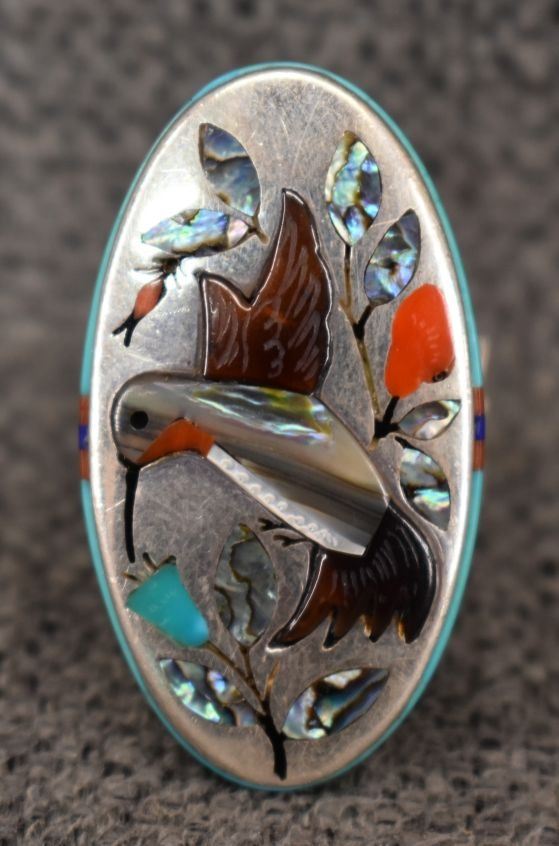 1980's Navajo/Zuni, sterling silver stamped design on band with inlaid turquoise shell and coral hummingbird and floral design 1.5" x .75" size 10 total weight 23 grams
