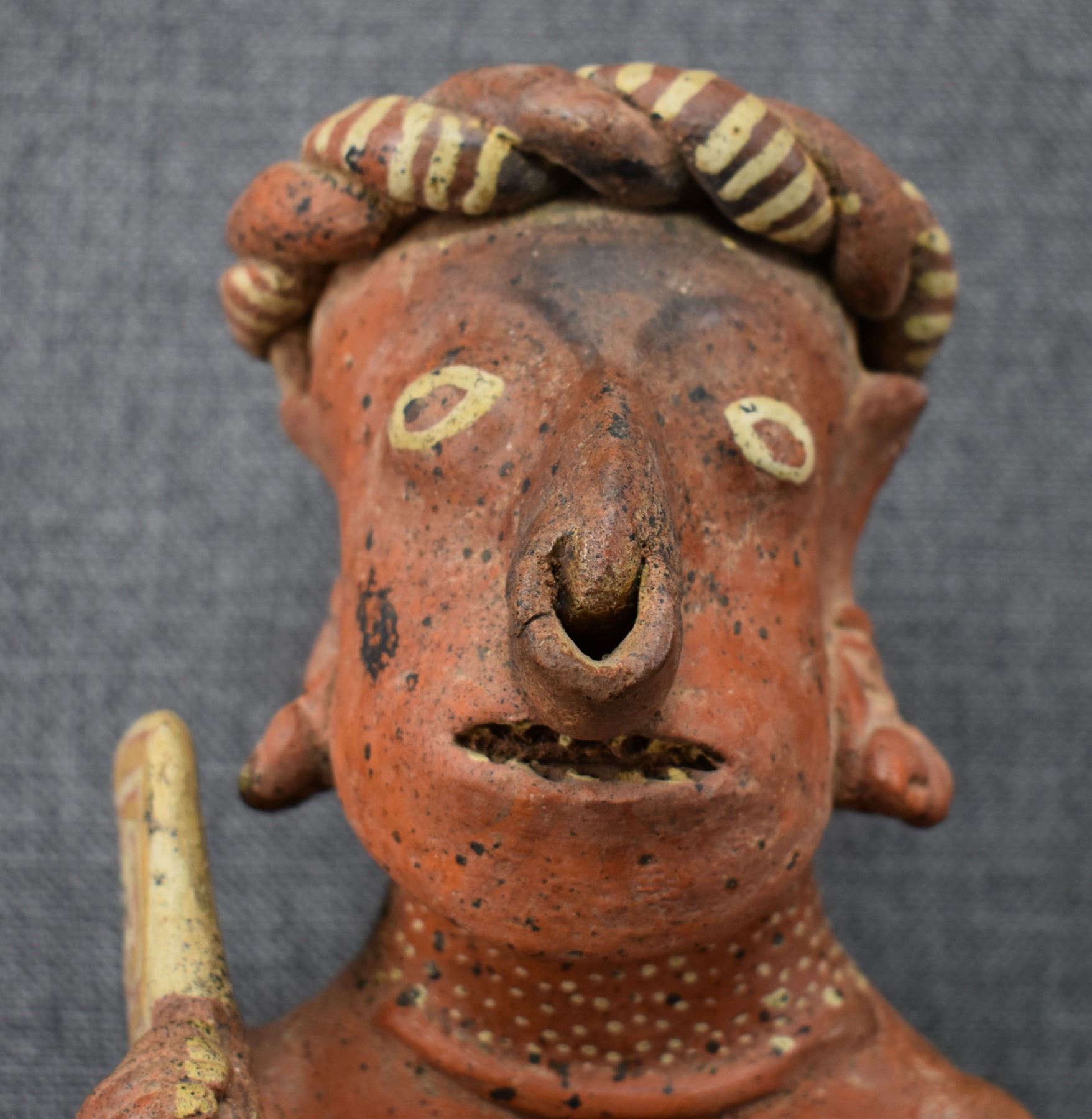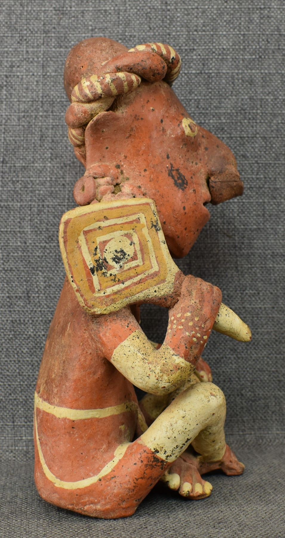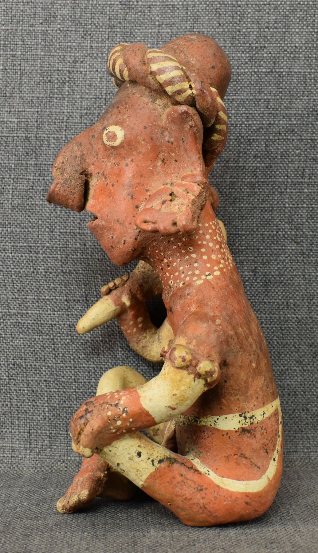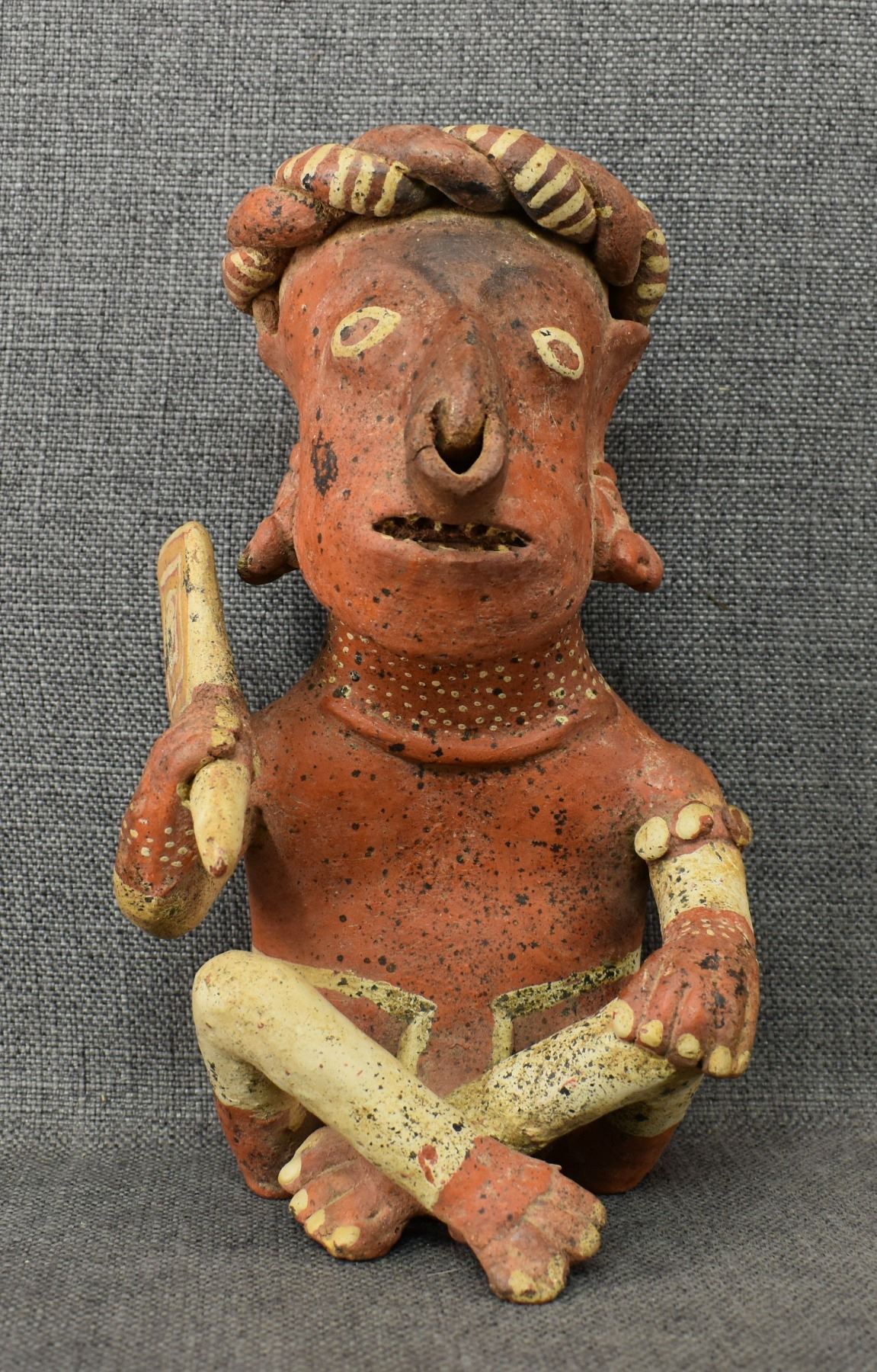 100 BC–500 AD Nayarit. Hand made and painted seated figure. 10'' x 6'' x 6''.Has restoration