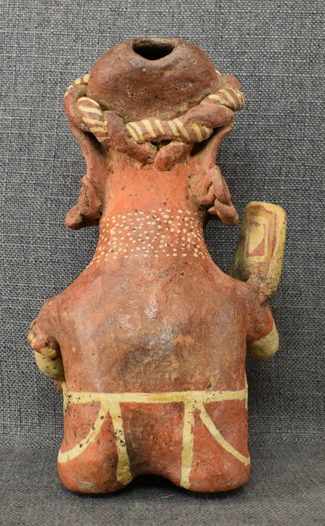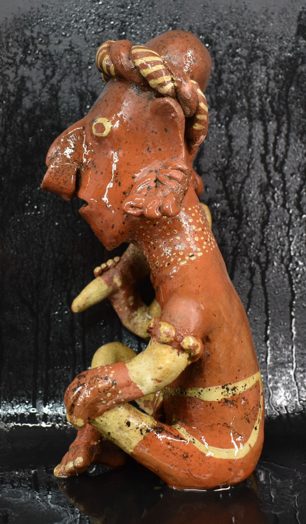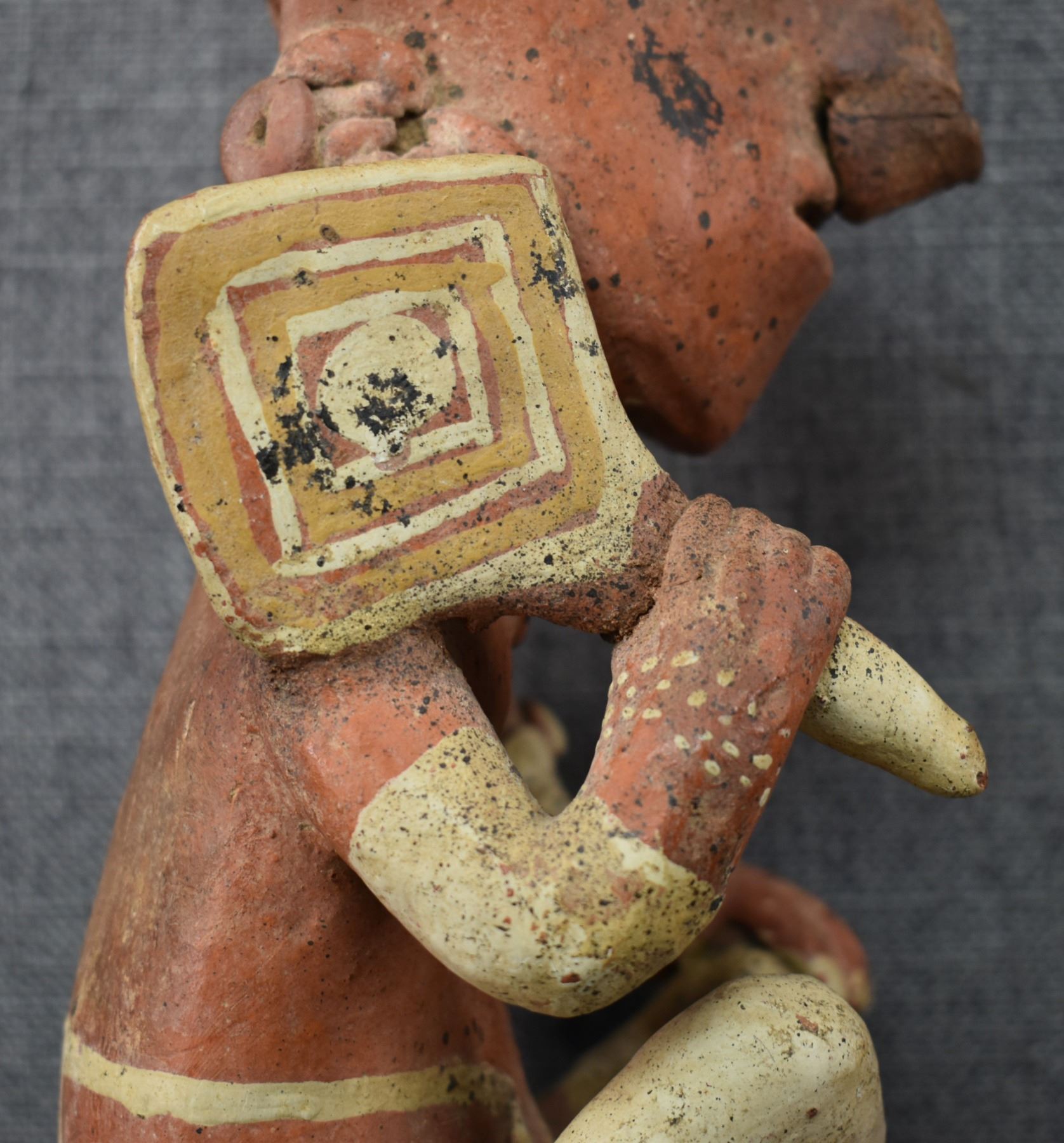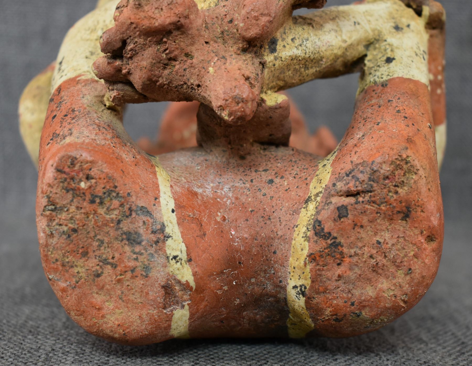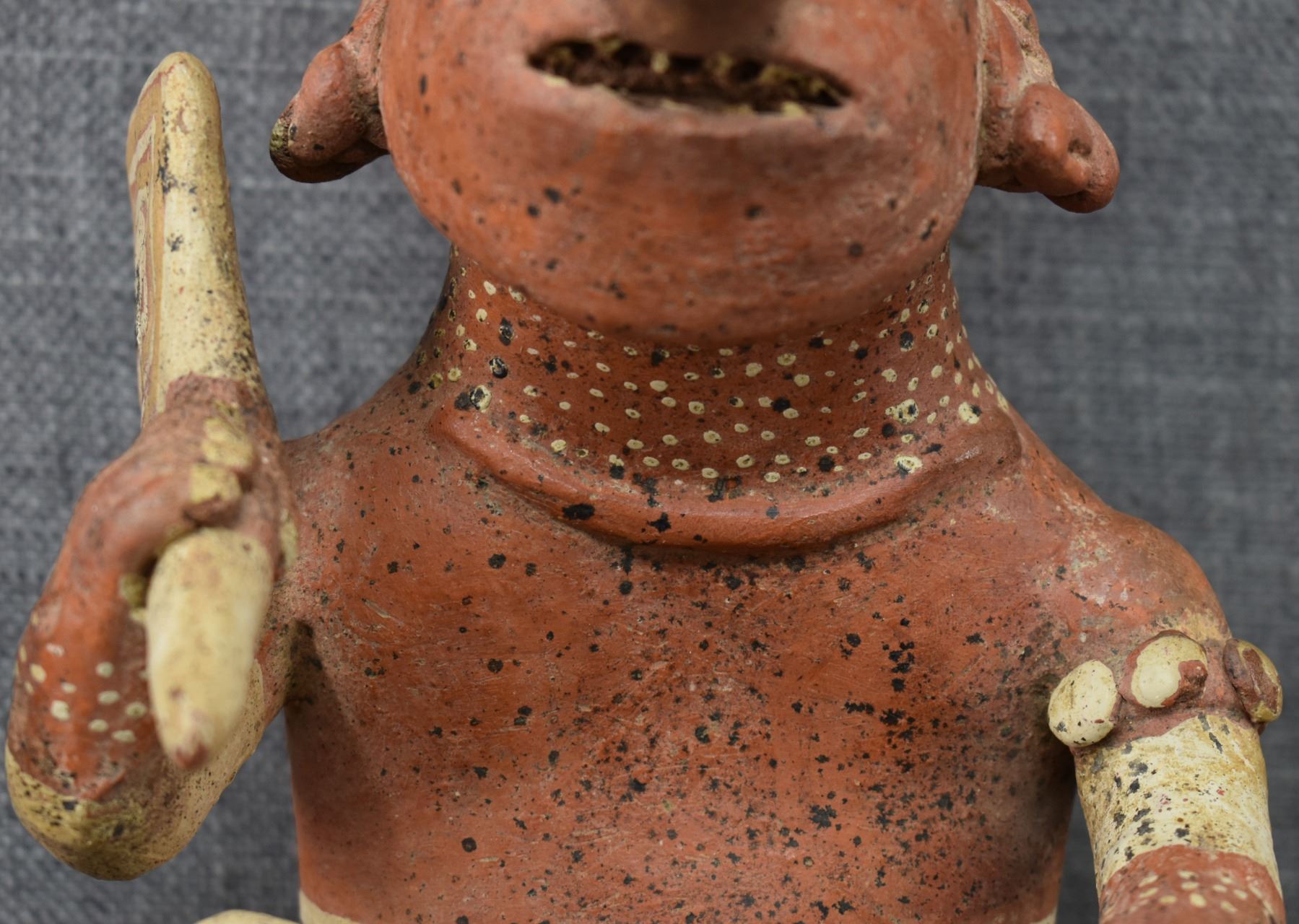 100 BC–500 AD Nayarit. Hand made and painted seated figure. 10'' x 6'' x 6''.Has restoration