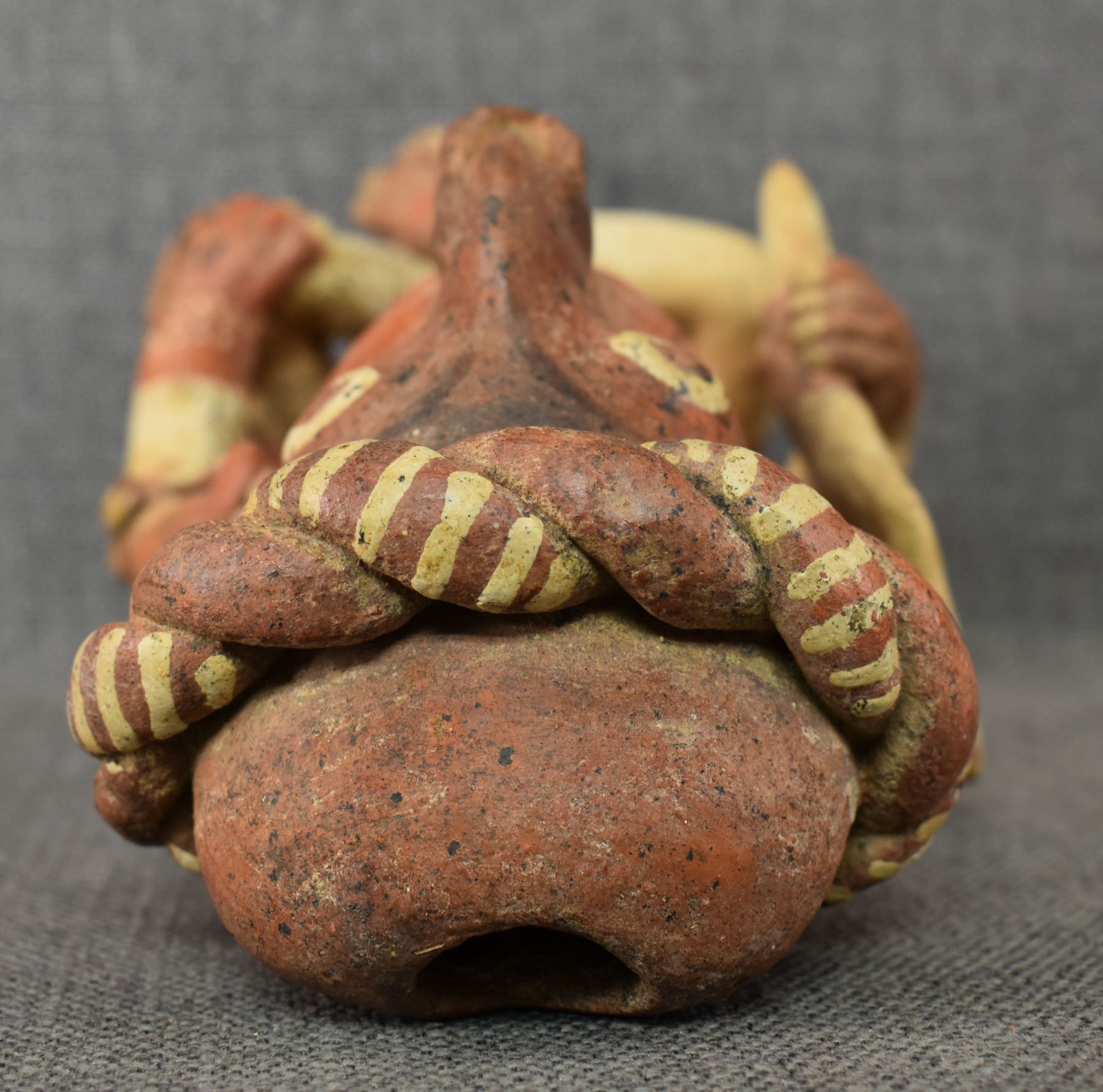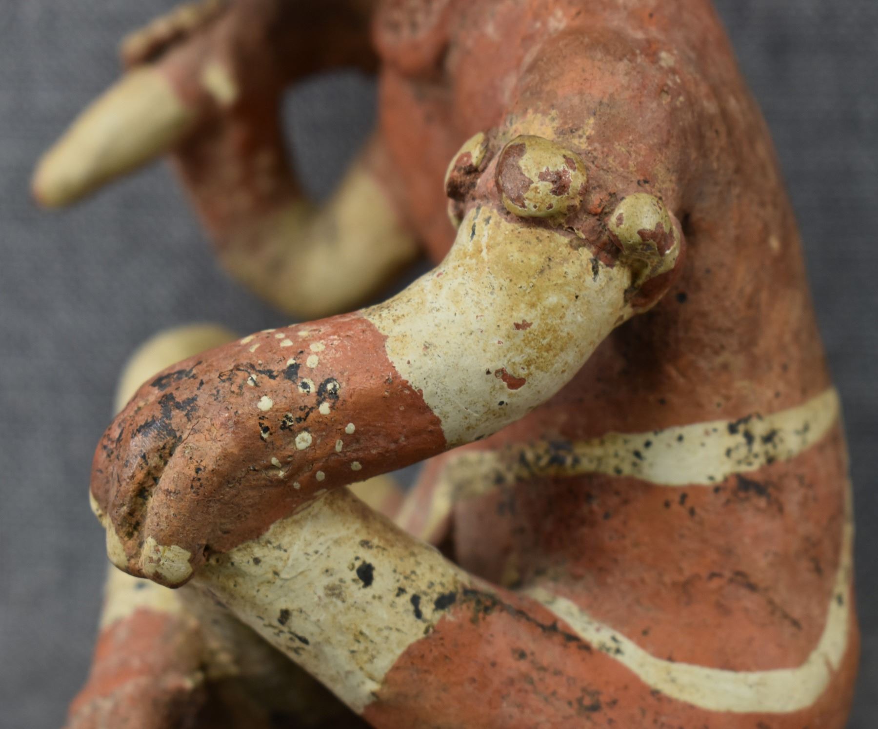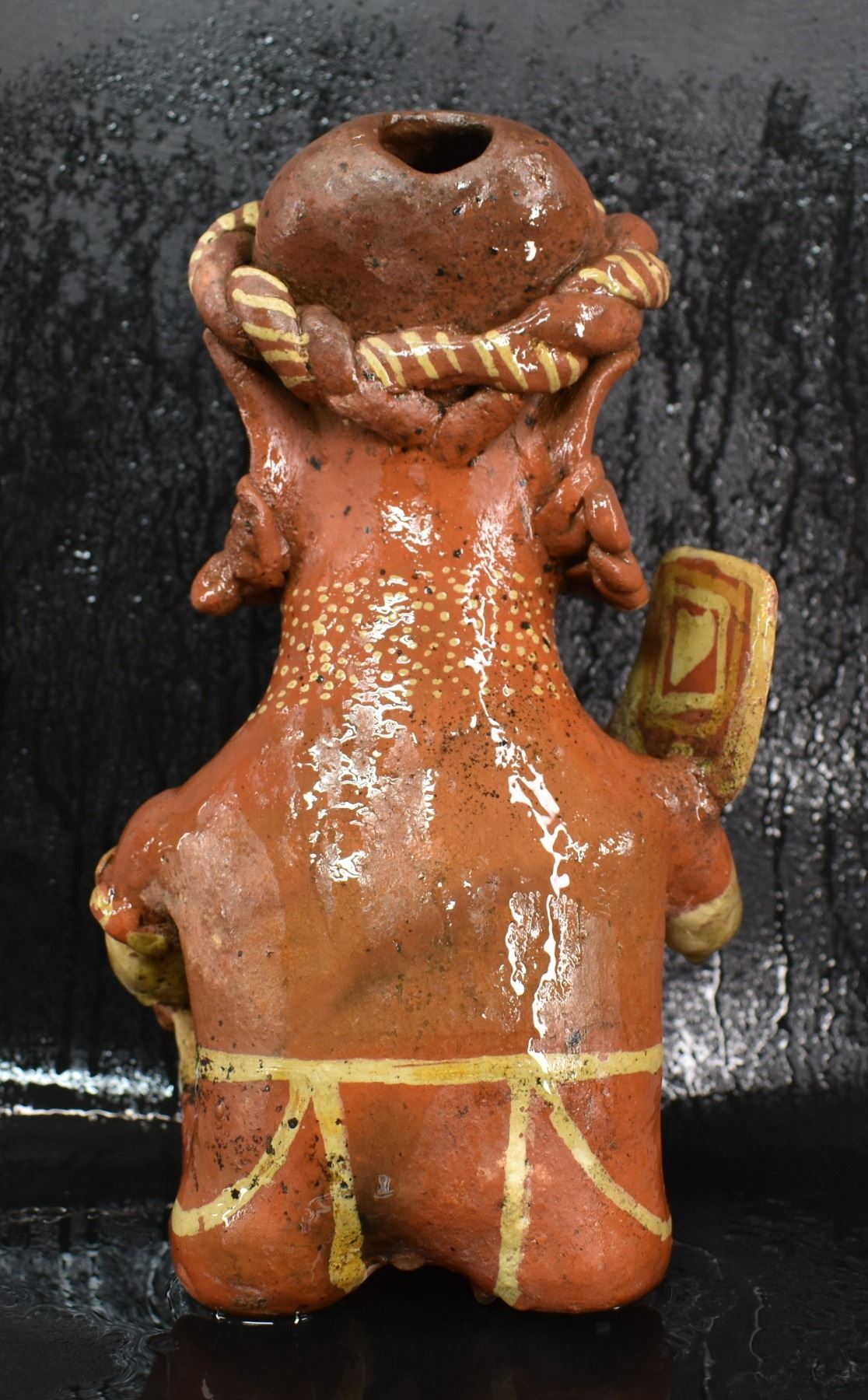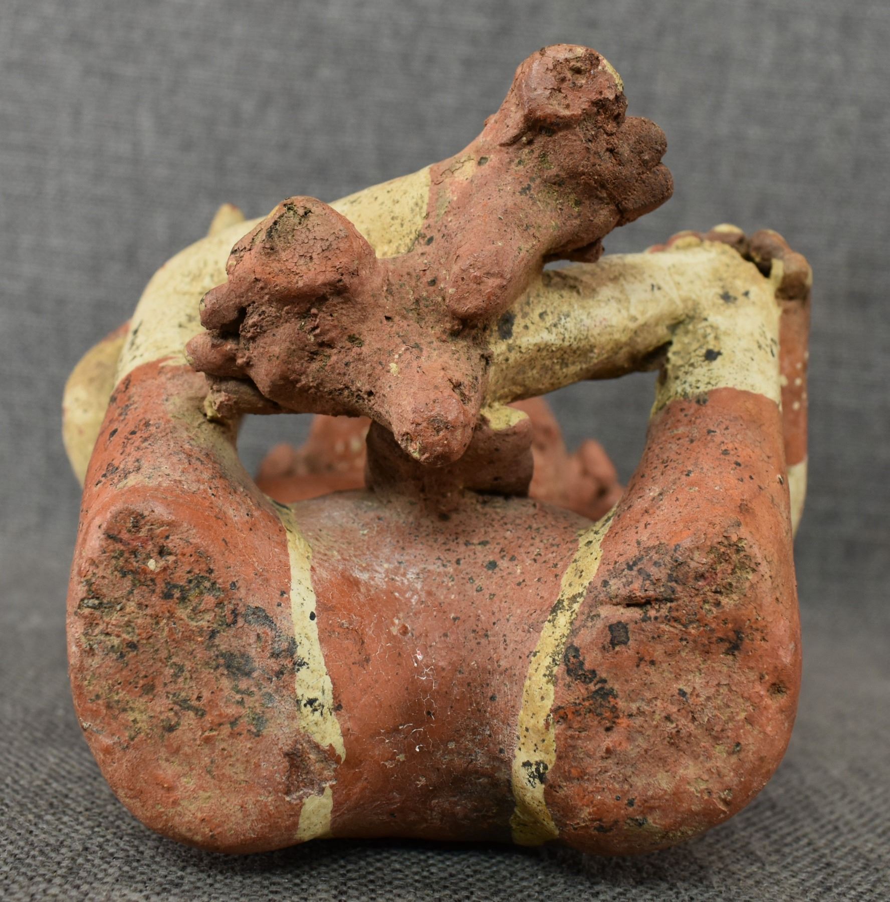 100 BC–500 AD Nayarit. Hand made and painted seated figure. 10'' x 6'' x 6''.Has restoration