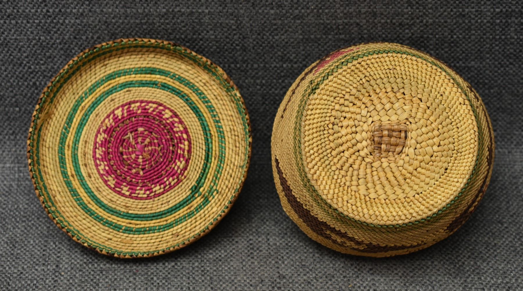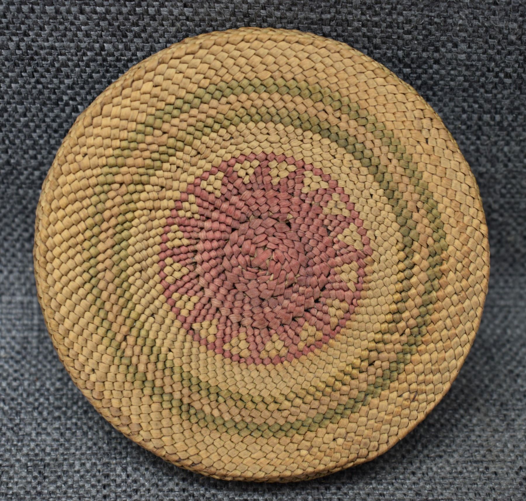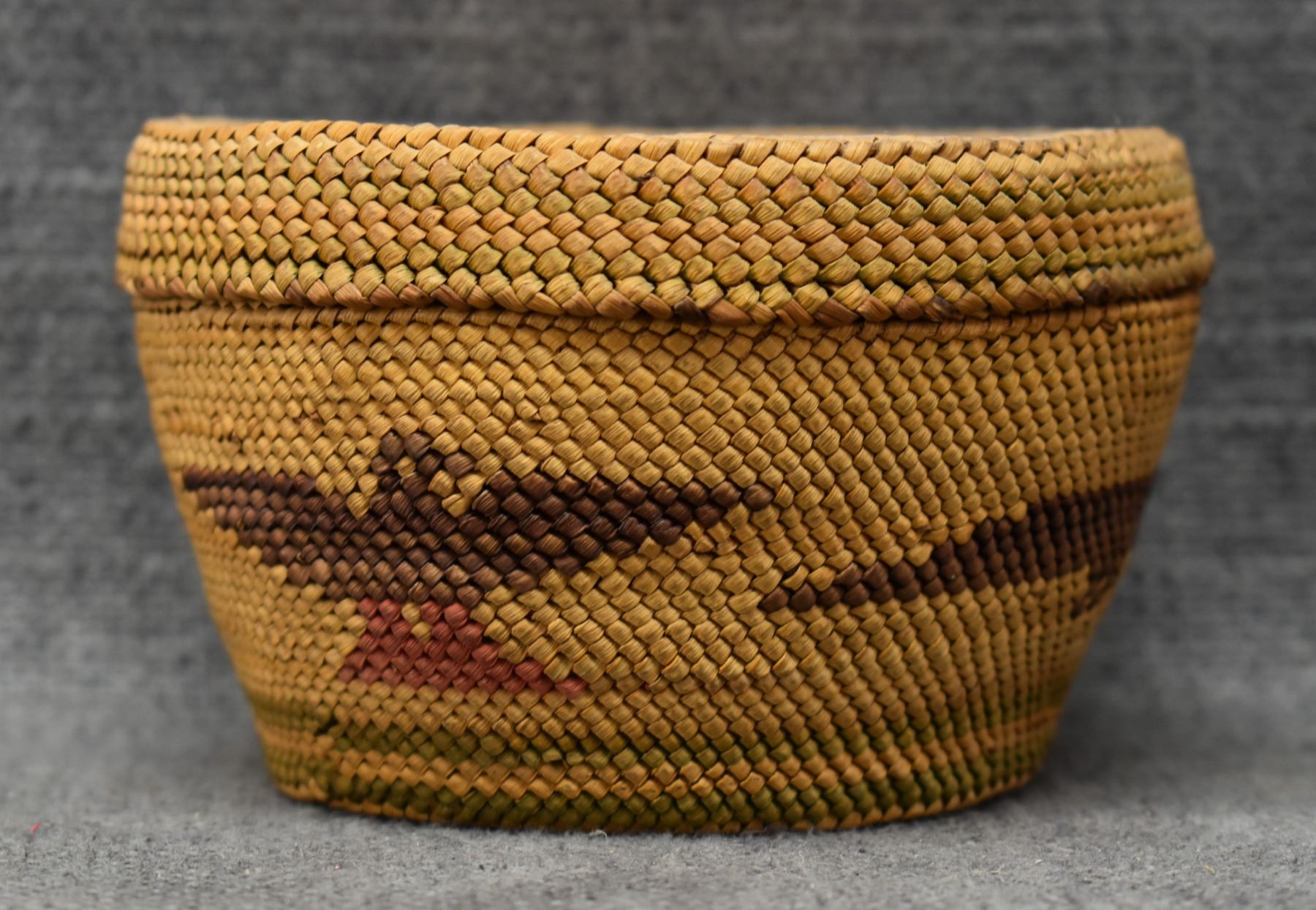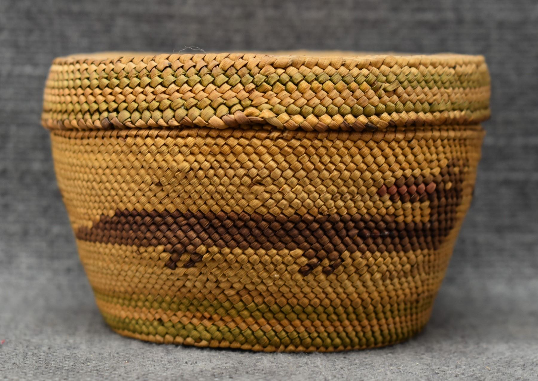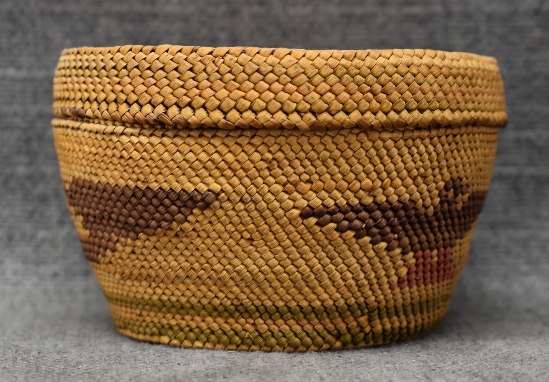 1960's Nootka/Makah. Hamd woven polychrome design lidded basket. 2.5'' x 4.25''