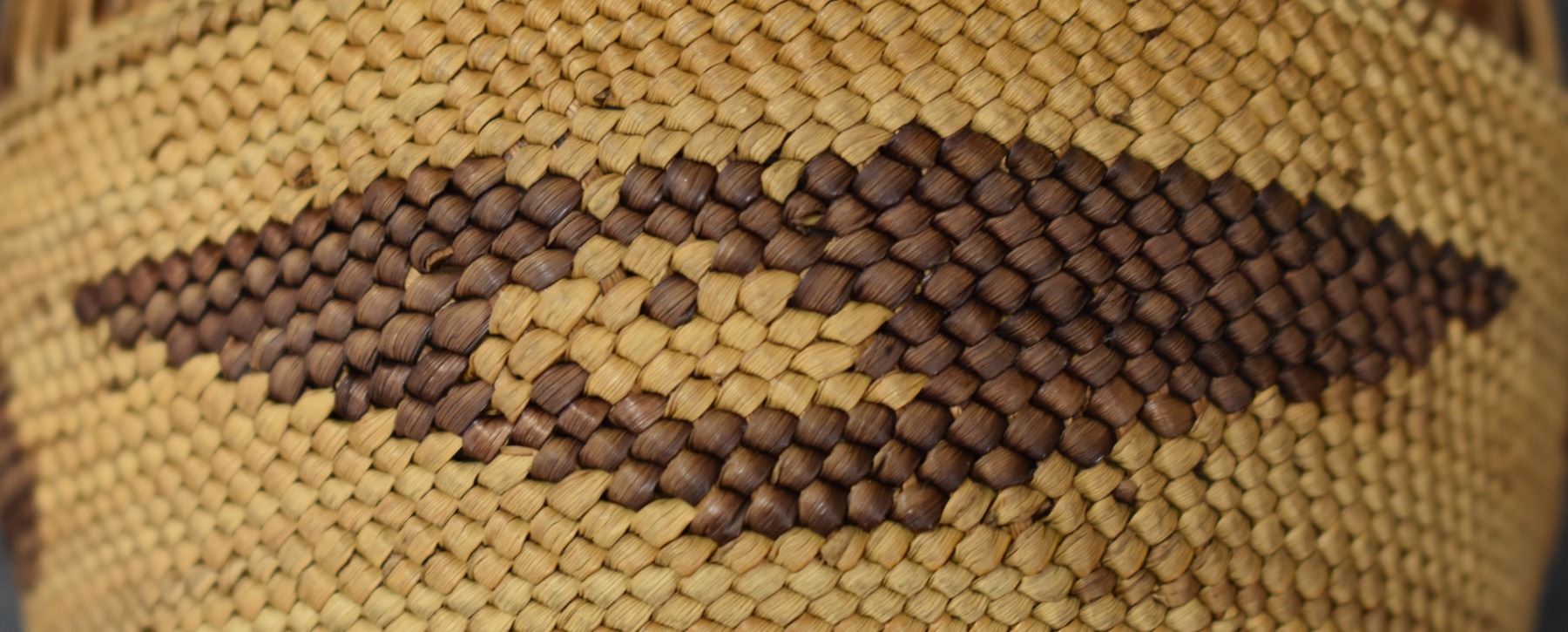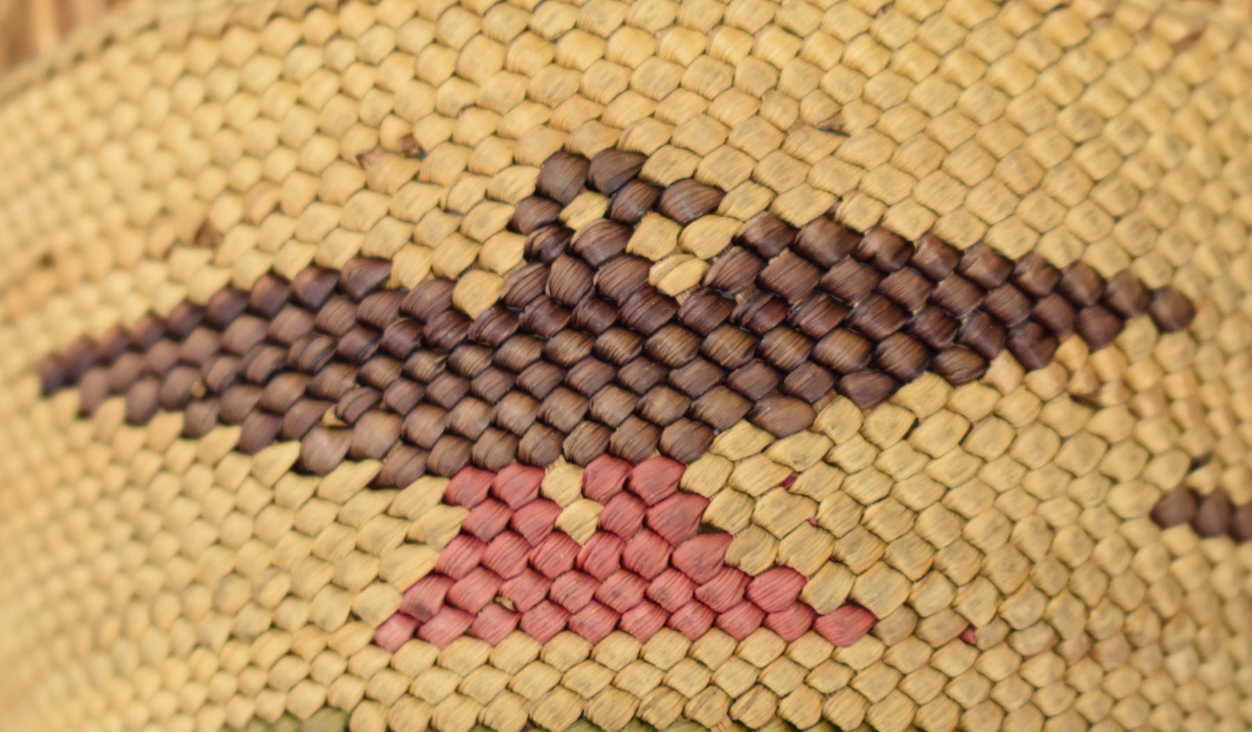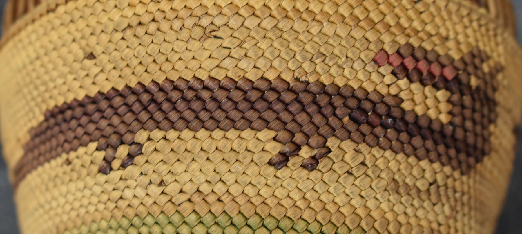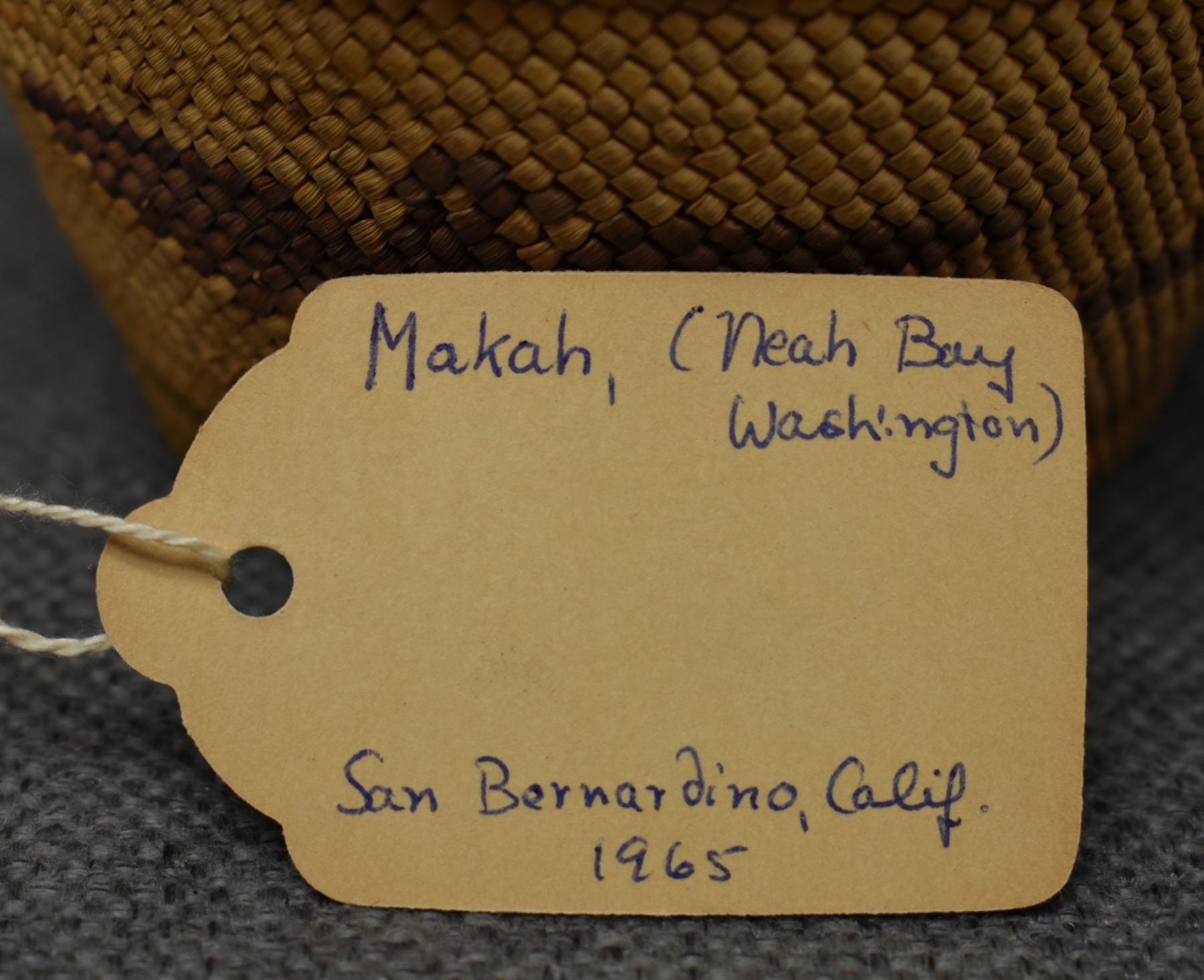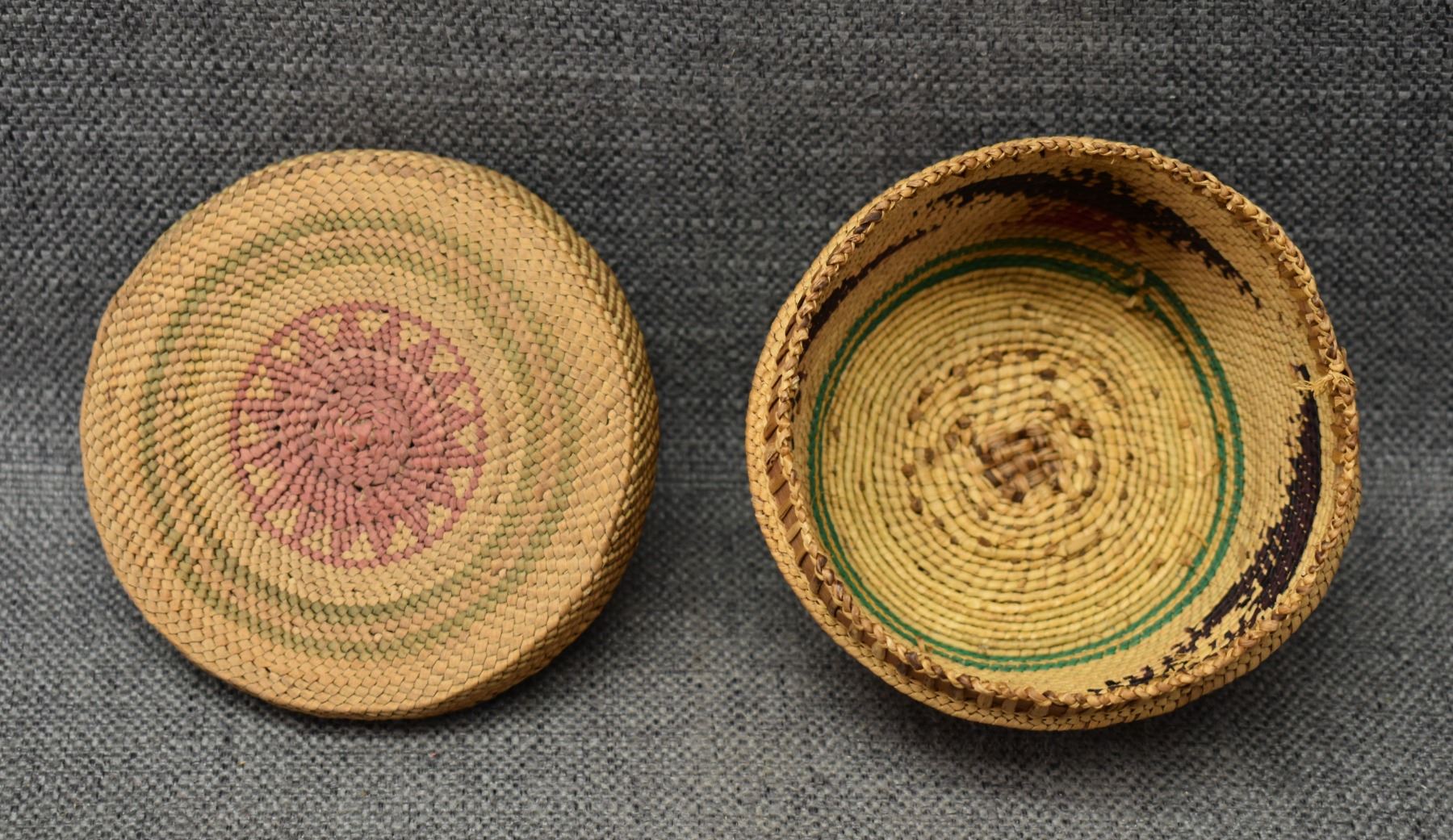 1960's Nootka/Makah. Hamd woven polychrome design lidded basket. 2.5'' x 4.25''