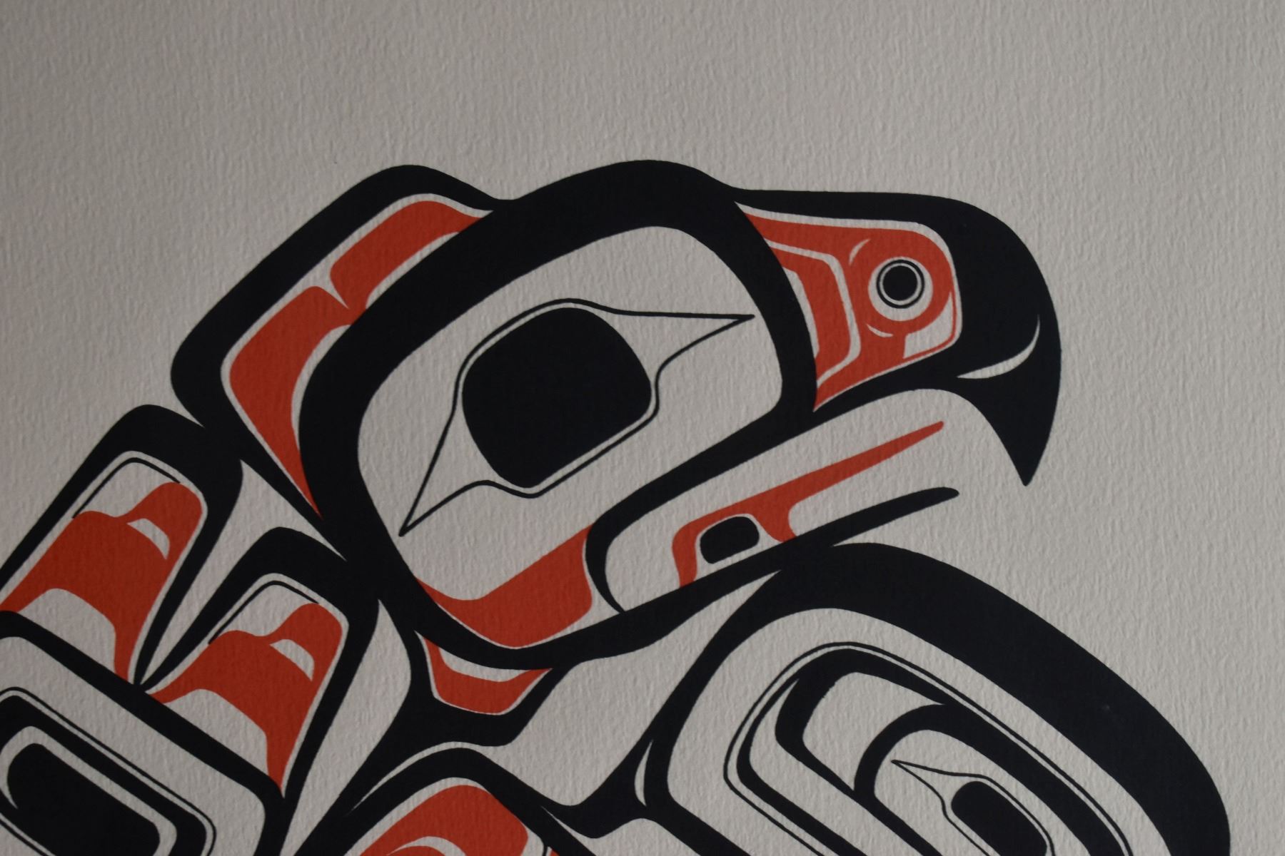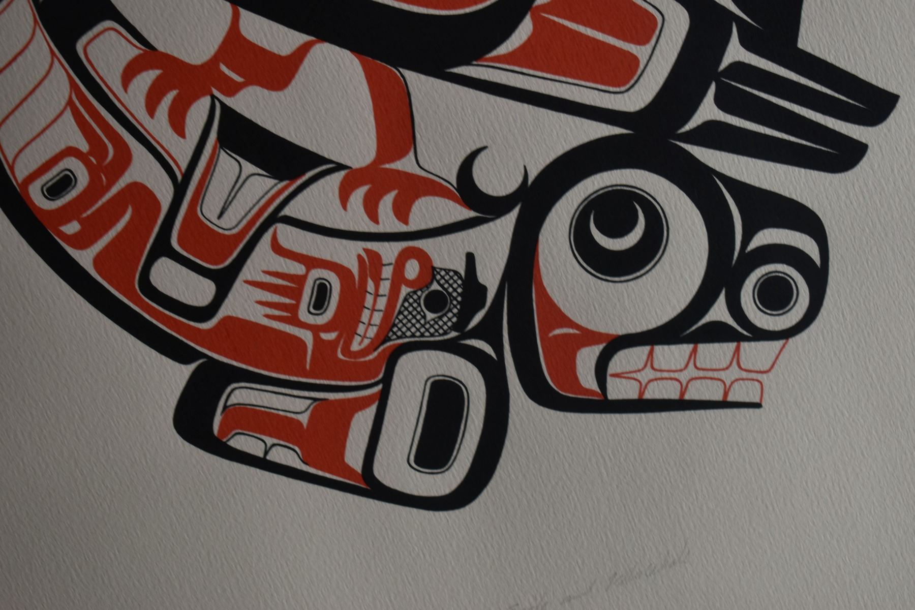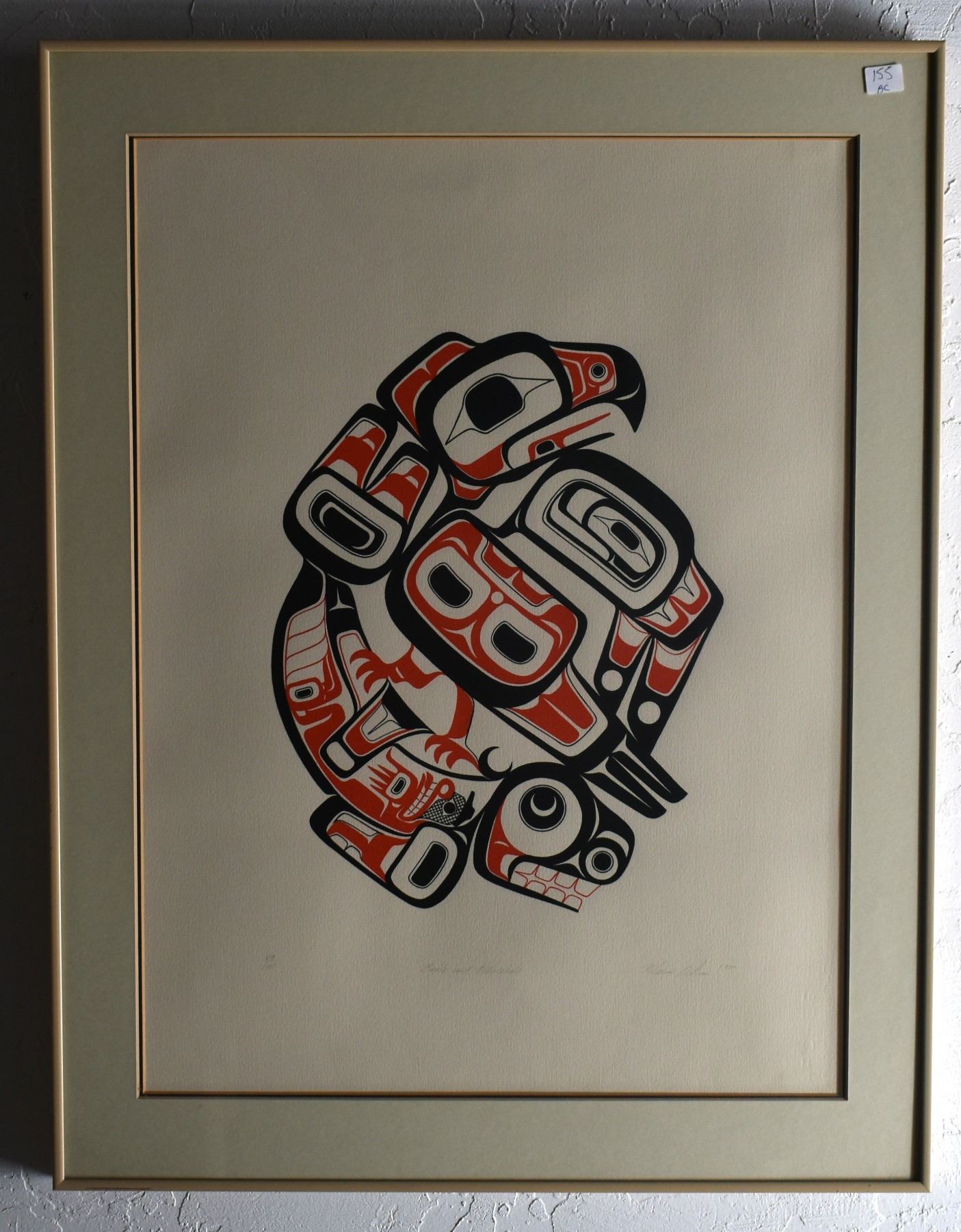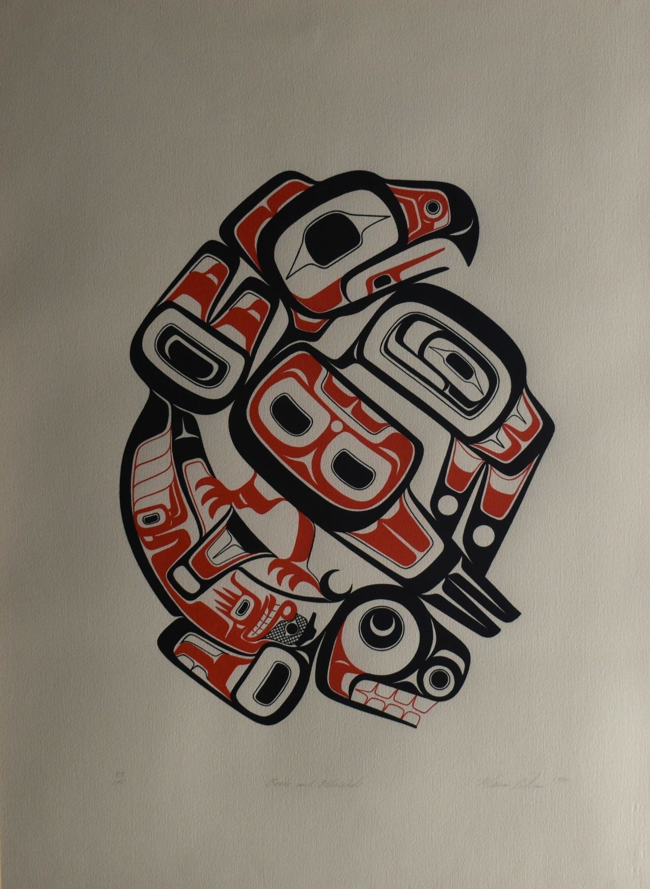 1980. north west coast. Hand signed and numbered 89/195 depicting raven and killer whale. Signature is unreadable. 23'' x 17'' frame size 28'' x 21''