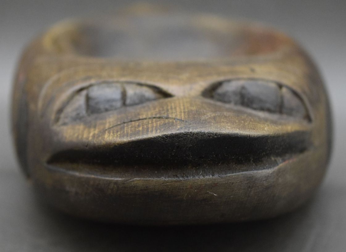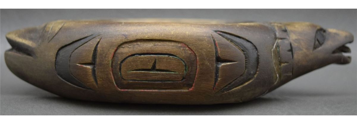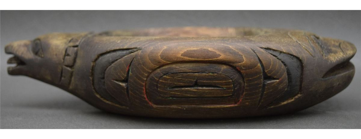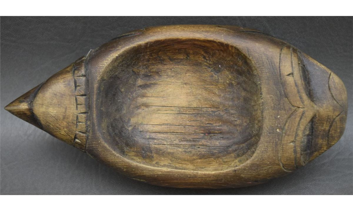 1960's hand carved wooden bowl depicting animals has traces of painted design1.5'' x 7.5'' x 3.25'''
