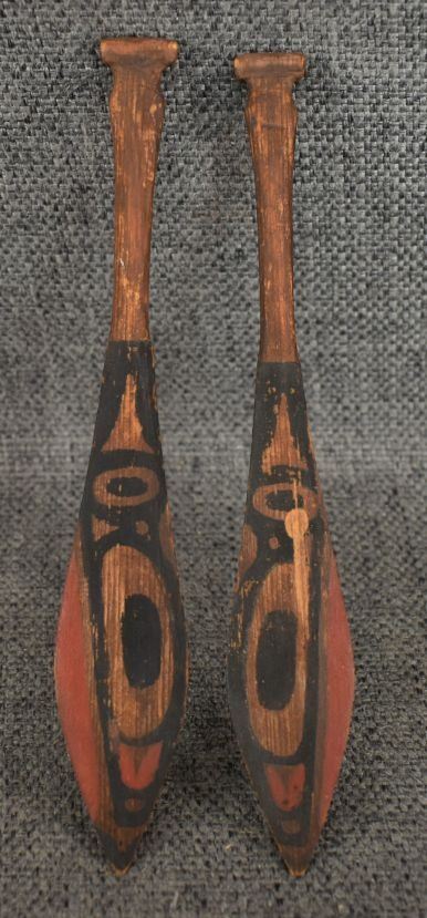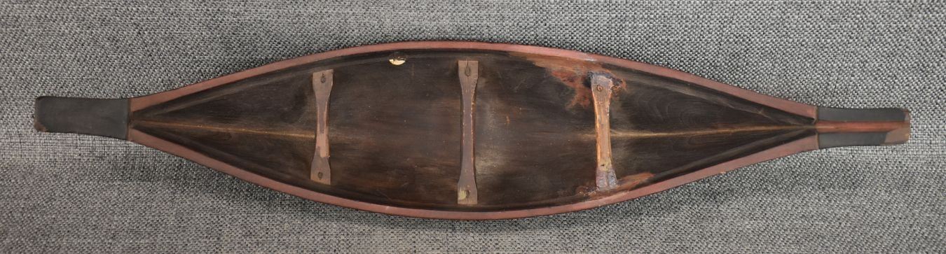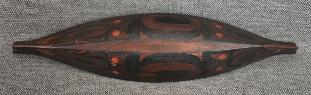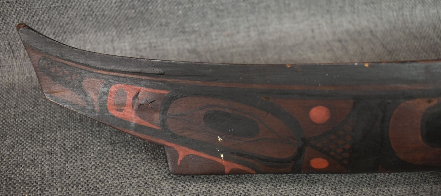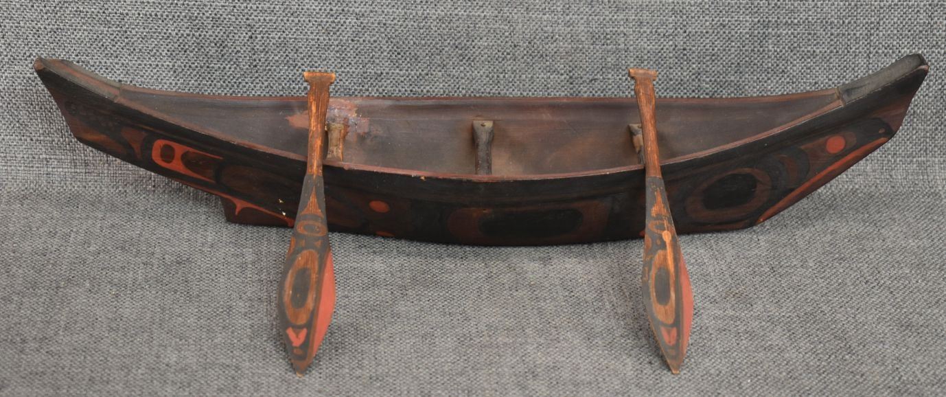 1950's Northwest coast, hand carved and painted toy canoe and paddles. 3.5" x 17" x 3.75"