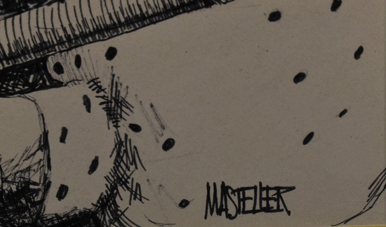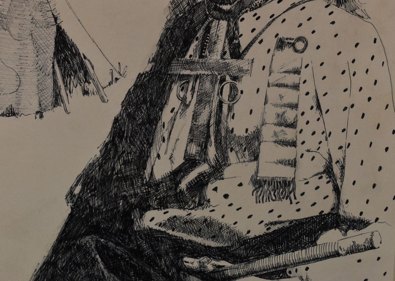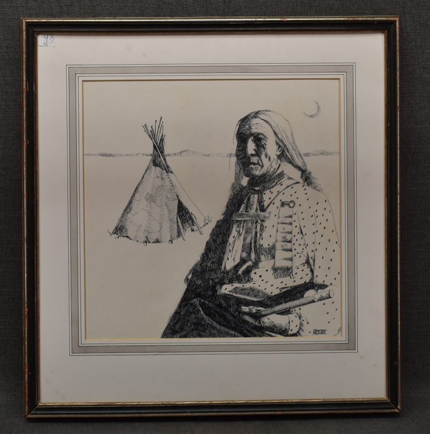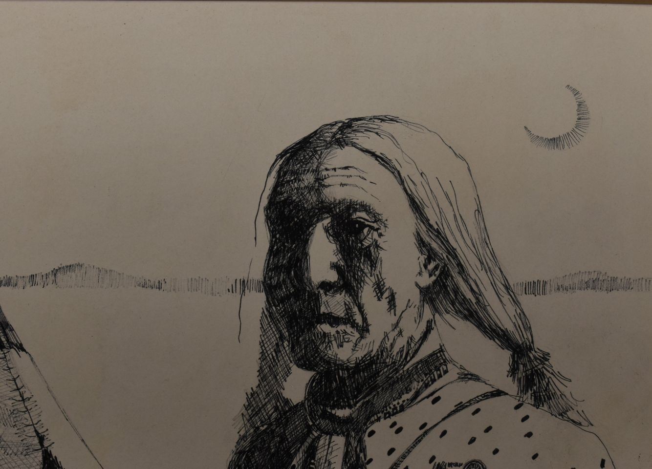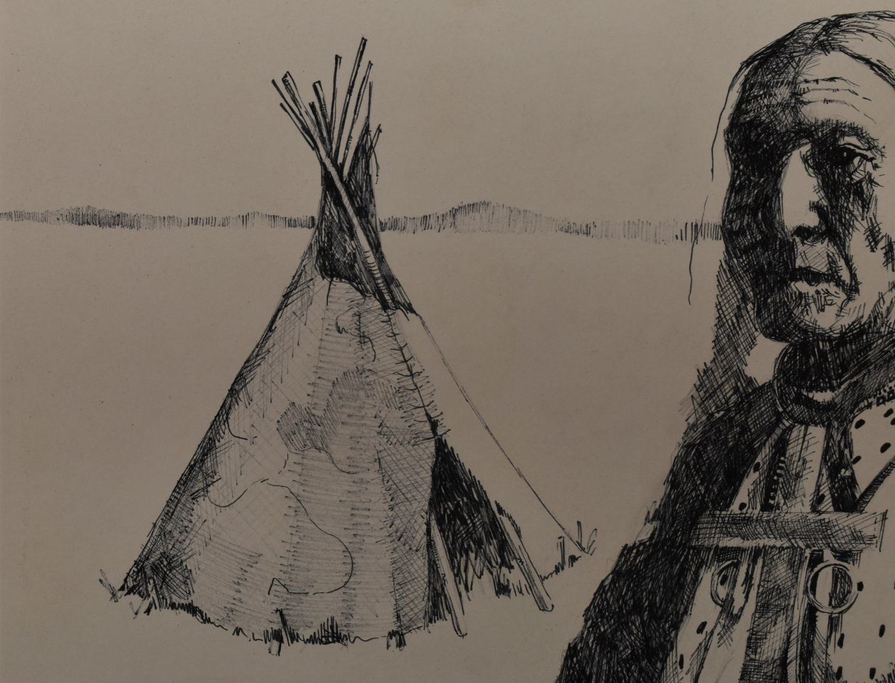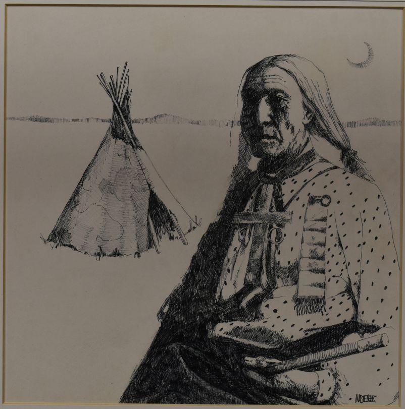 1960's original pen and ink depicting Native and teepee signed Masteller 13.75" x 13.75" framed to 21.5" x 20.5"