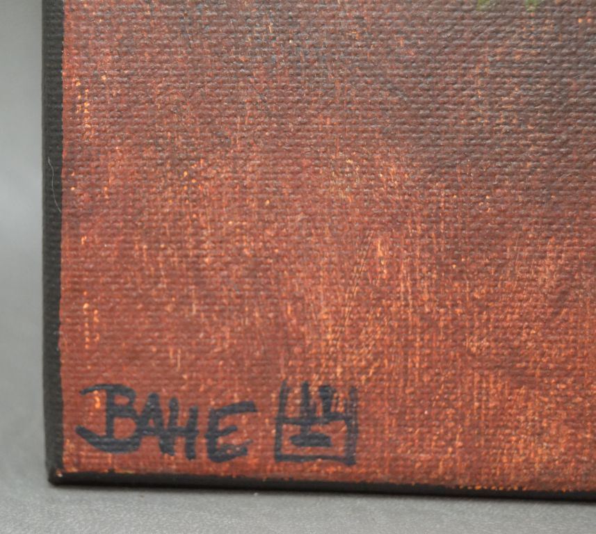1990's hand painted acrylic on canvas of yei kachina face signed Bahe and logo for Al Bahe 14" x 11"
