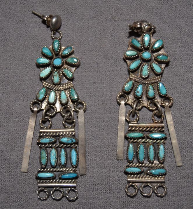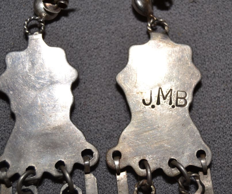 1950-60s sterling silver with petit point turquoise with dangles, 3" long by .75" wide signed J.M.B.