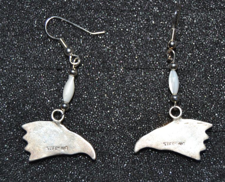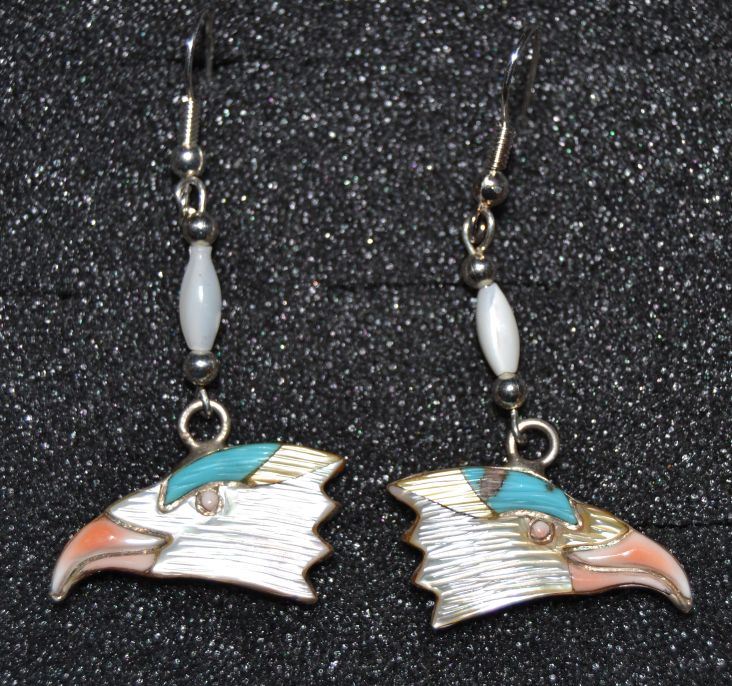 1970s sterling silver eagle heads with mother of pearl, shell and turquoise .5" x .75"