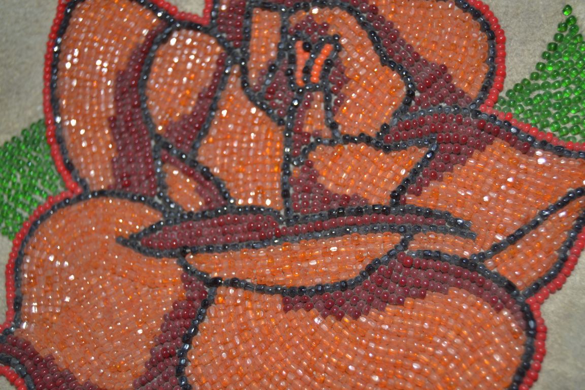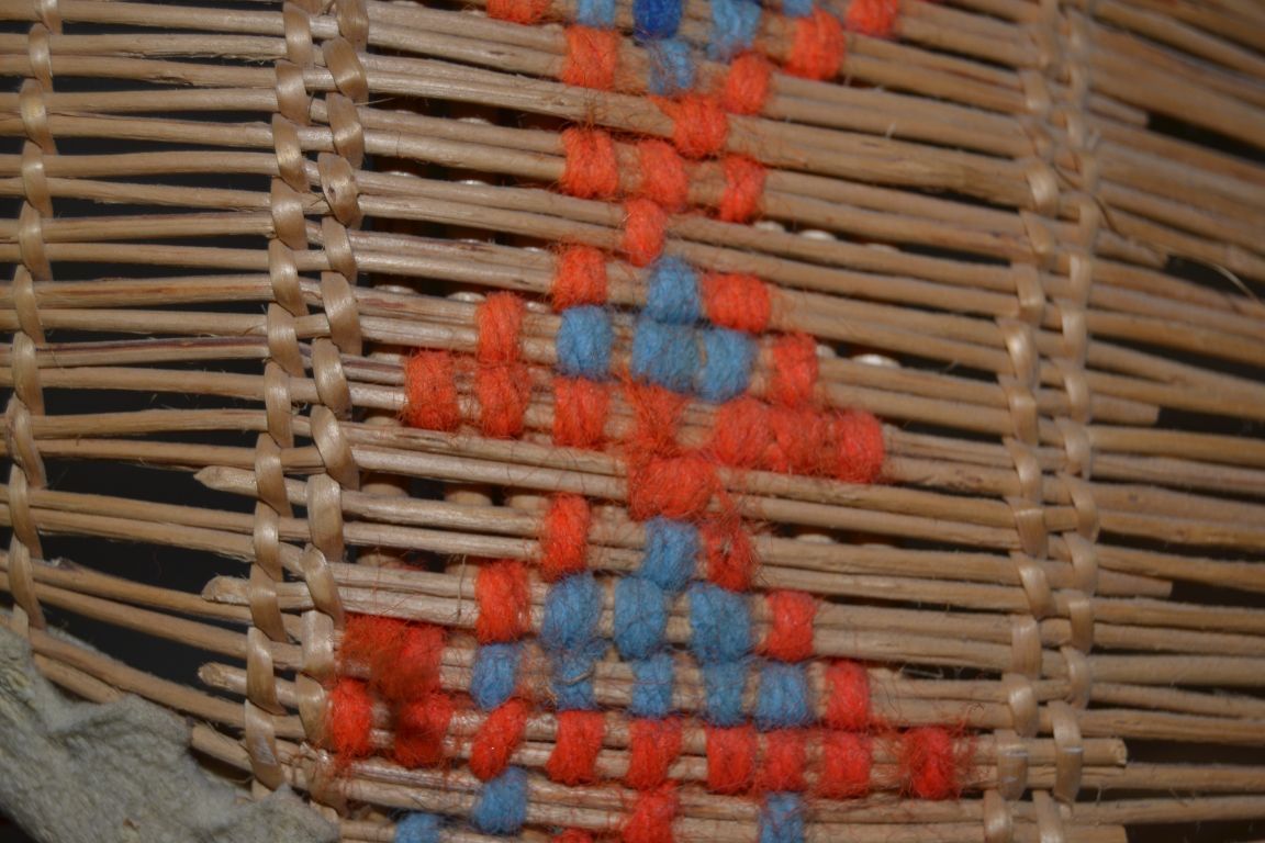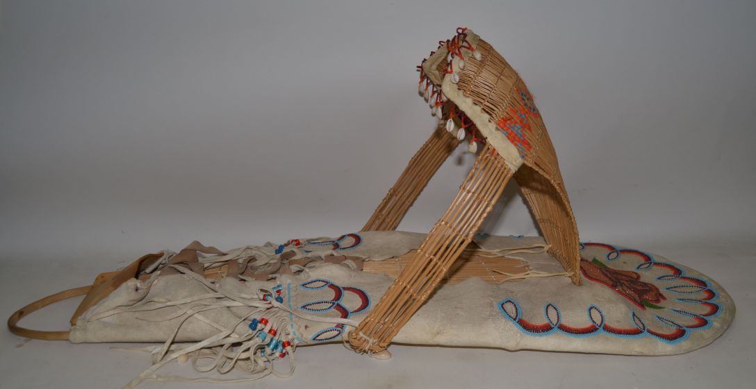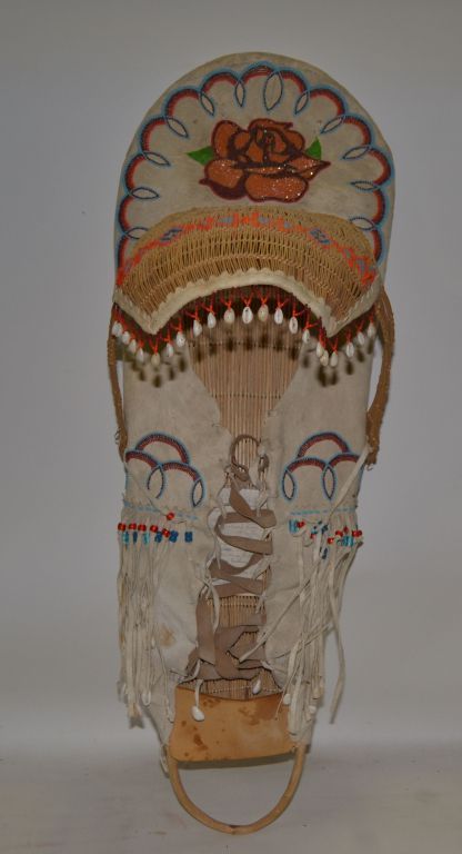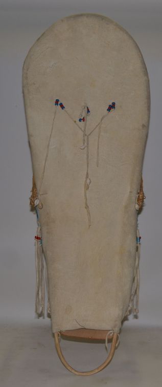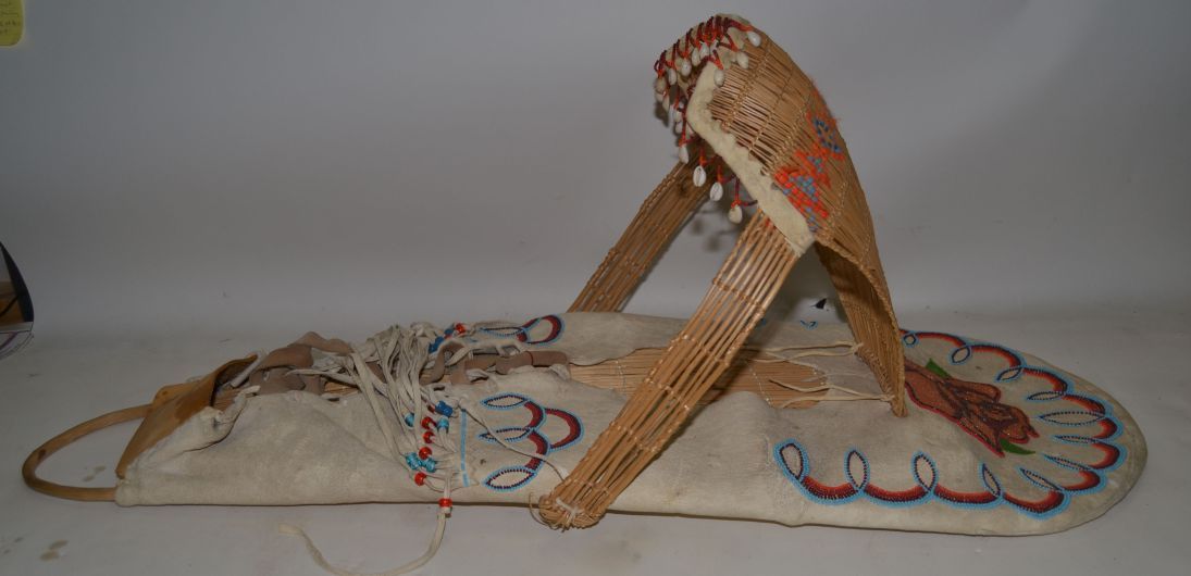 1980's traditional made hide over basketry with beaded design, made by Mary Teton, 39'' x 12'' x15''