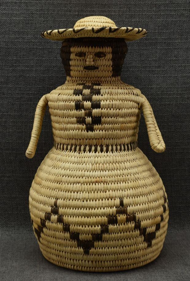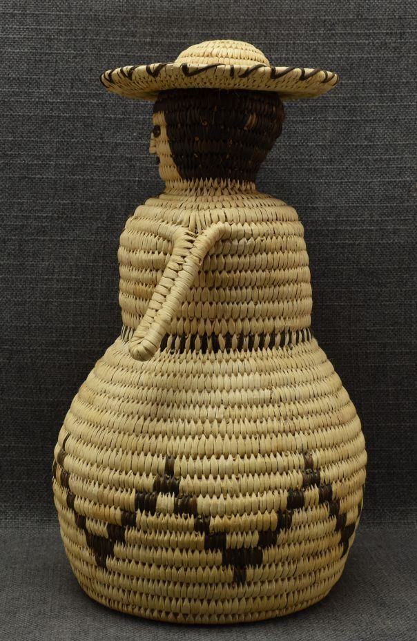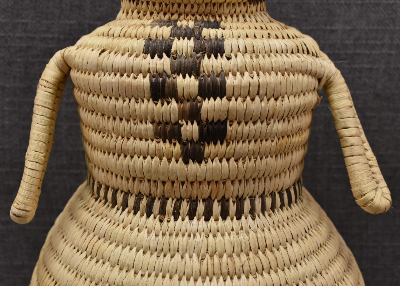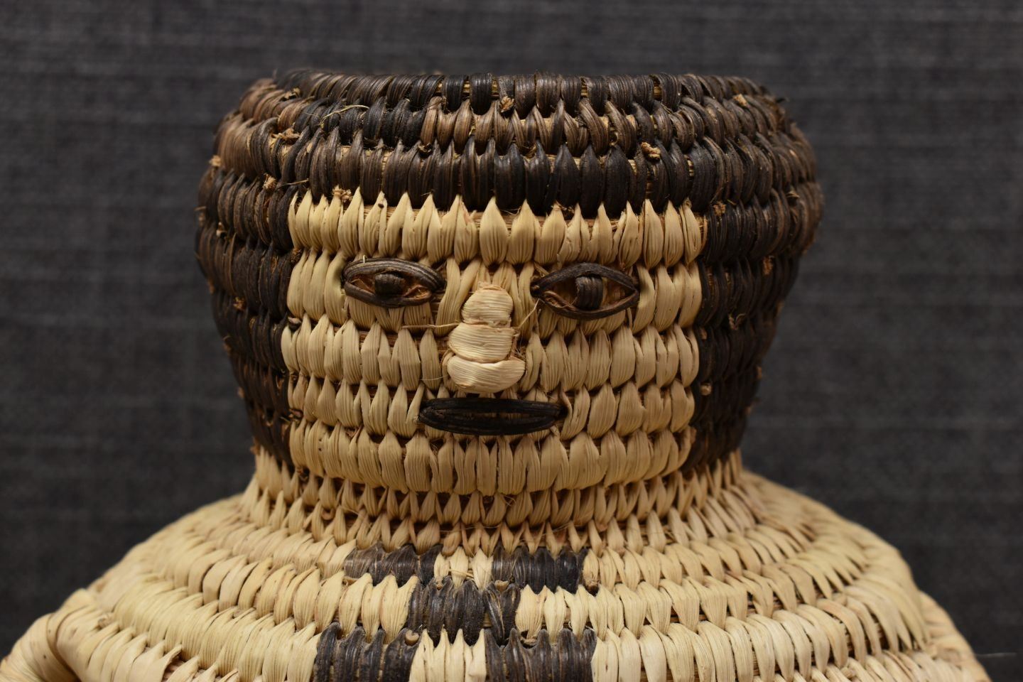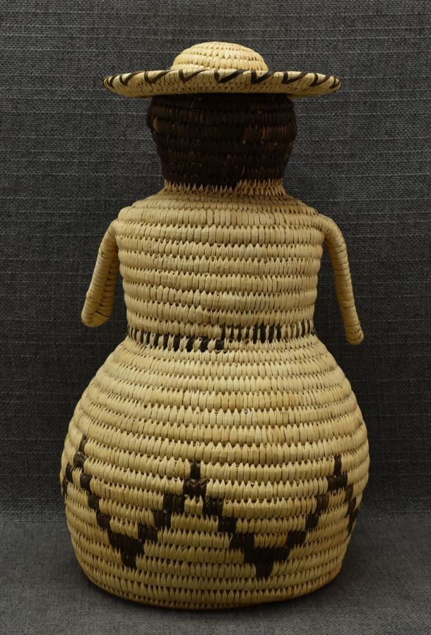 1970's Papago. Hand woven basketry female doll wearing a hat. Attributed to Marie Mondree. 14'' x 8''