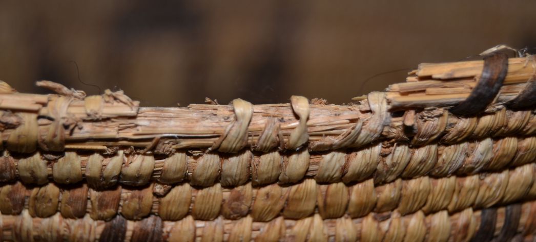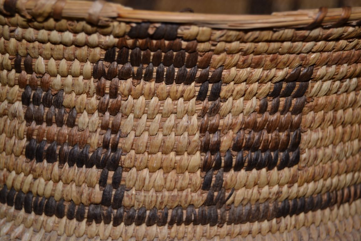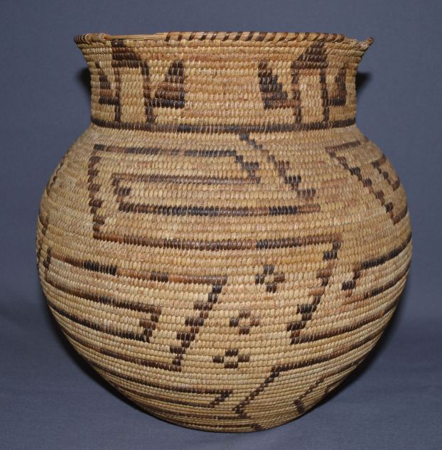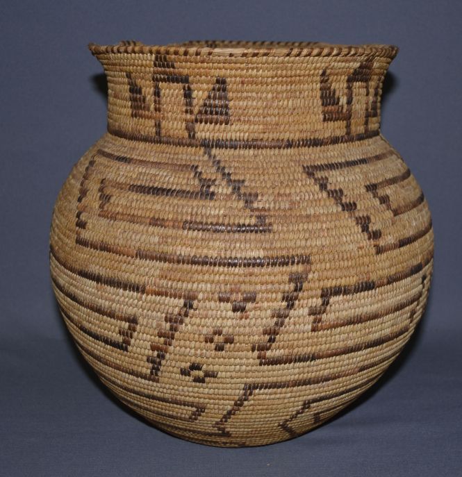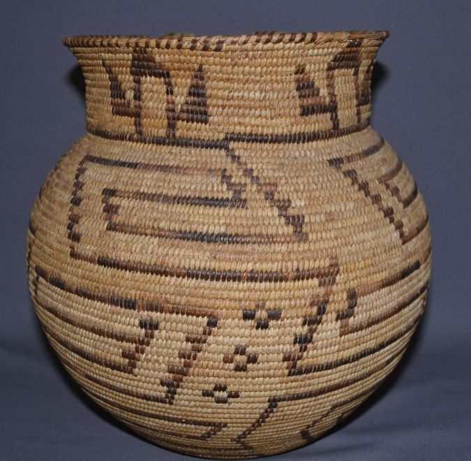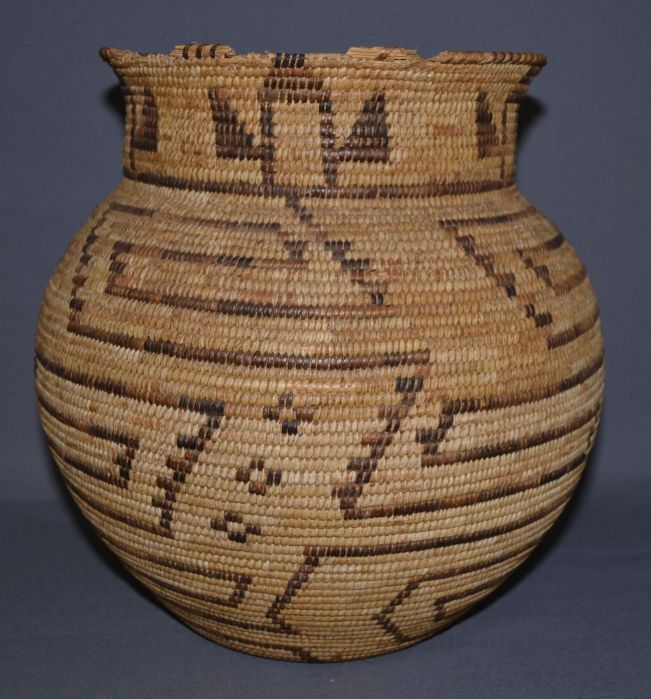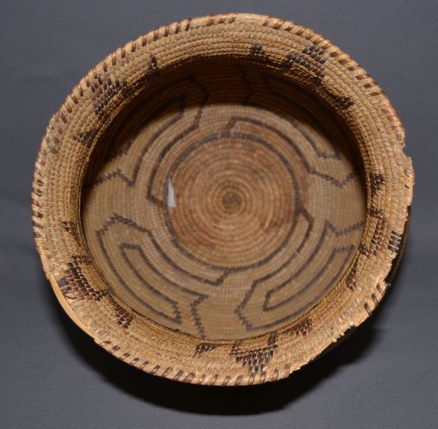 1940's busy geometric design of yucca and devils claw, has minor stitch loss and rim damage, 13" x 12"