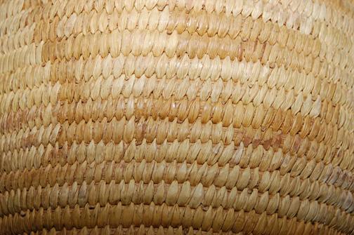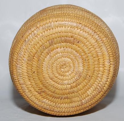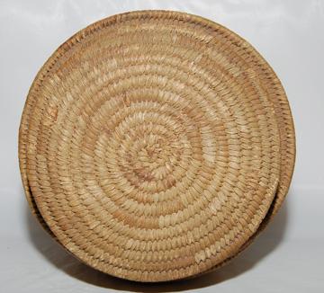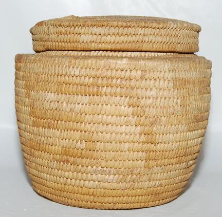 1960'S lidded, faint design, woven of yucca, 6.5" x 7"