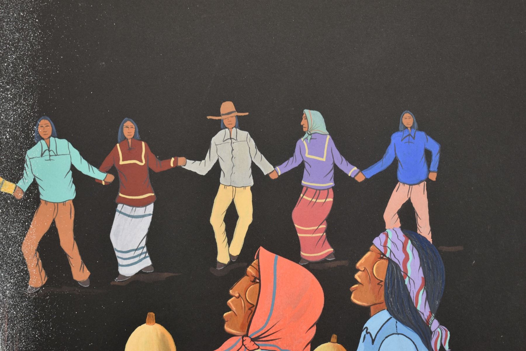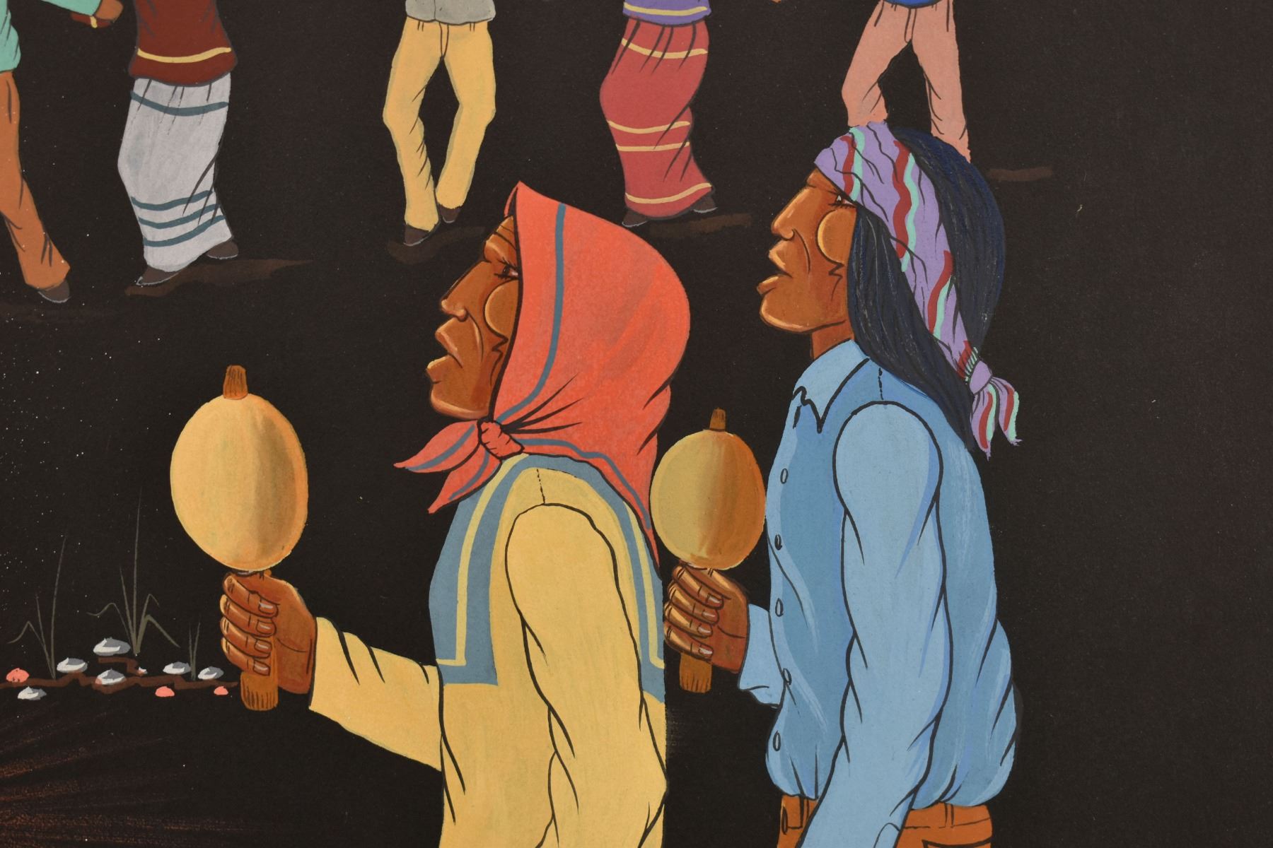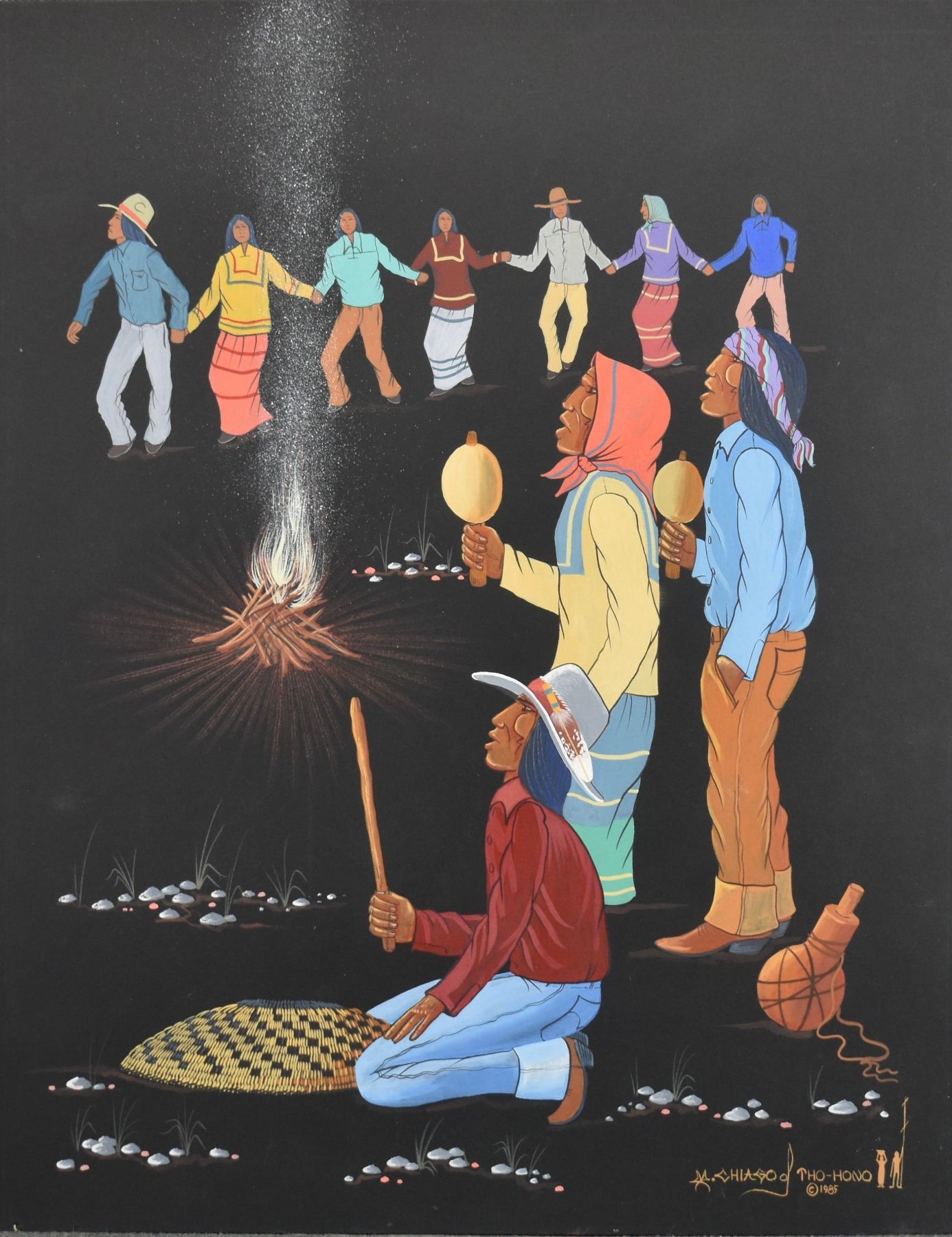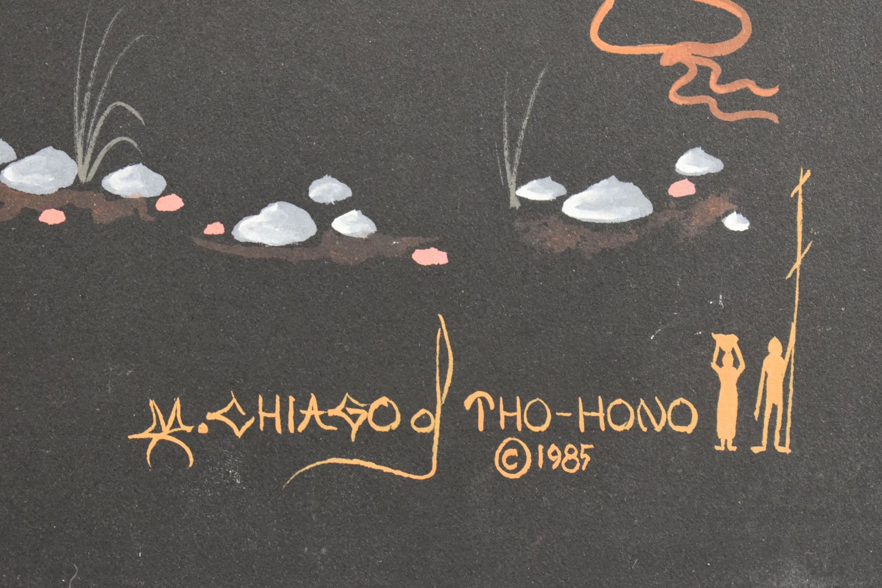 1985 Papago. Original on paper depicting ceremonial dance. Signed M. Chiago. 20'' x 16''