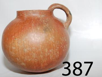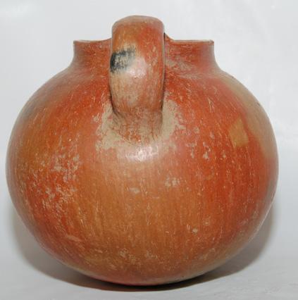 ca. PREHIST. red plain ware, found condition, small fire clouds, 5.5” x 5.5”.