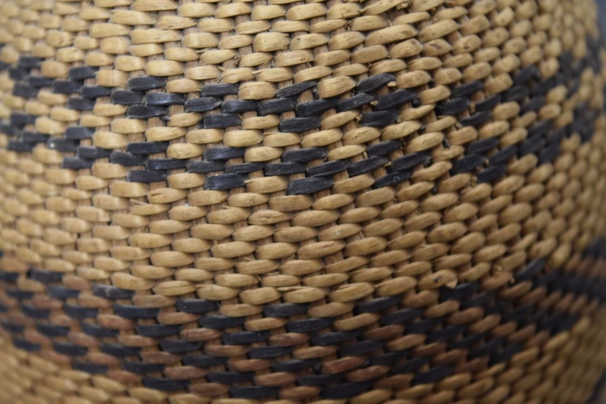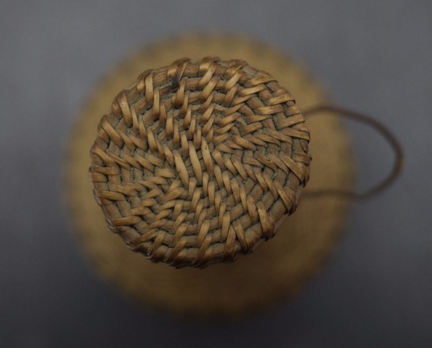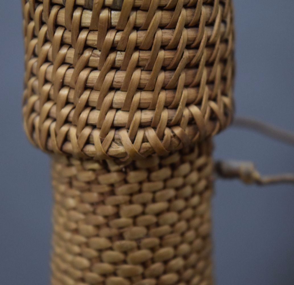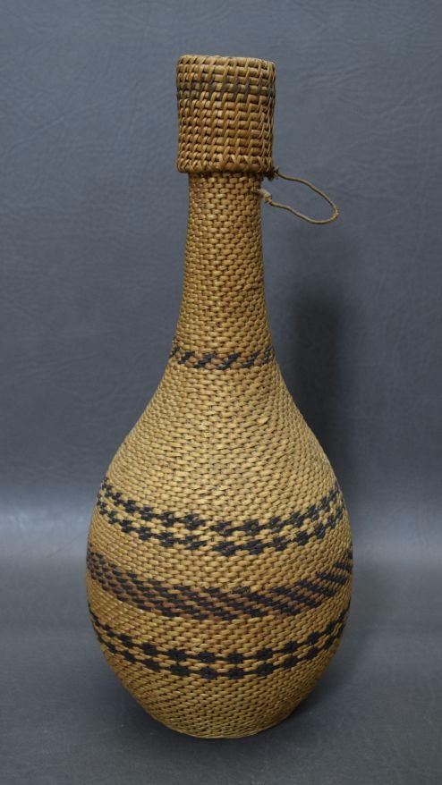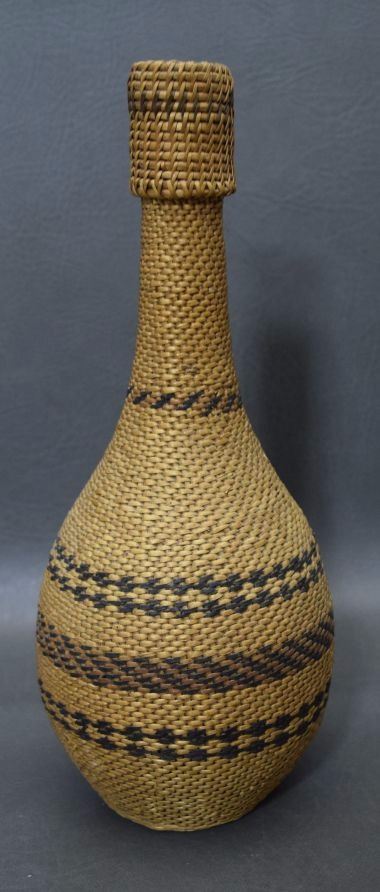1930's banded design basketry covered wine bottle. 12'' x 5''