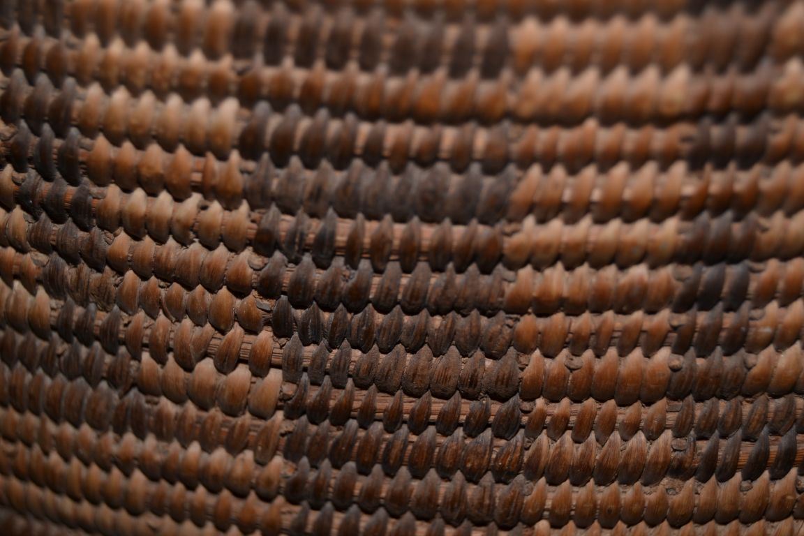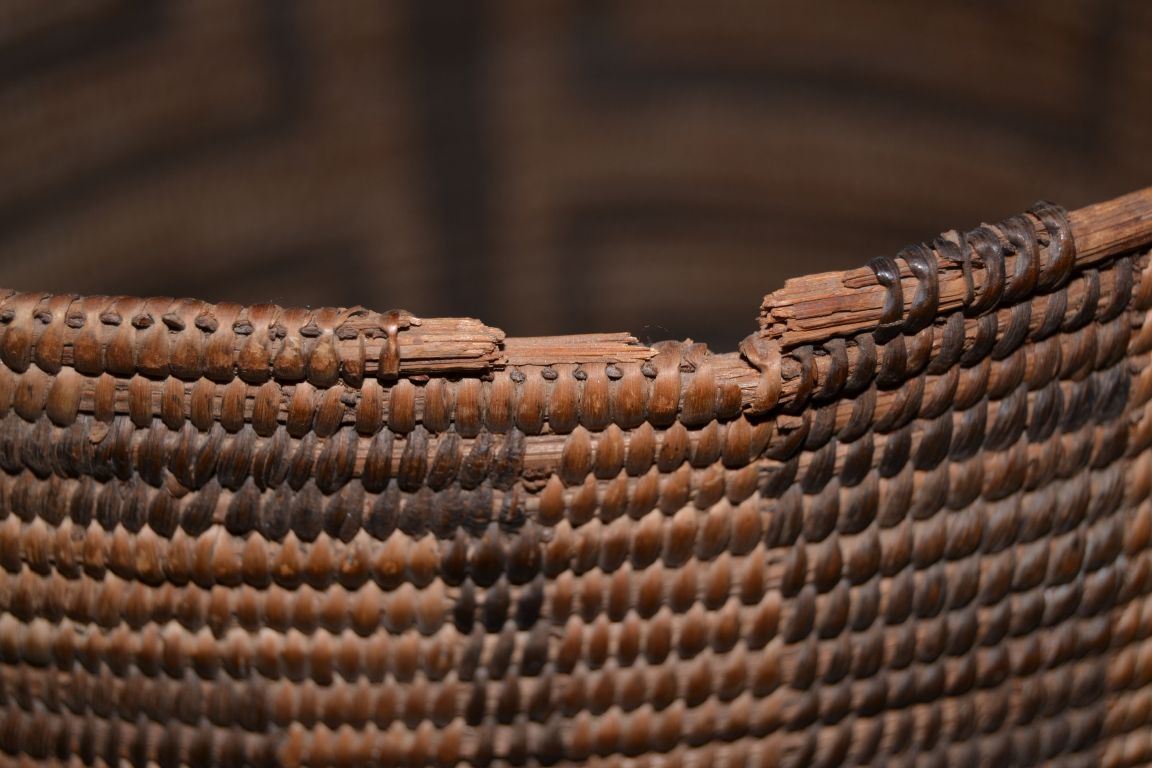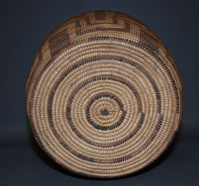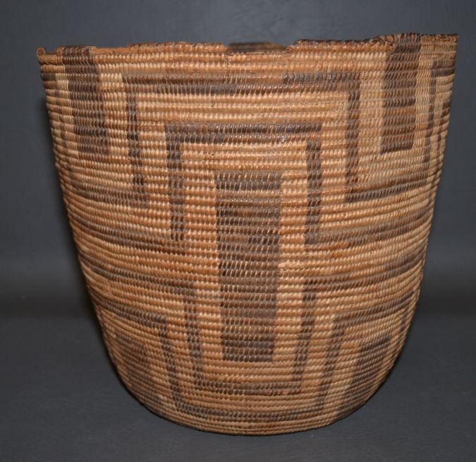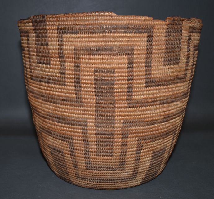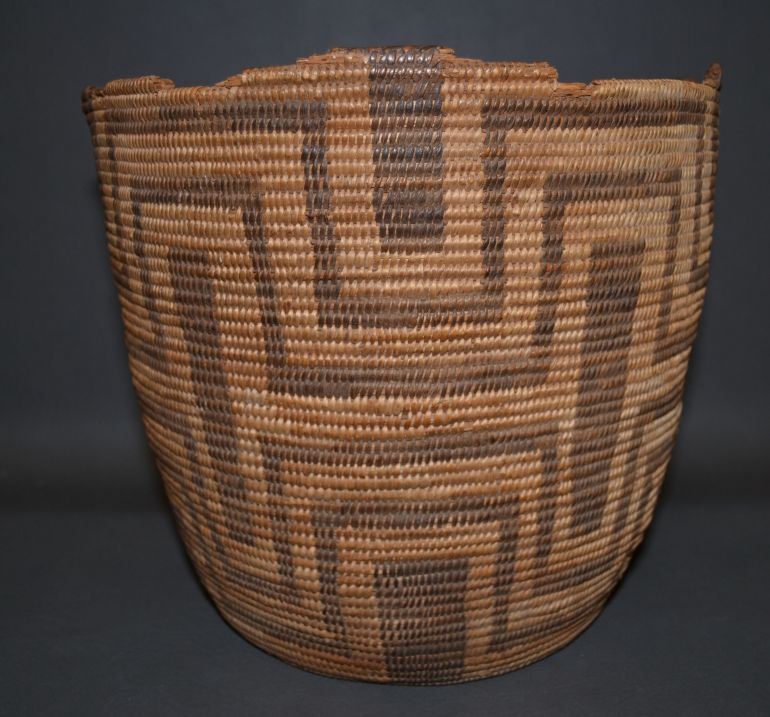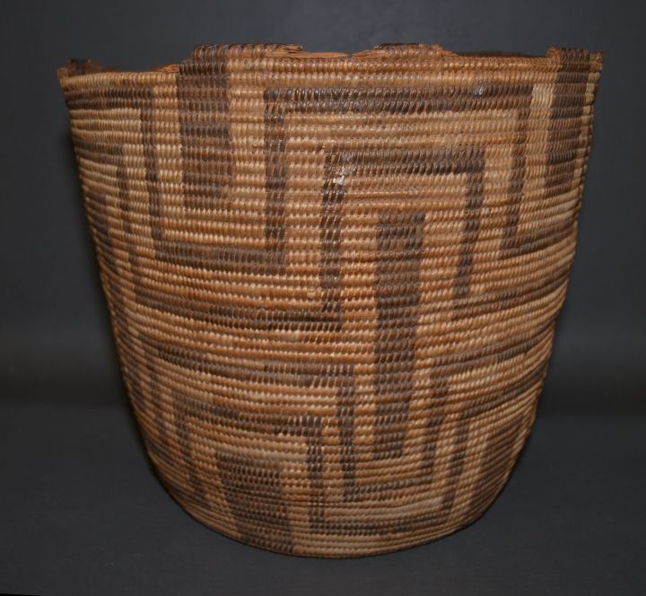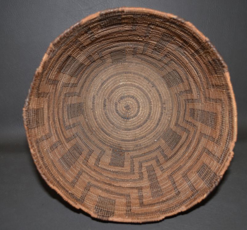 1940's hand woven willow and devils claw cross and geometric design missing pieces on rim and stitches loss 10" x 11"
