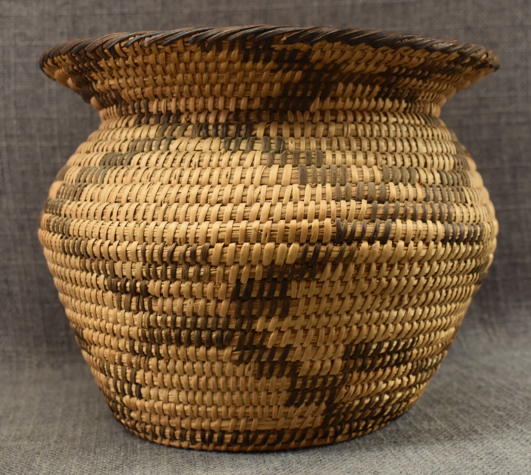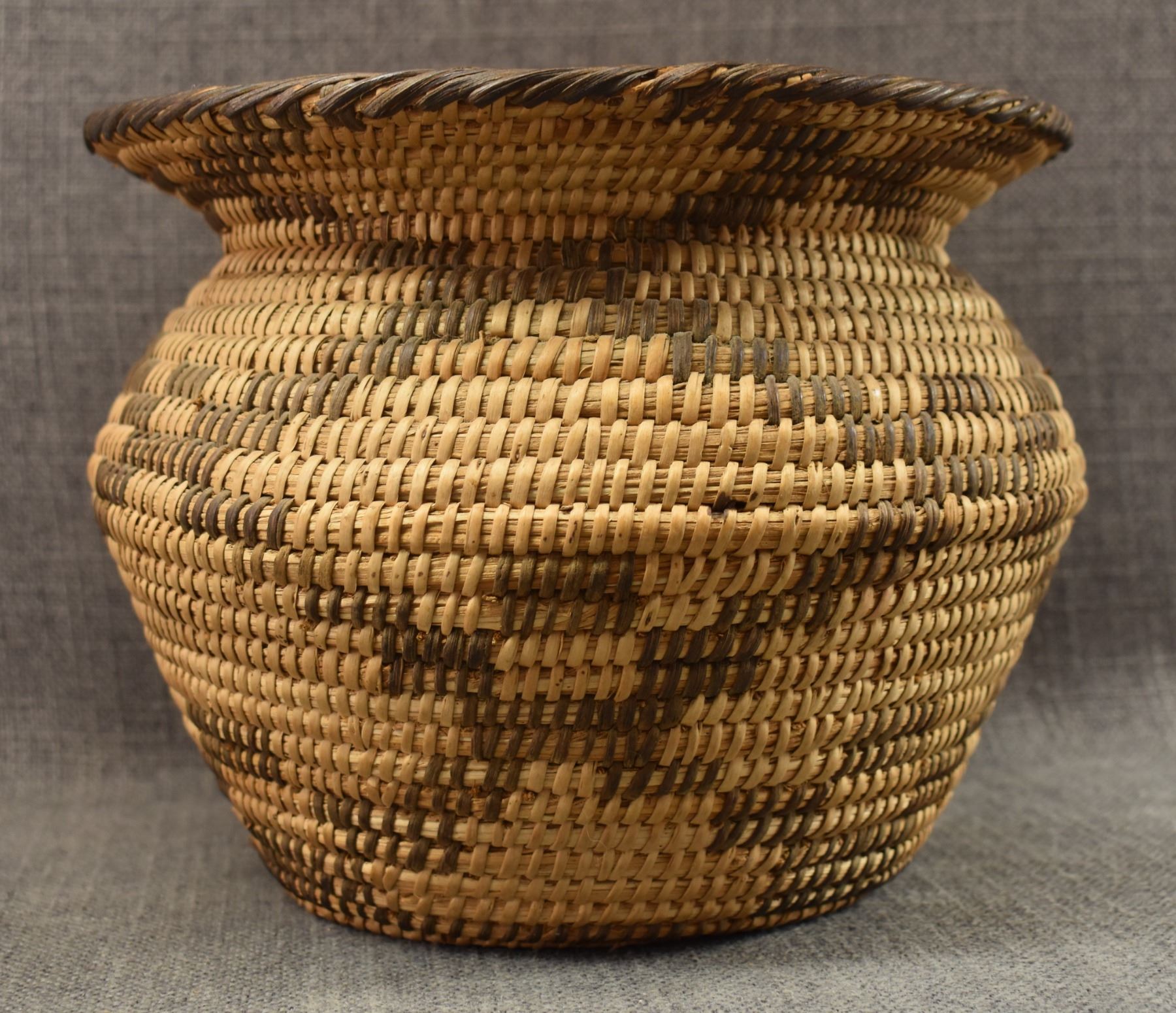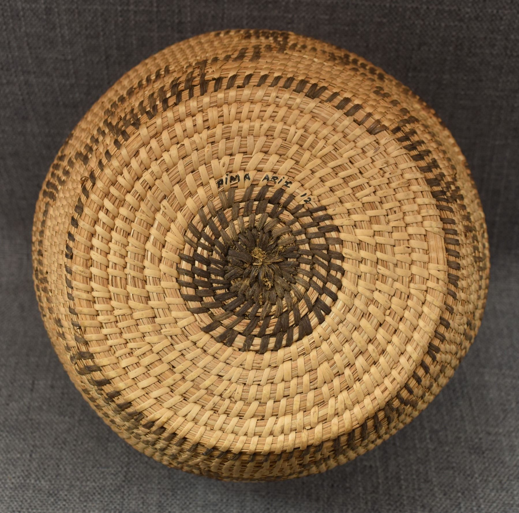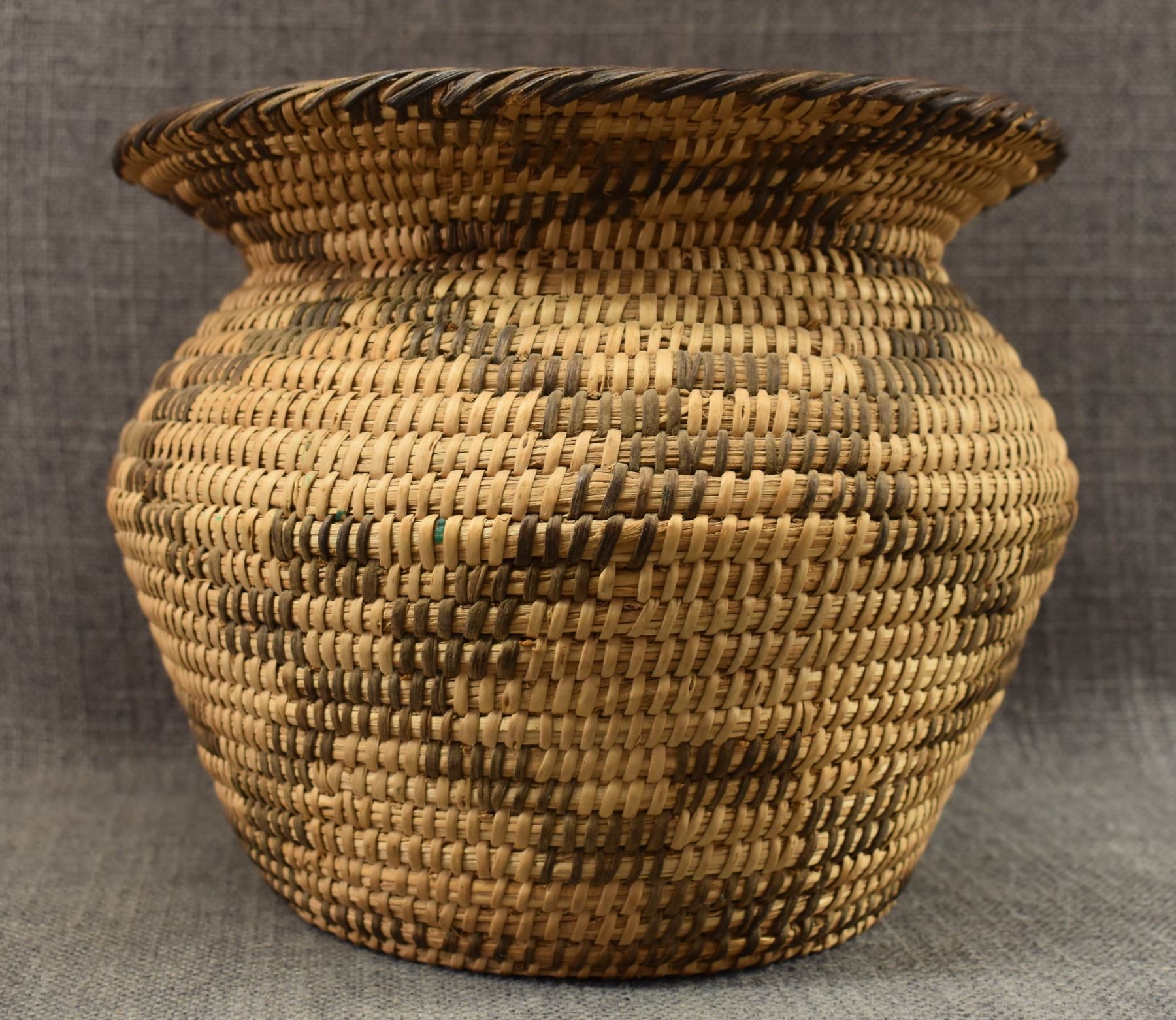 1960's Pima. Hand woven lazy stitch design basketry olla. 7'' x 9''