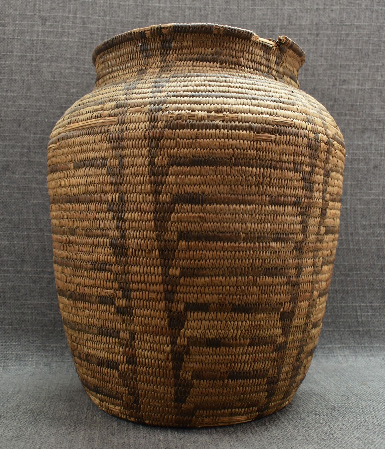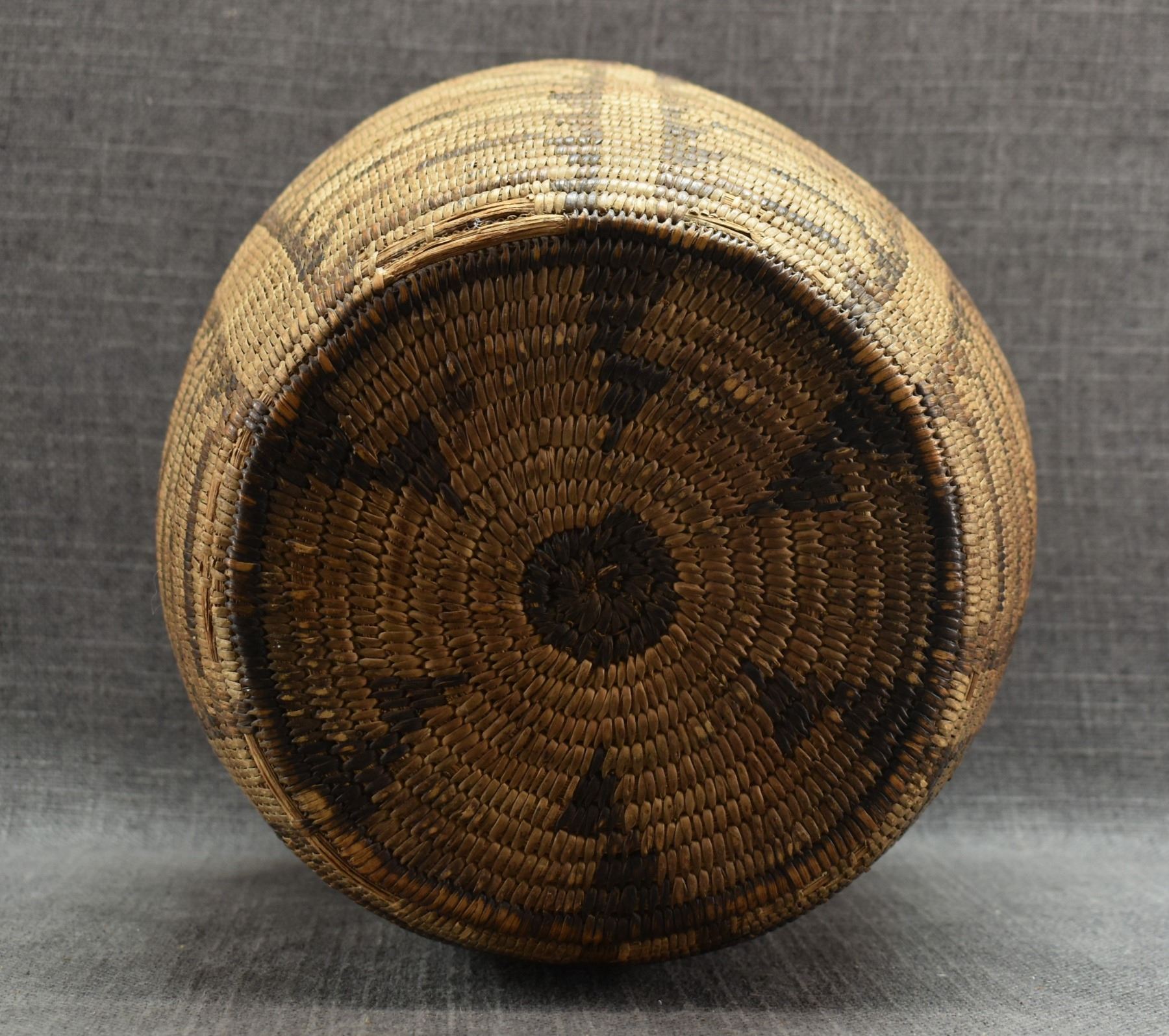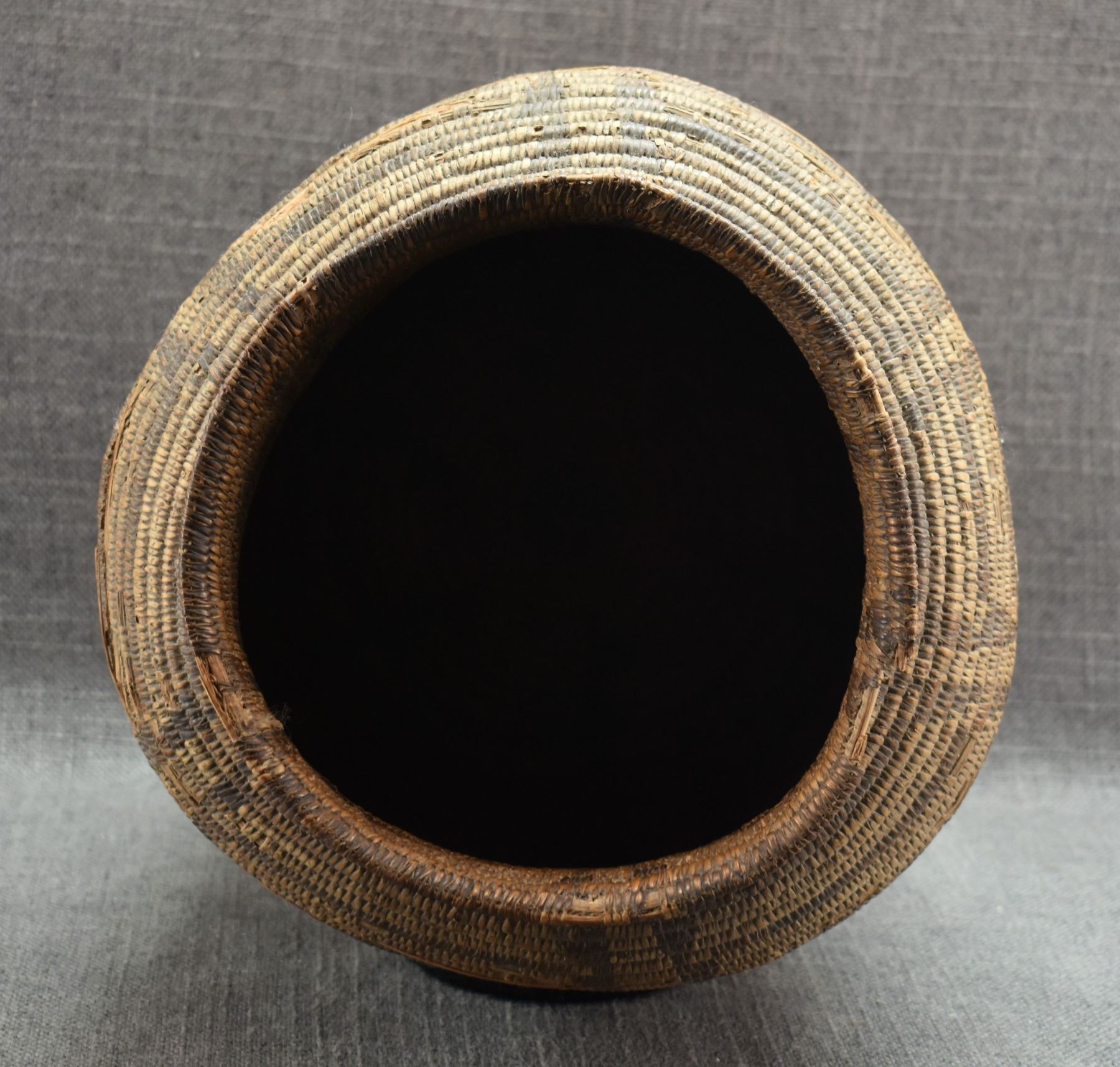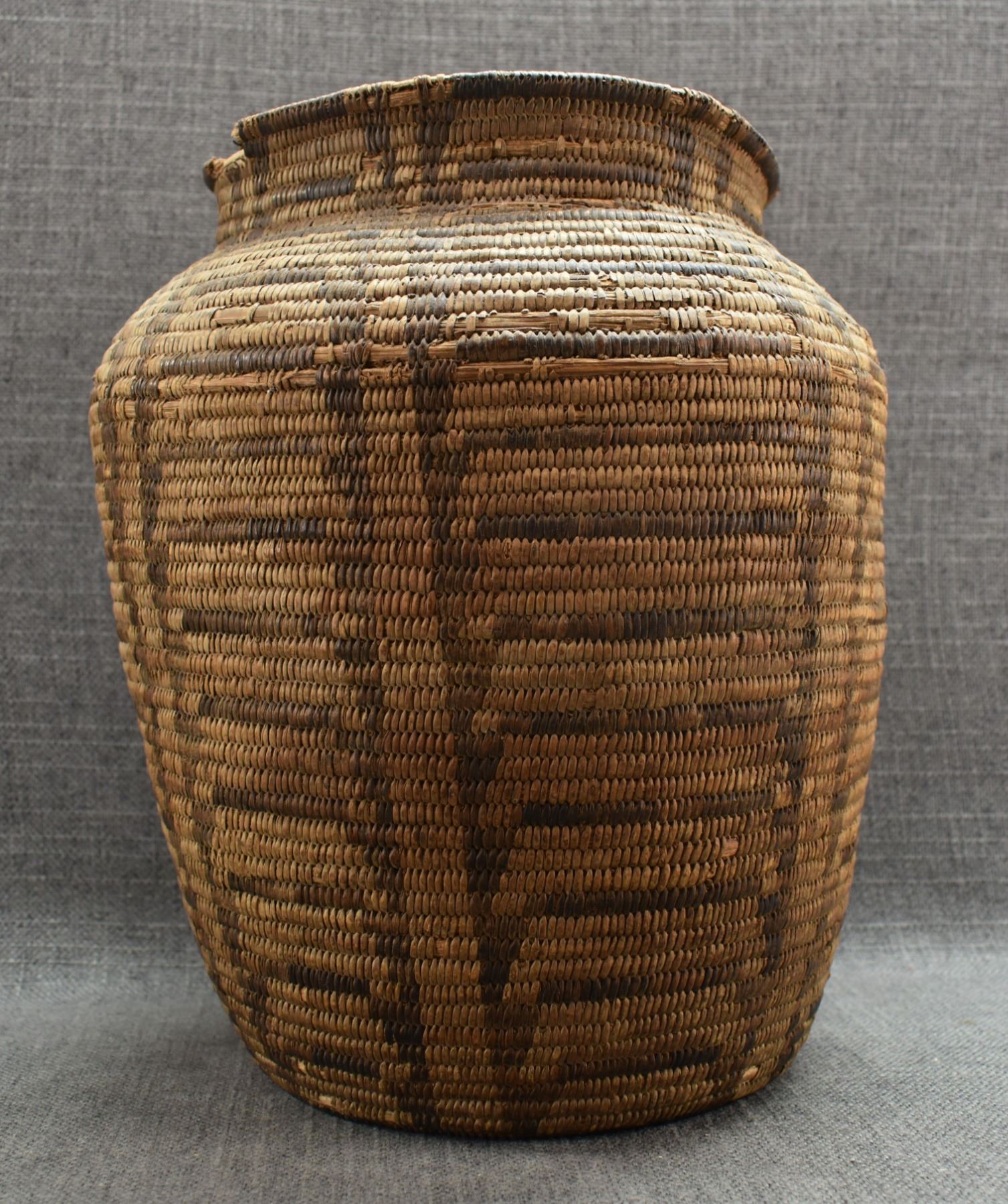 1900's Pima hand woven willow and devils claw basketry olla. Has stich loss and breaks. 12" x 9"