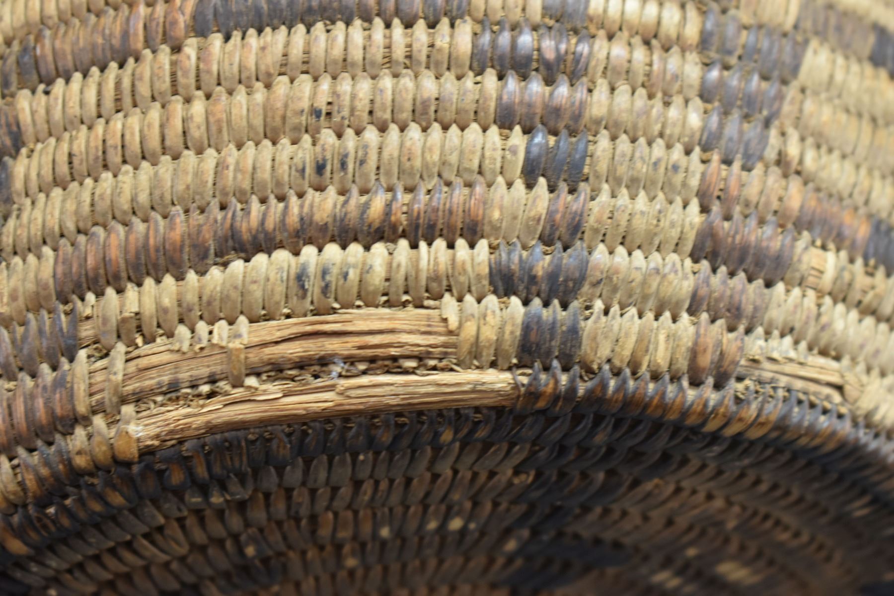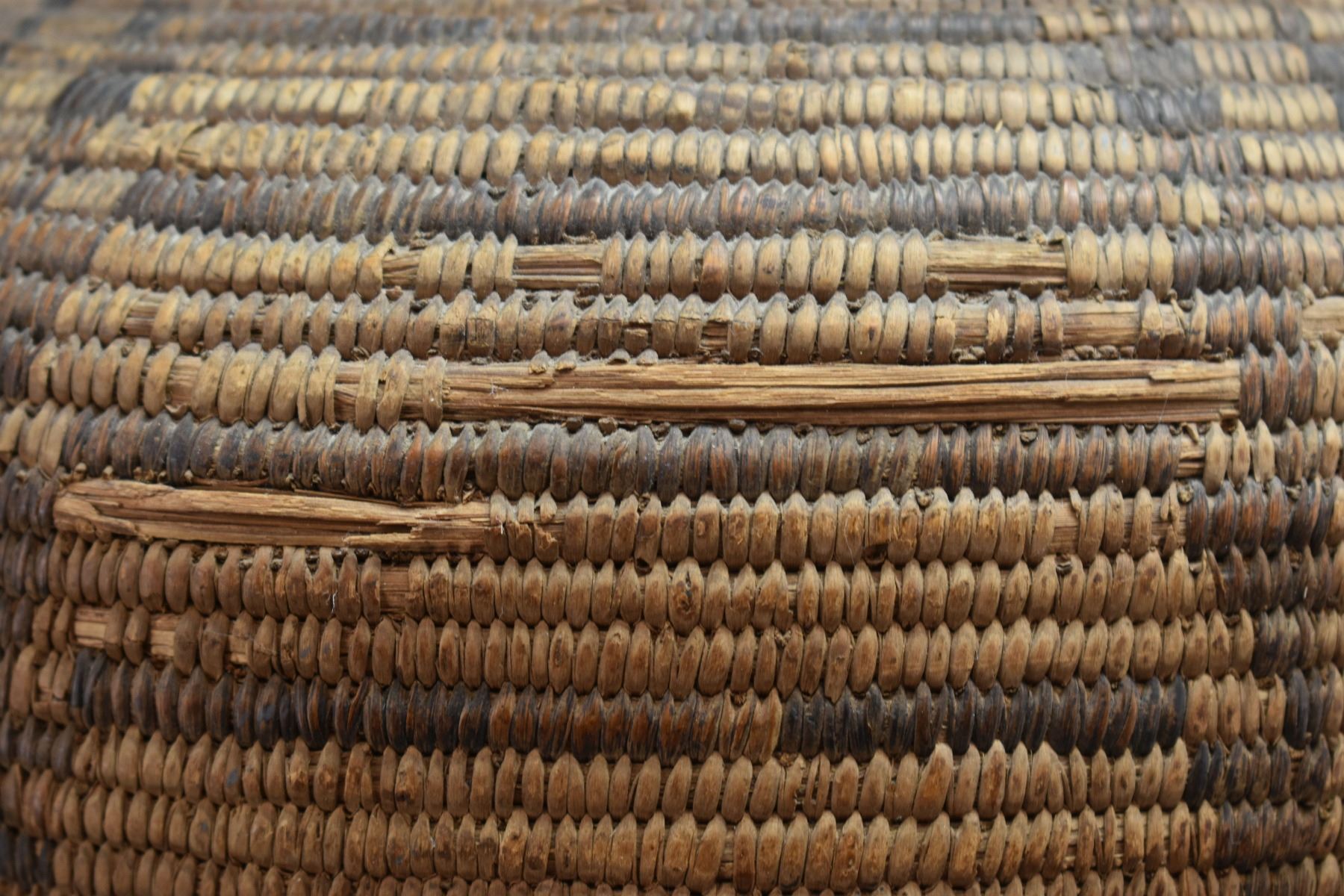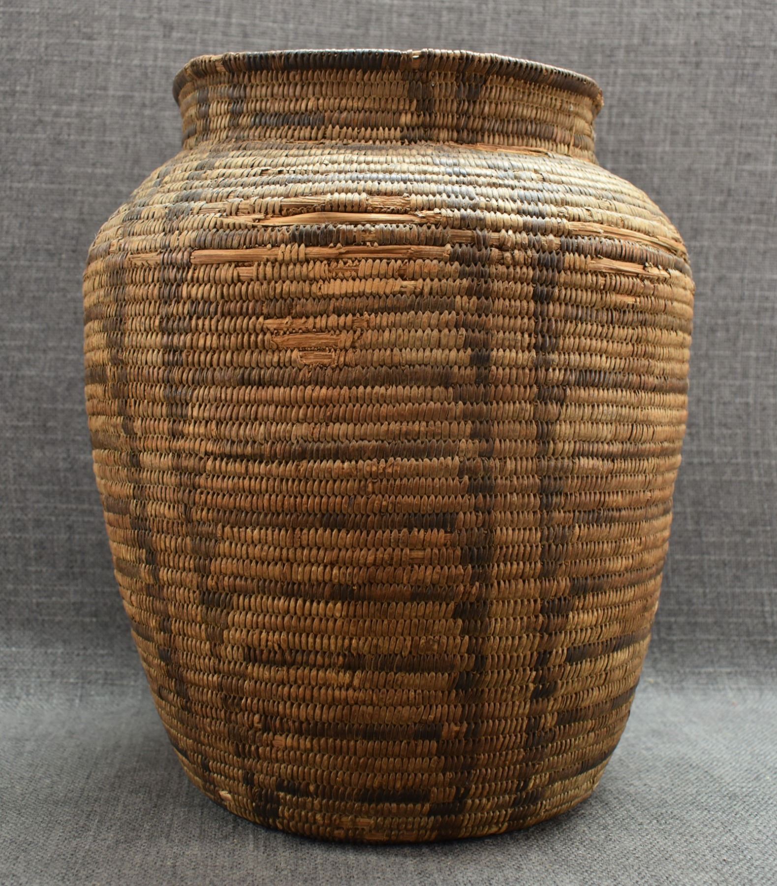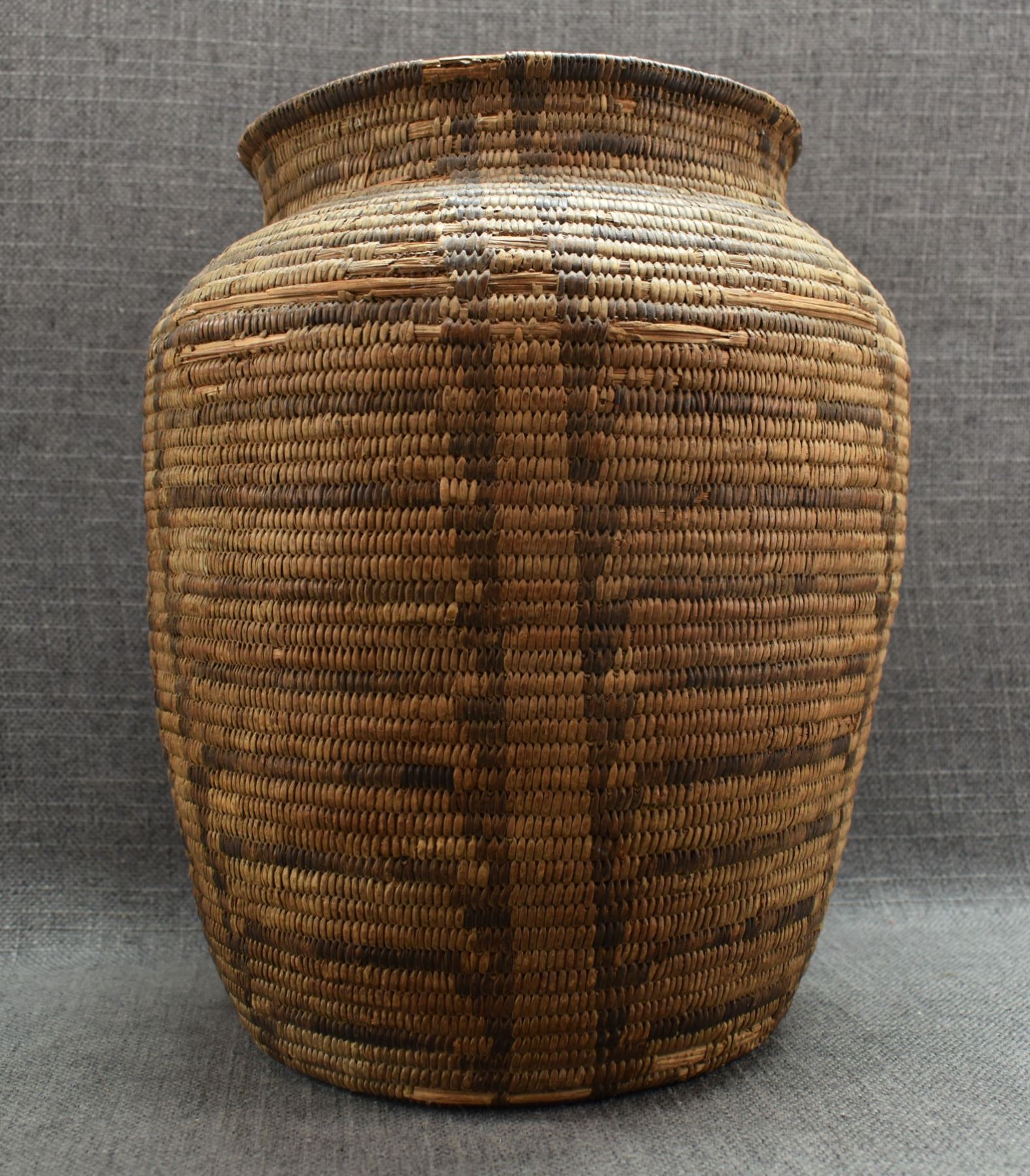 1900's Pima hand woven willow and devils claw basketry olla. Has stich loss and breaks. 12" x 9"