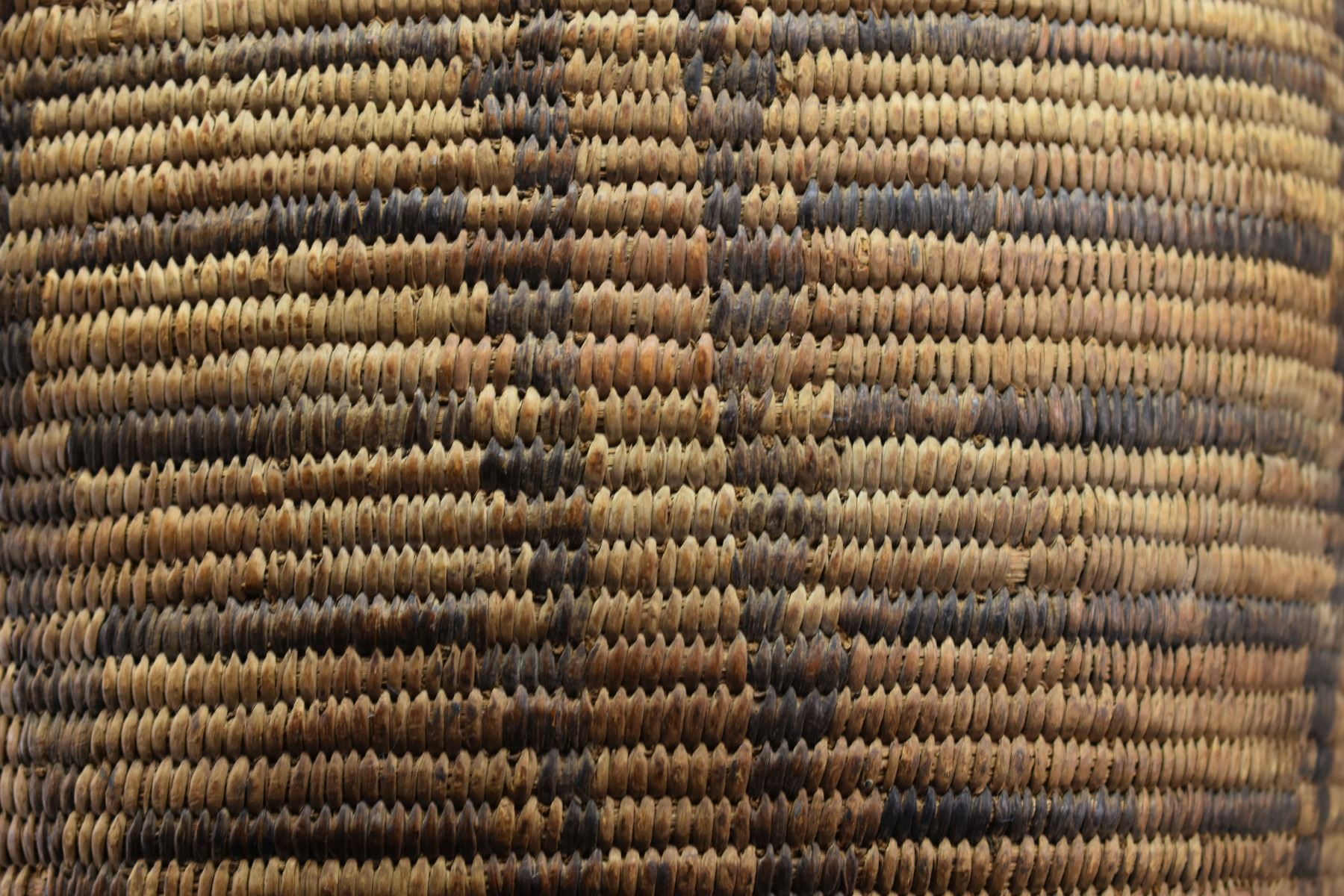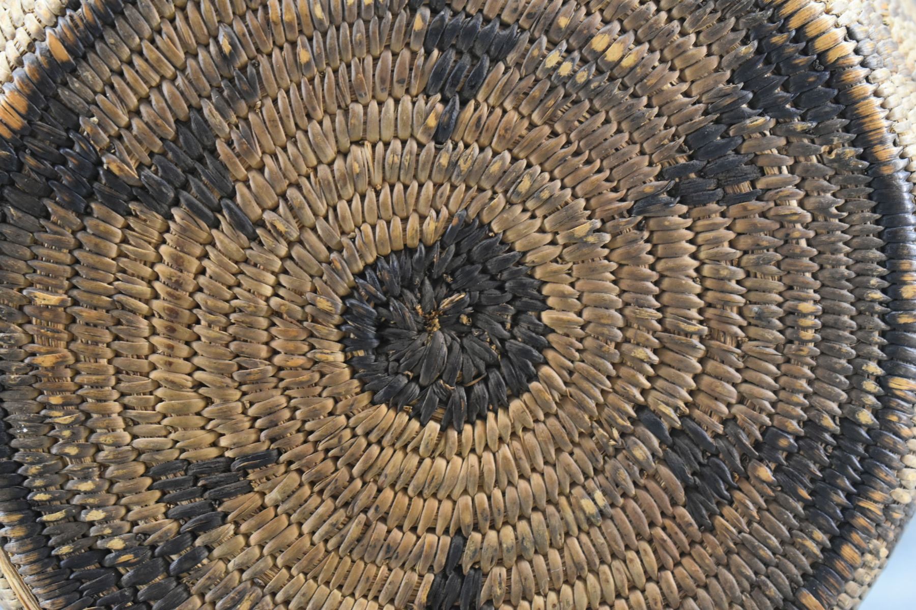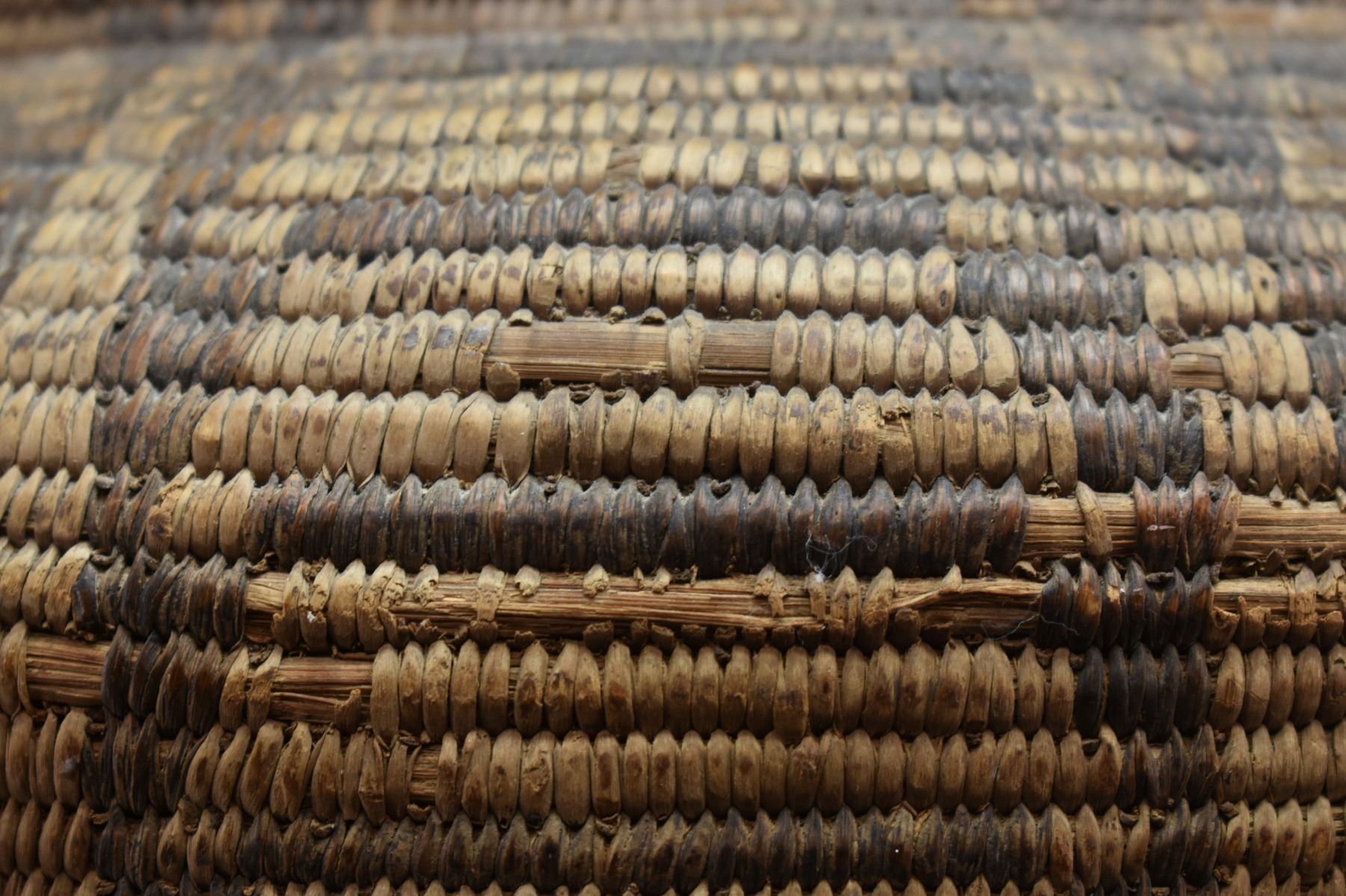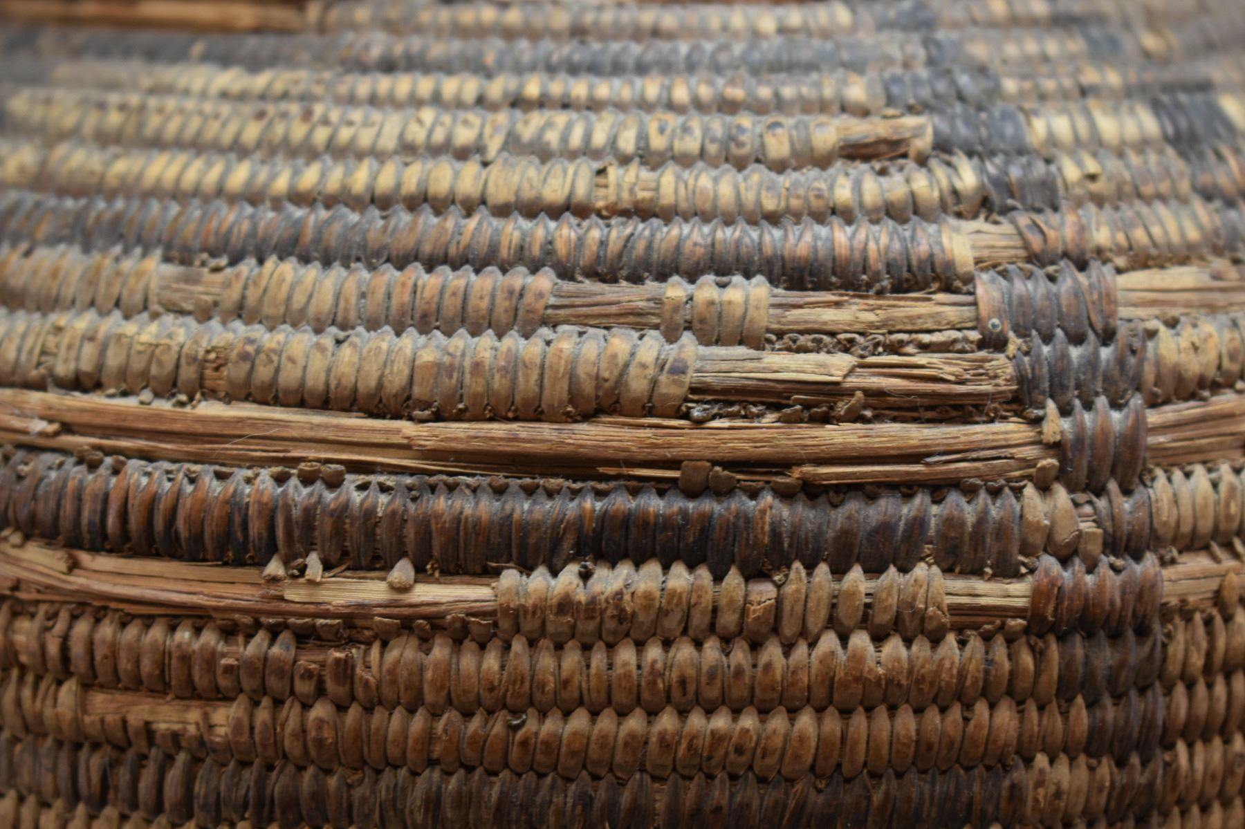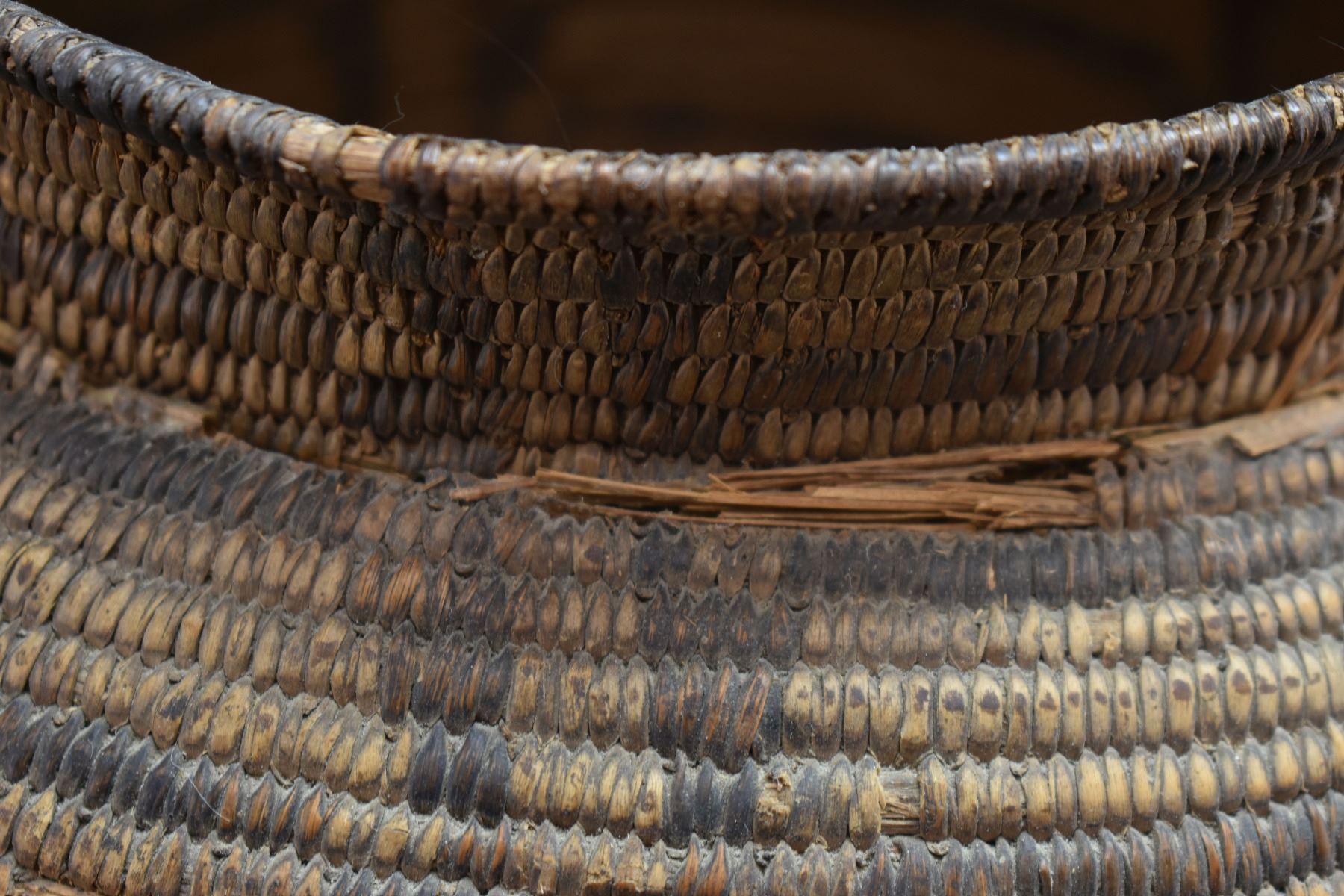 1900's Pima hand woven willow and devils claw basketry olla. Has stich loss and breaks. 12" x 9"