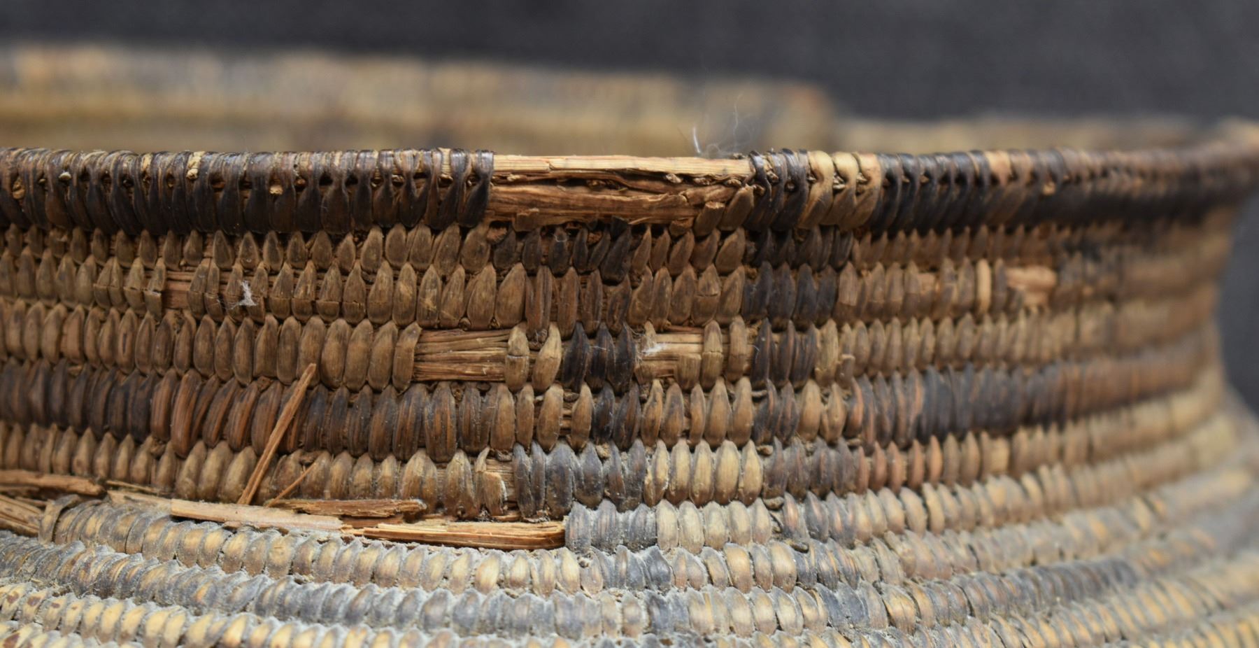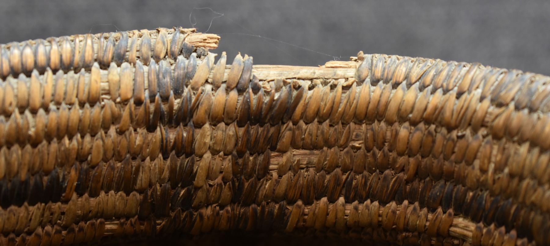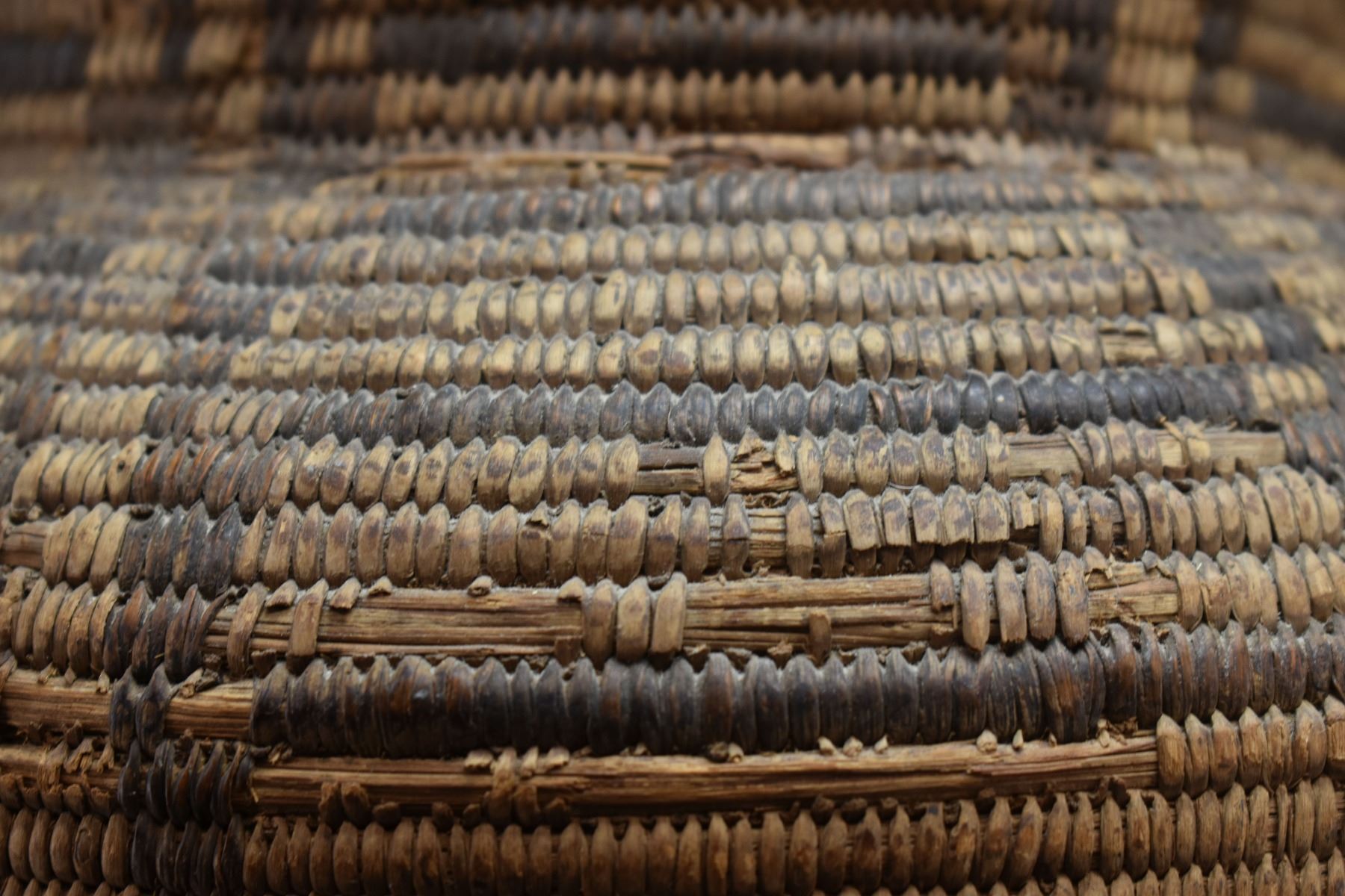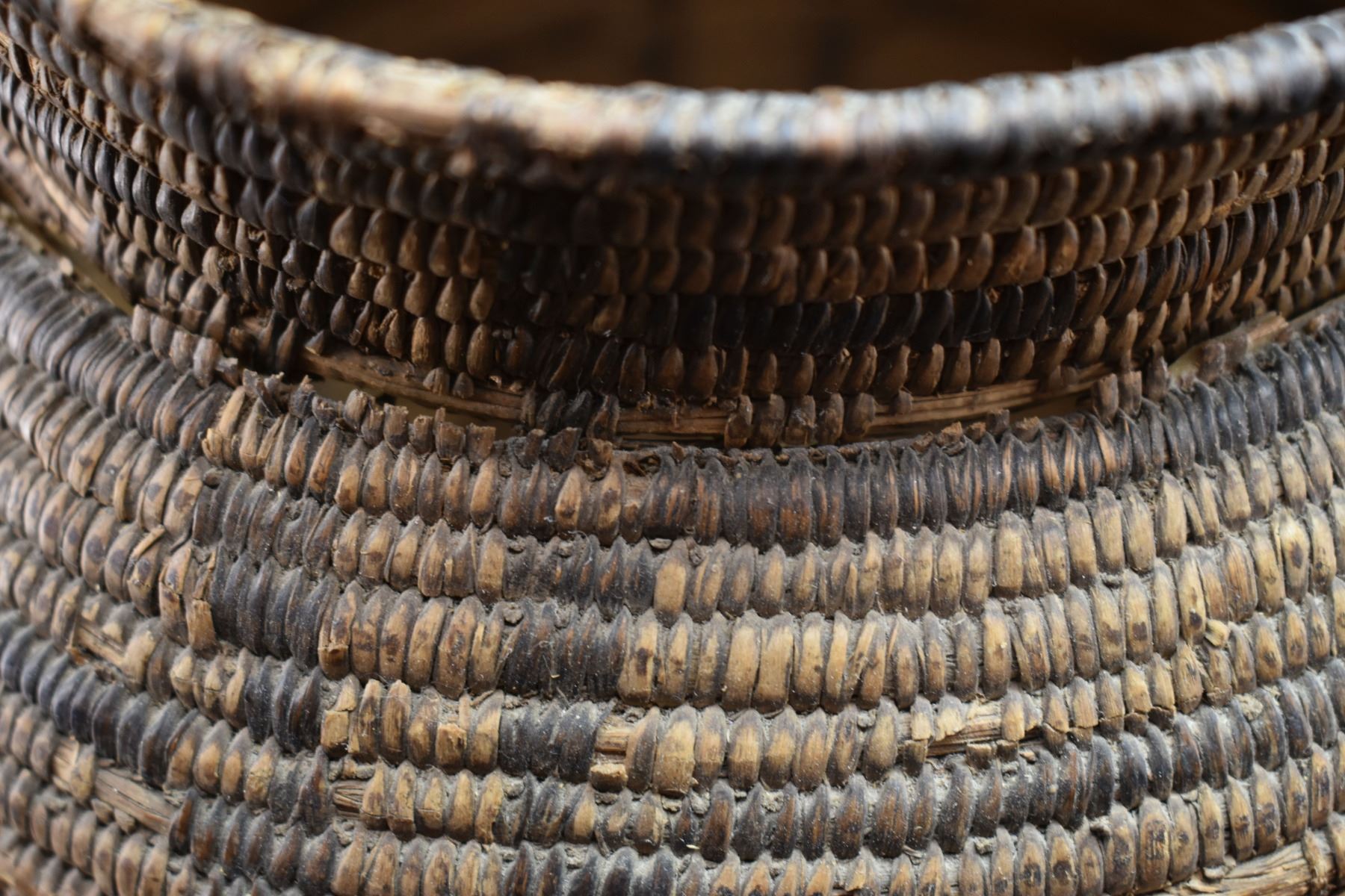 1900's Pima hand woven willow and devils claw basketry olla. Has stich loss and breaks. 12" x 9"