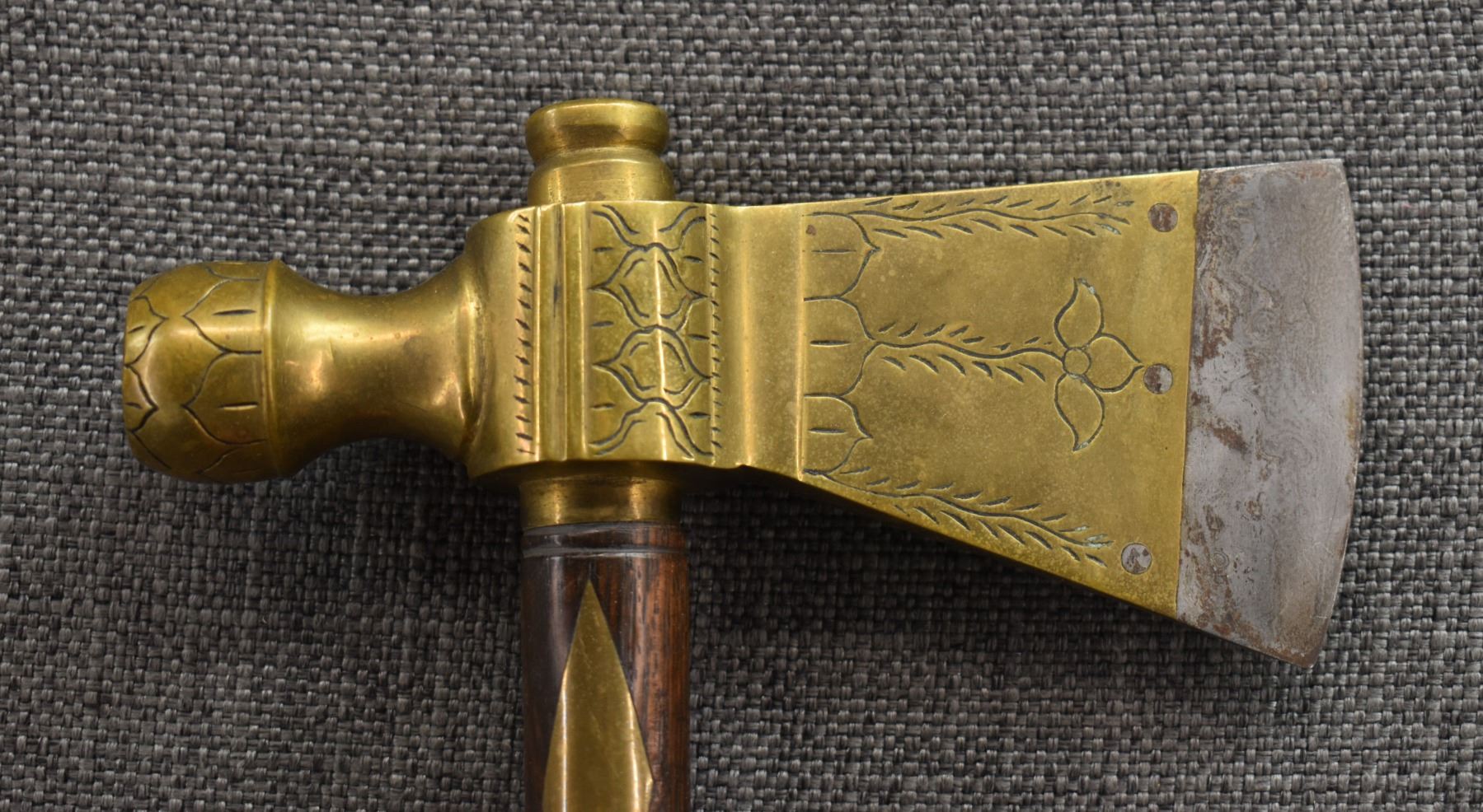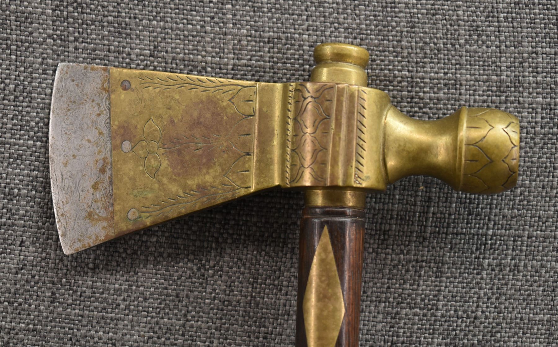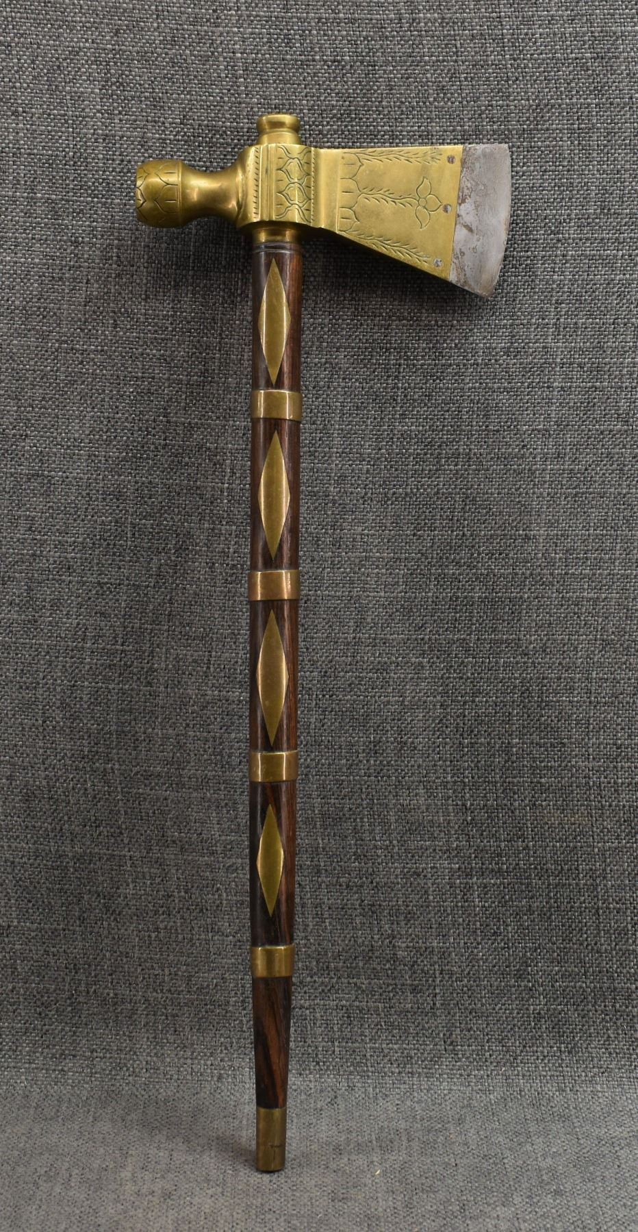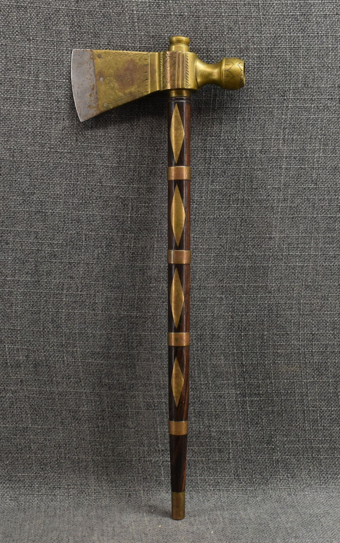 20th century, wooden handle/stem with brass rings and diamond inlaid handle with brass pipe tomahawk head with engraved design and Damascus blade 16.25" x 6"
