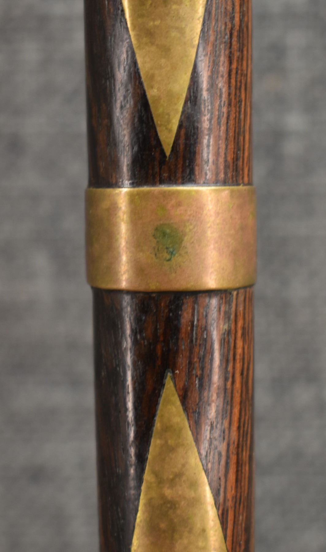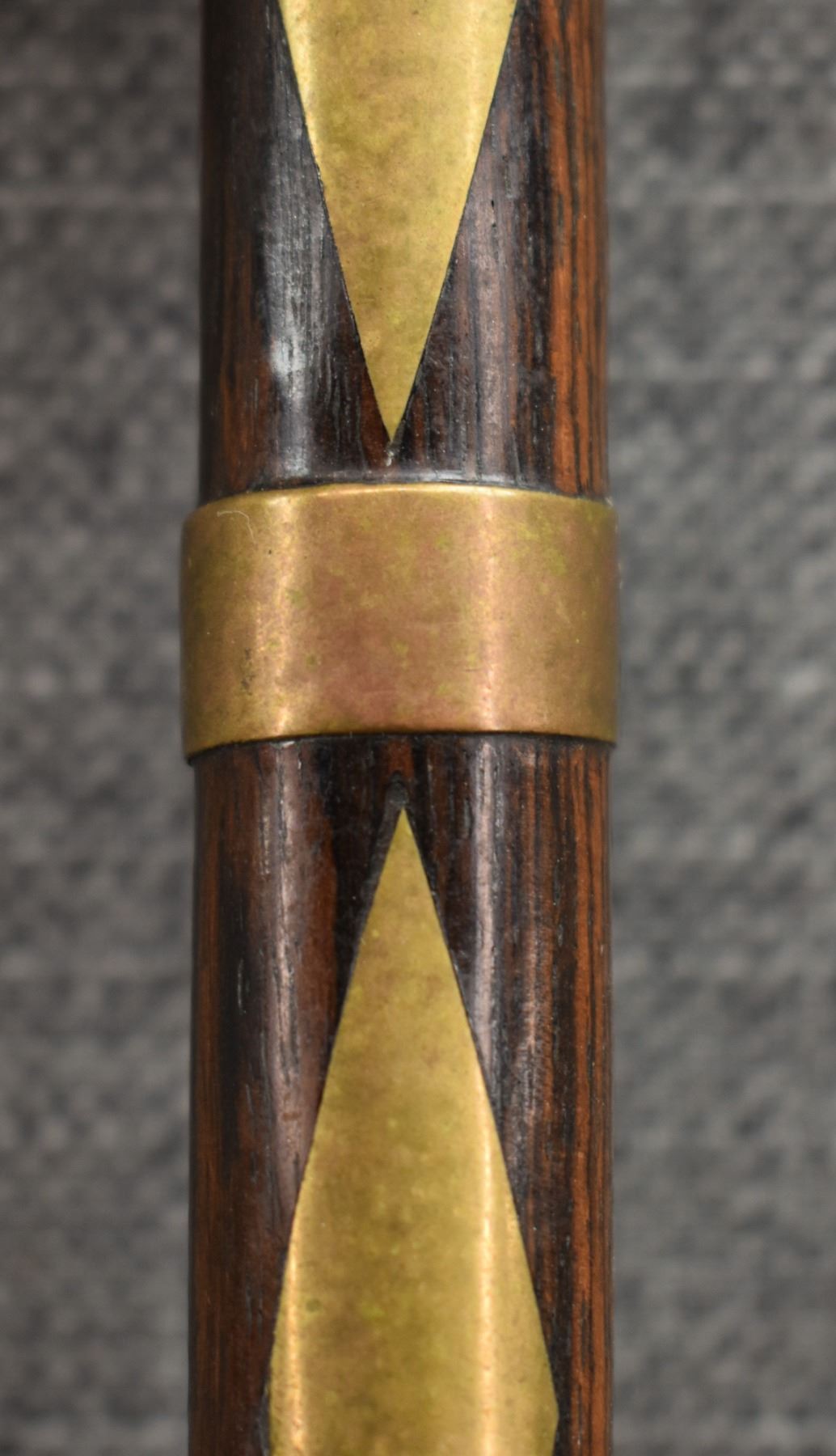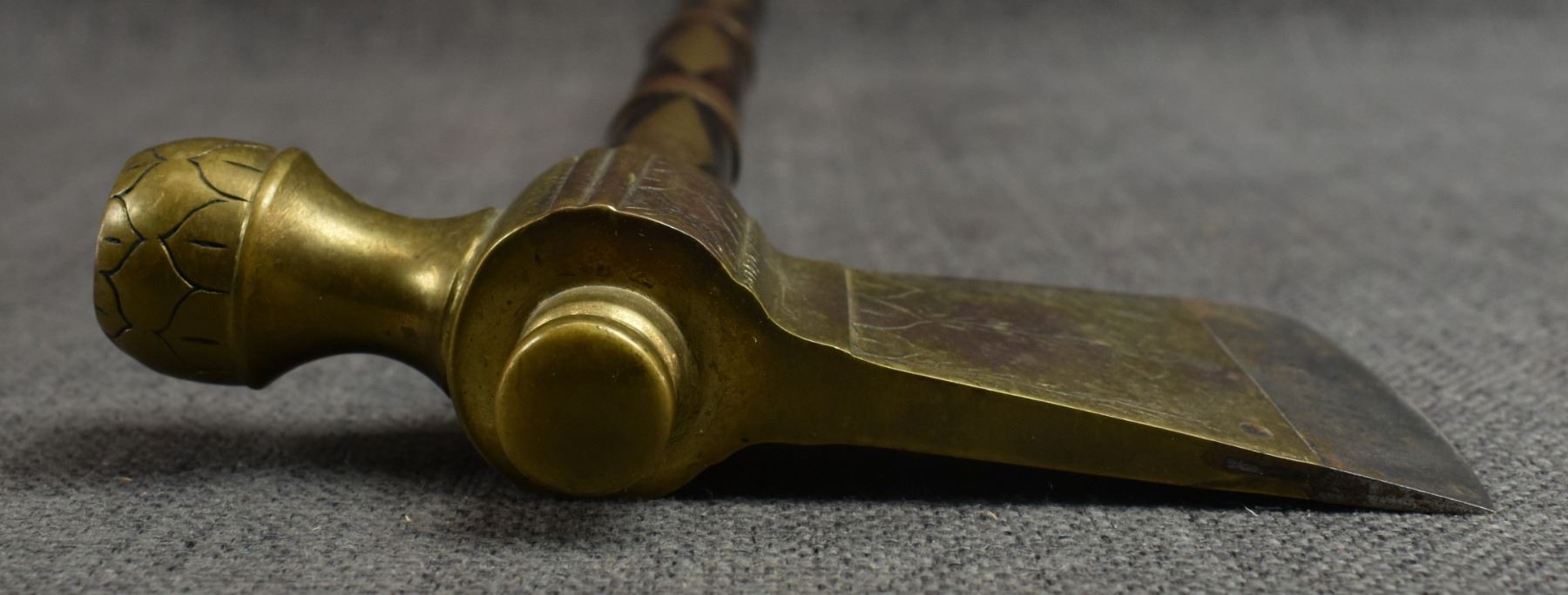 20th century, wooden handle/stem with brass rings and diamond inlaid handle with brass pipe tomahawk head with engraved design and Damascus blade 16.25" x 6"